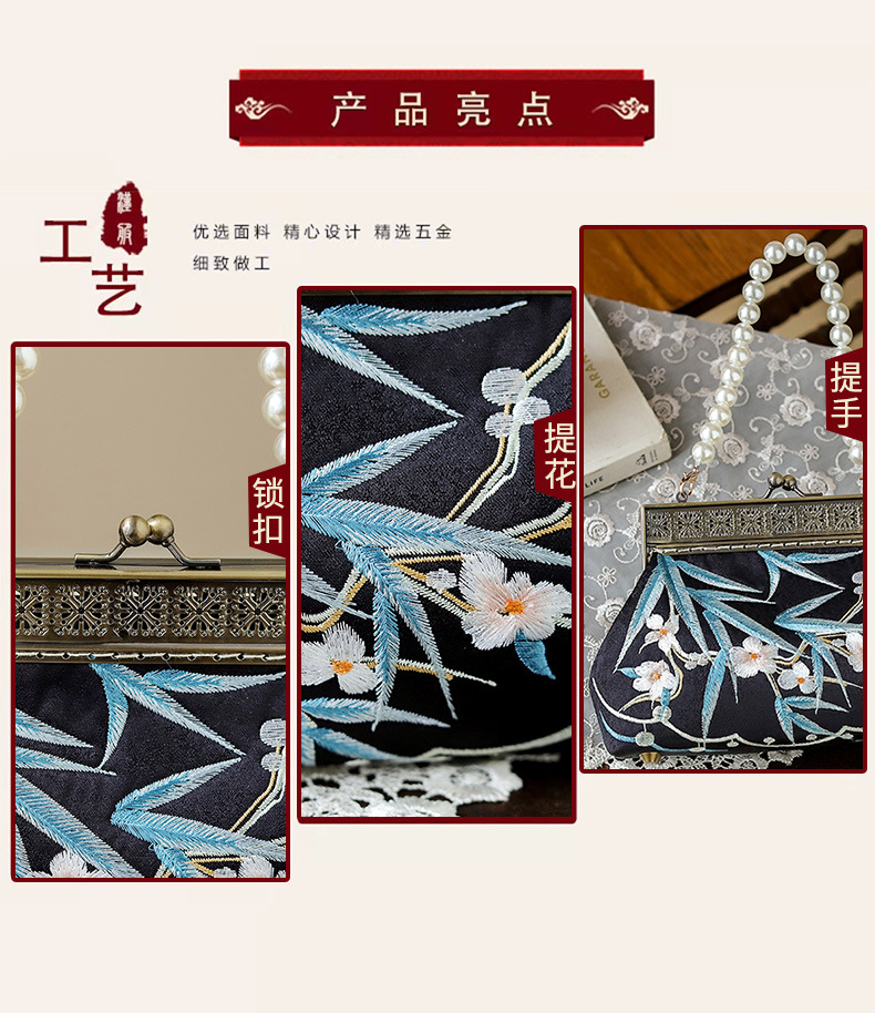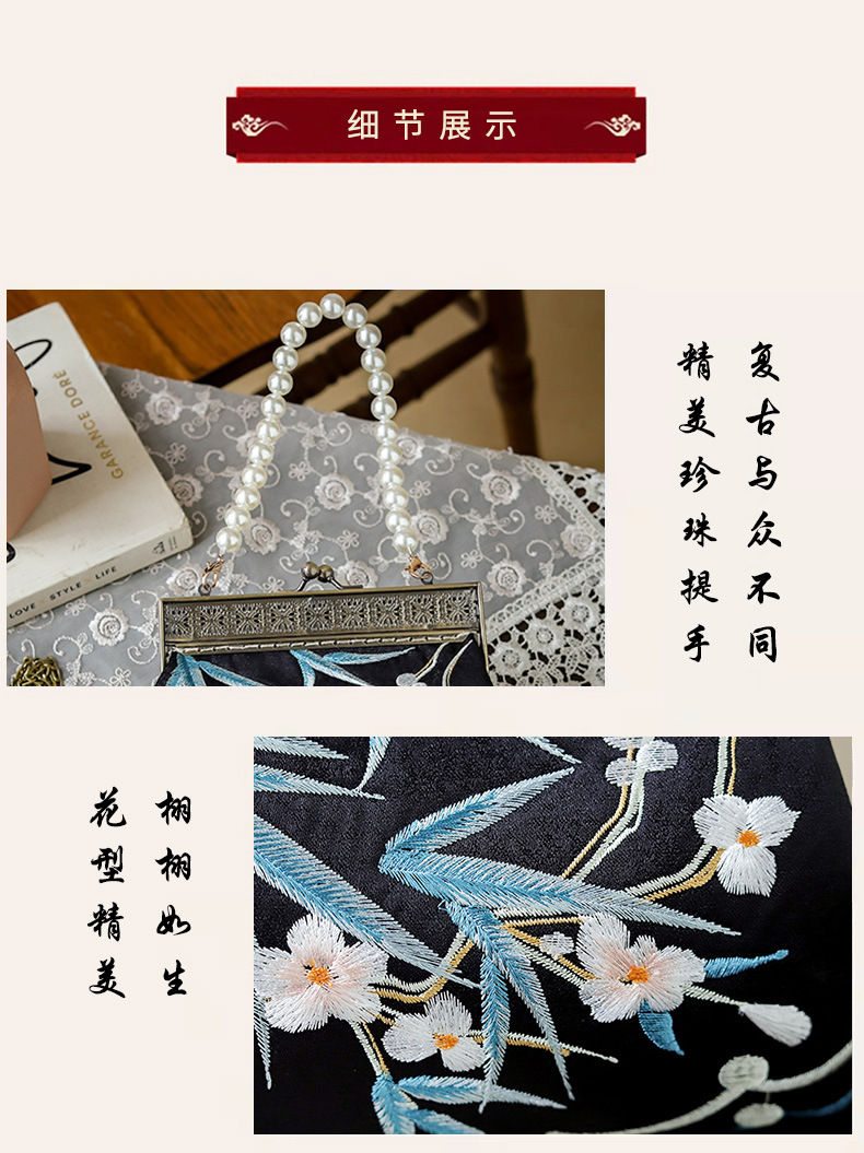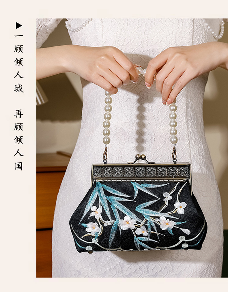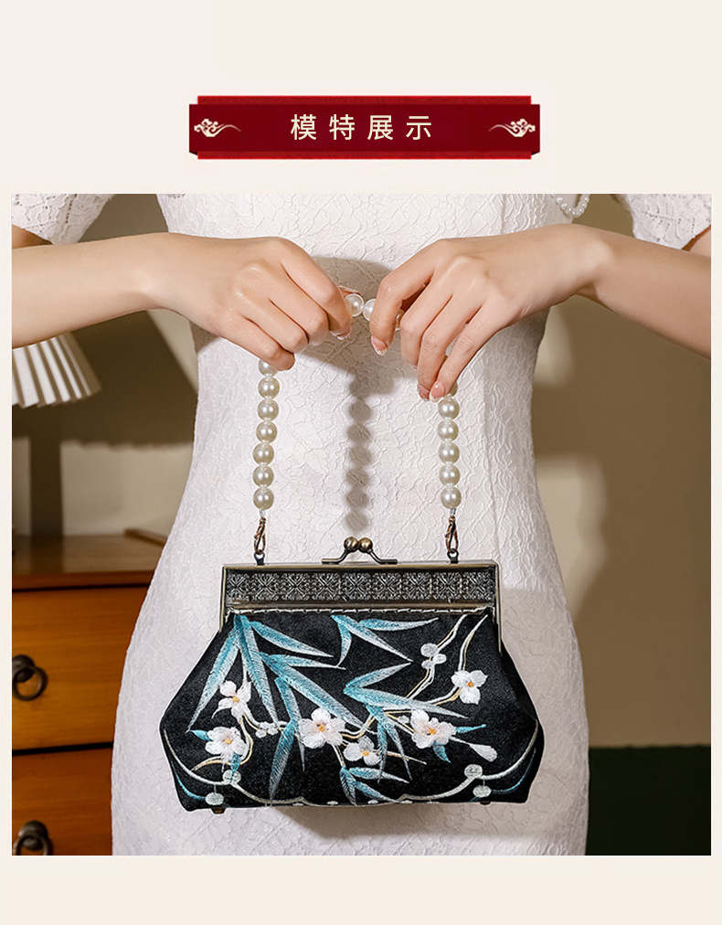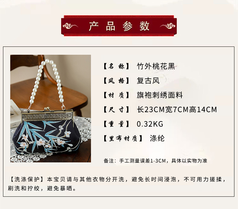 竹外桃花黑黑色绣花珍珠手提包,古风旗袍宴会手提包QB-竹外桃花黑