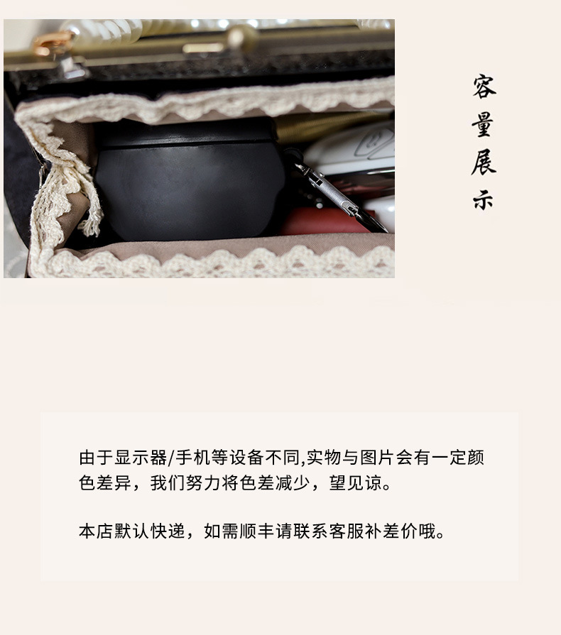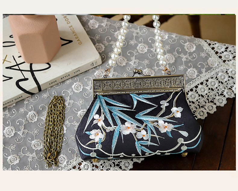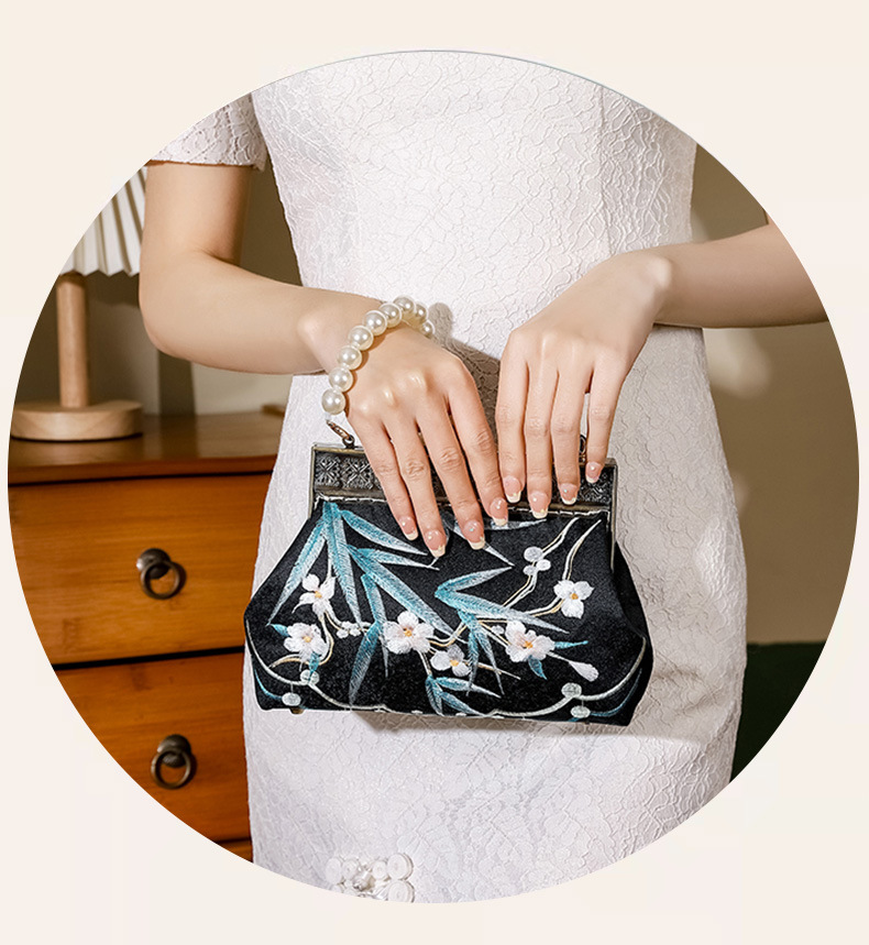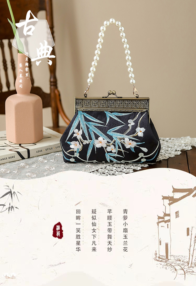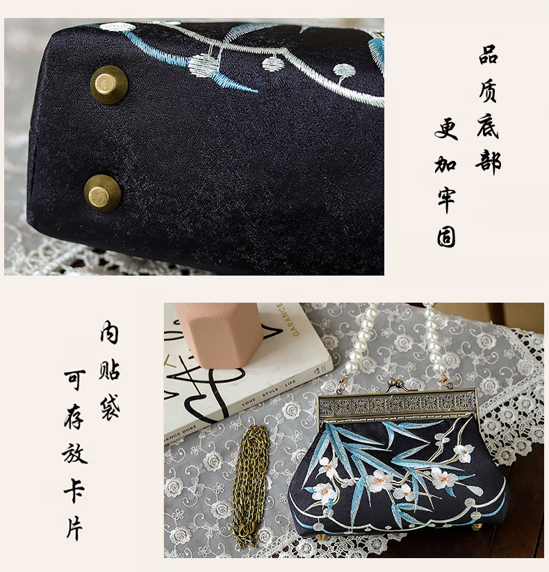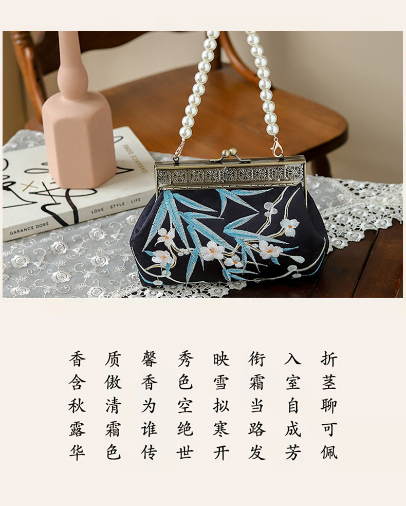 竹外桃花黑黑色绣花珍珠手提包,古风旗袍宴会手提包QB-竹外桃花黑