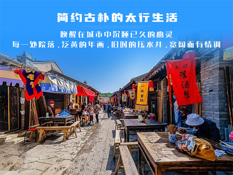 太行水镇整体建筑为传统的青砖、黛瓦、黄土墙,分小吃、作坊、院府、农耕等街区,简约的太行生活,浓浓的讲述了一个都市人向往的、乡情乡土的乡村故事。建议中午在此午餐,品尝各种特色小吃。
