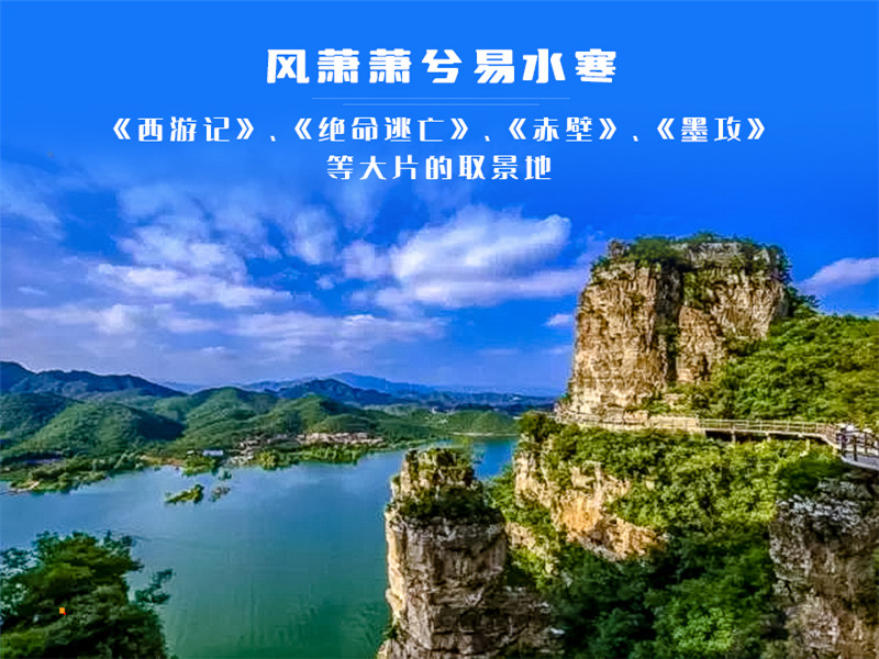 我们到达易水湖码头,一起坐船到湖中心去上高山栈道观看全景,逛长空栈道——赤壁拍摄外景地。易水湖风景区因可与漓江风光相媲美,故而被誉为"北方小桂林"。留下了七仙度国舅的美丽传说,可谓是欲知桂林风景,何必千里下江南。