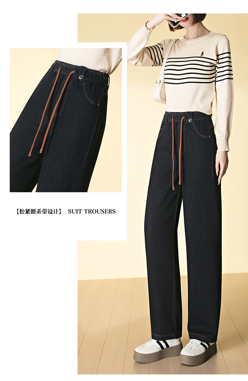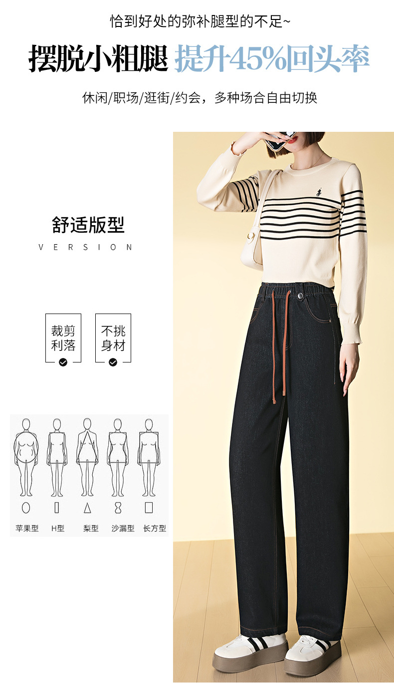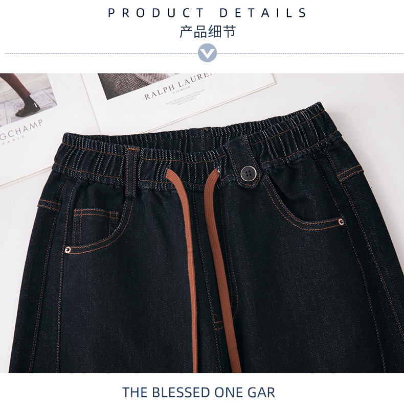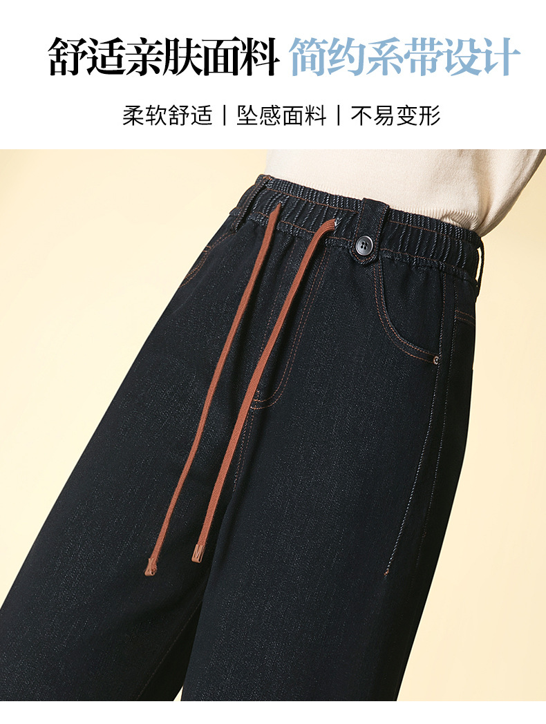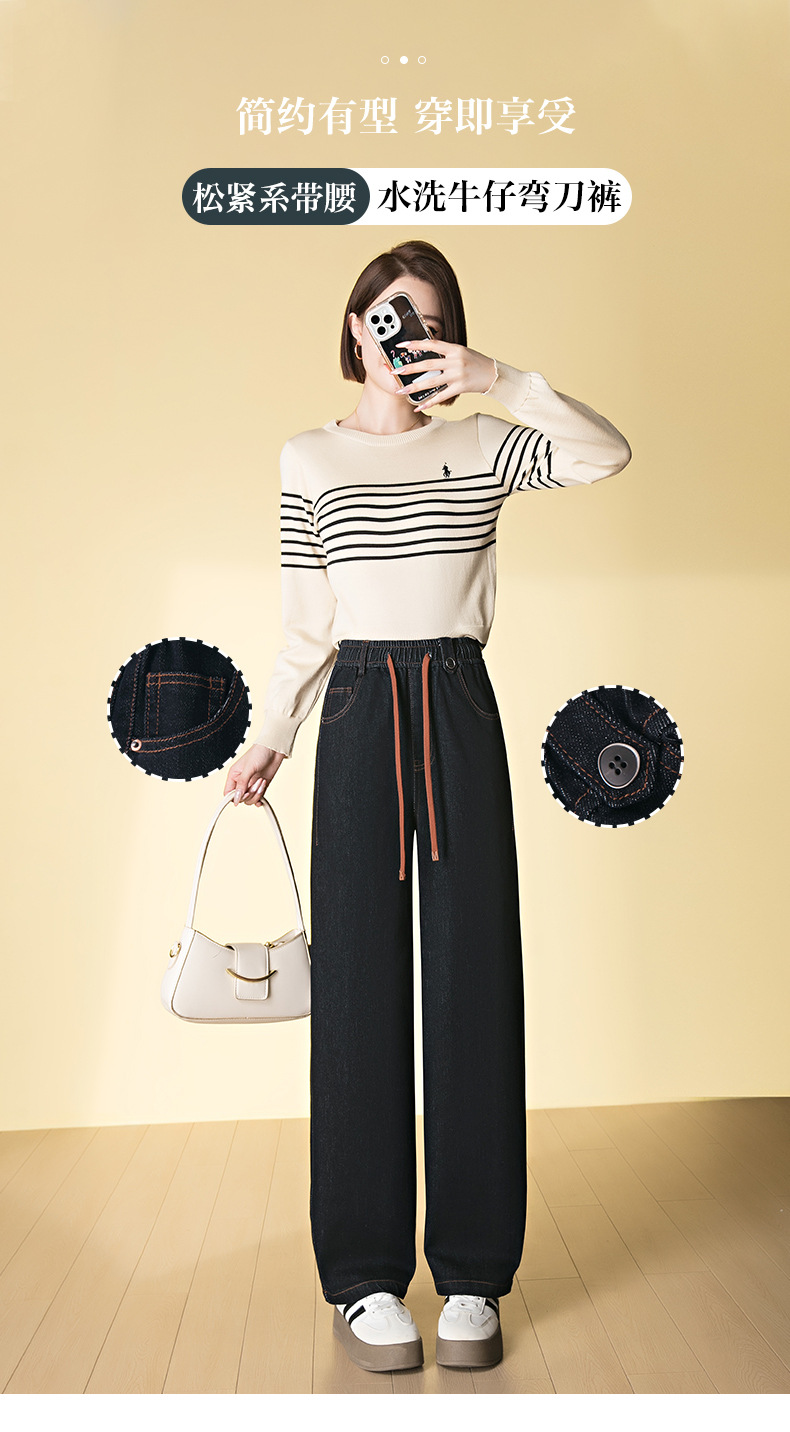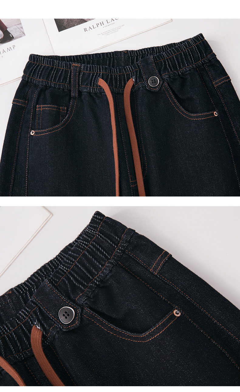 HSS 3037松紧腰系带牛仔弯刀裤水洗宽松显瘦休闲直筒裤