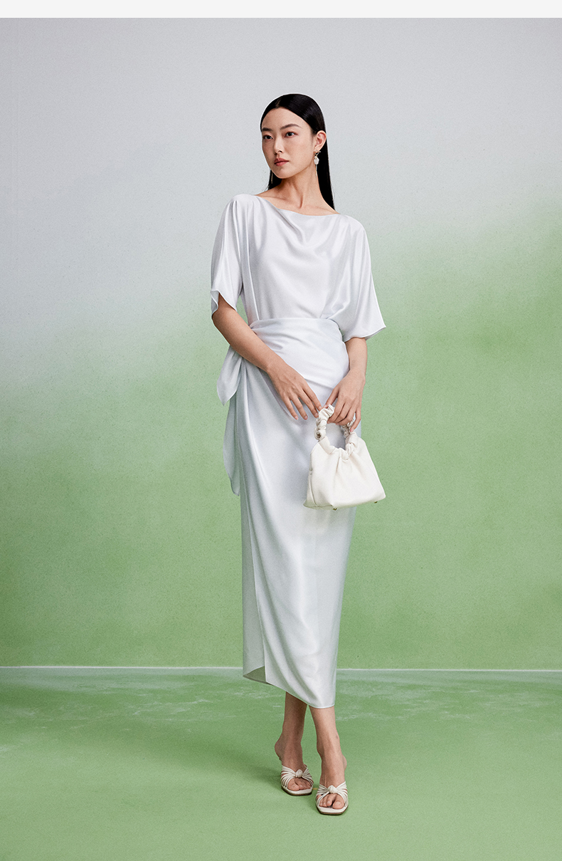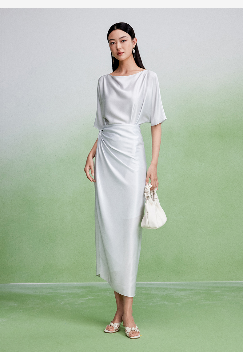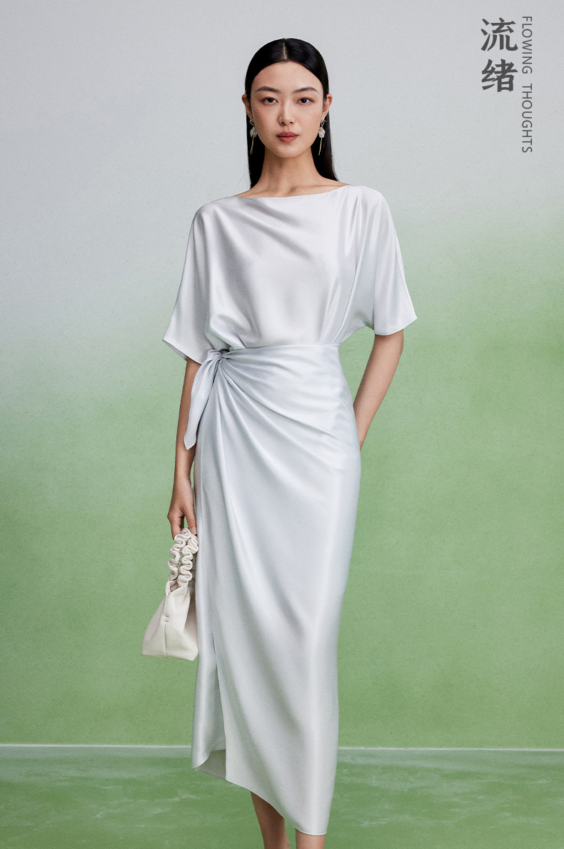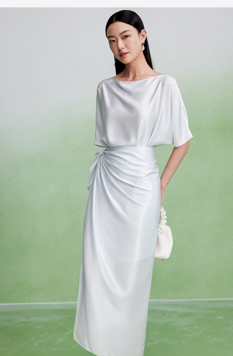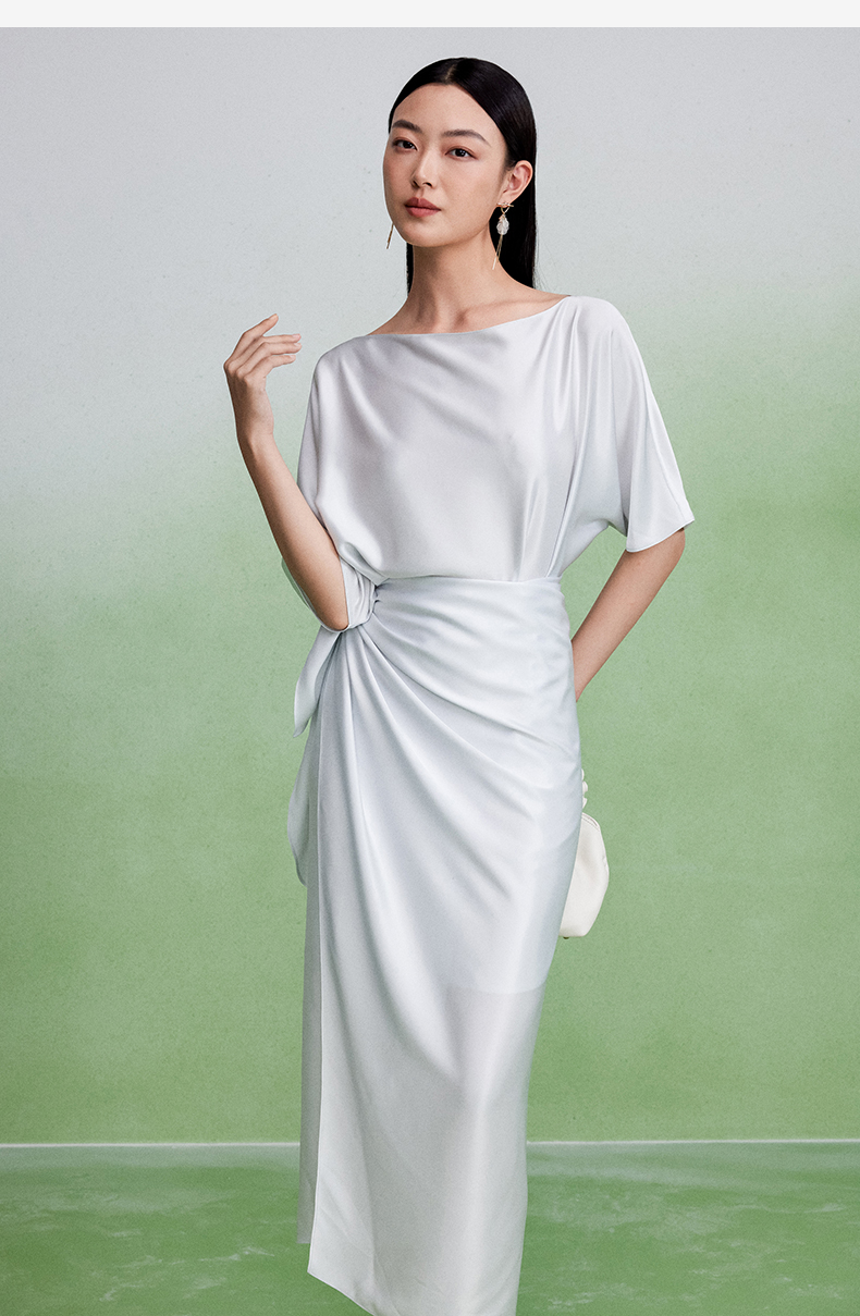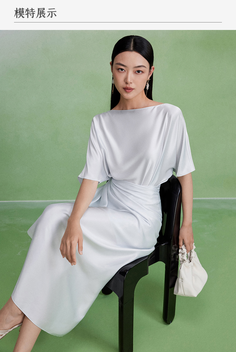 西嘉C+IMPRESS/西嘉静奢风中袖连衣裙女夏季醋酸一字肩围裹式腰间系带LYQ2402081