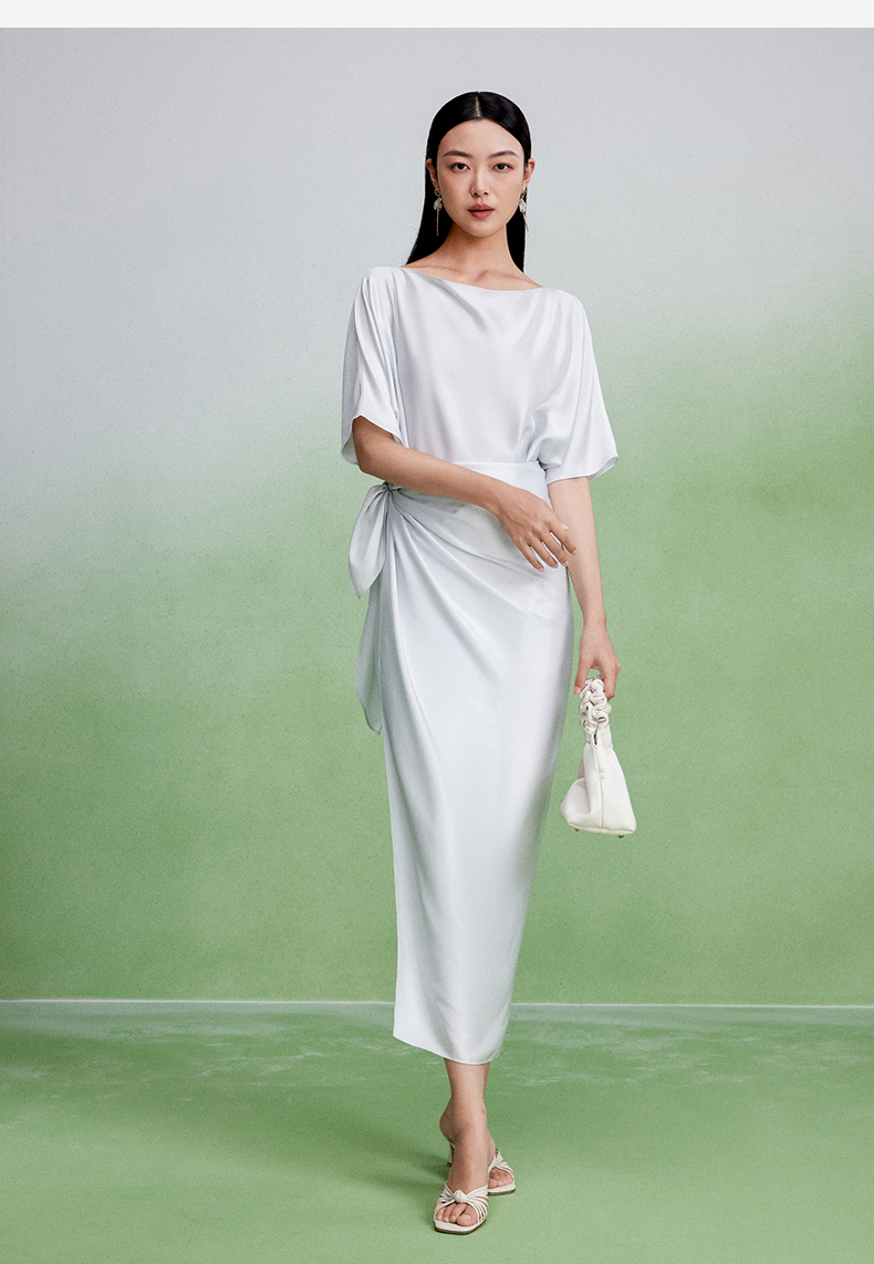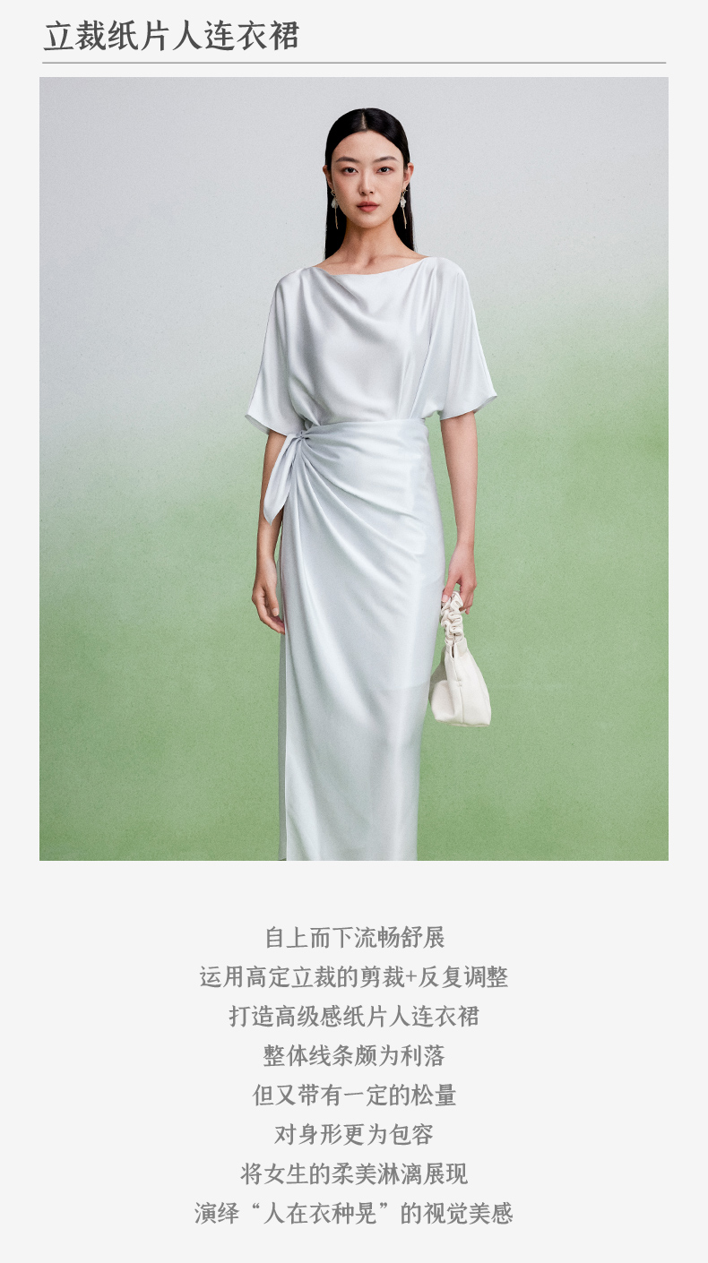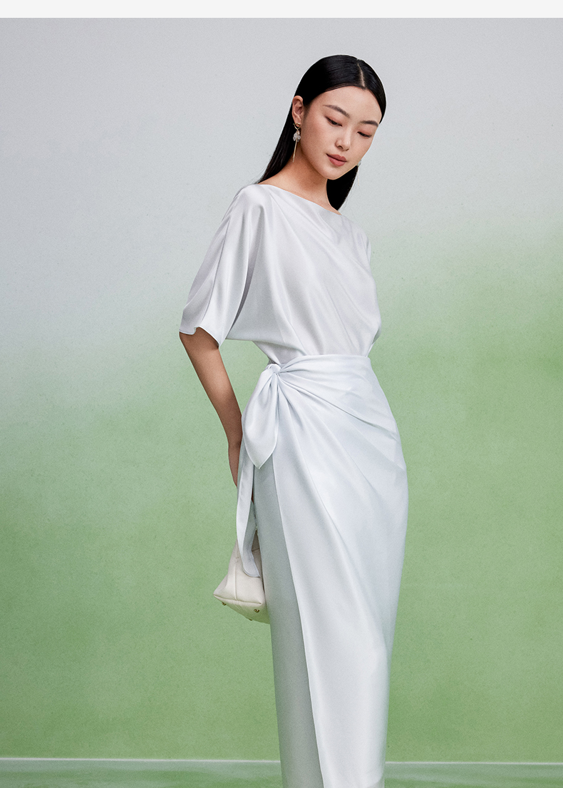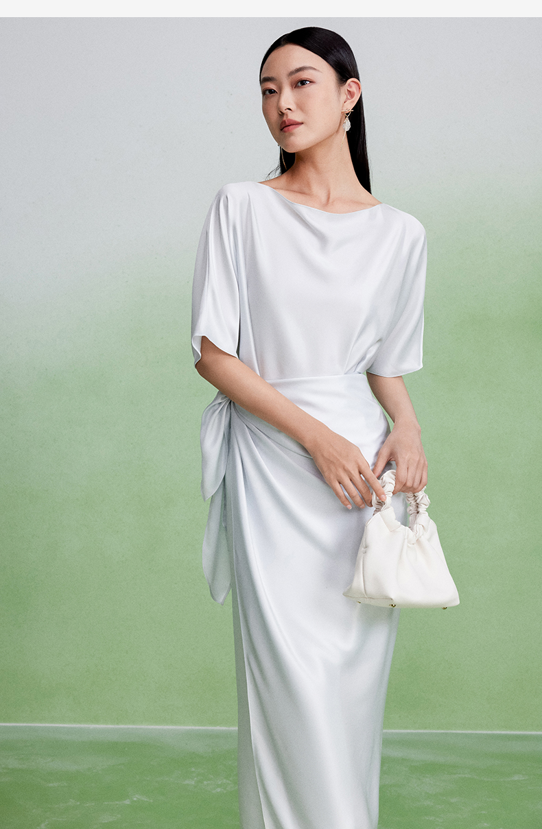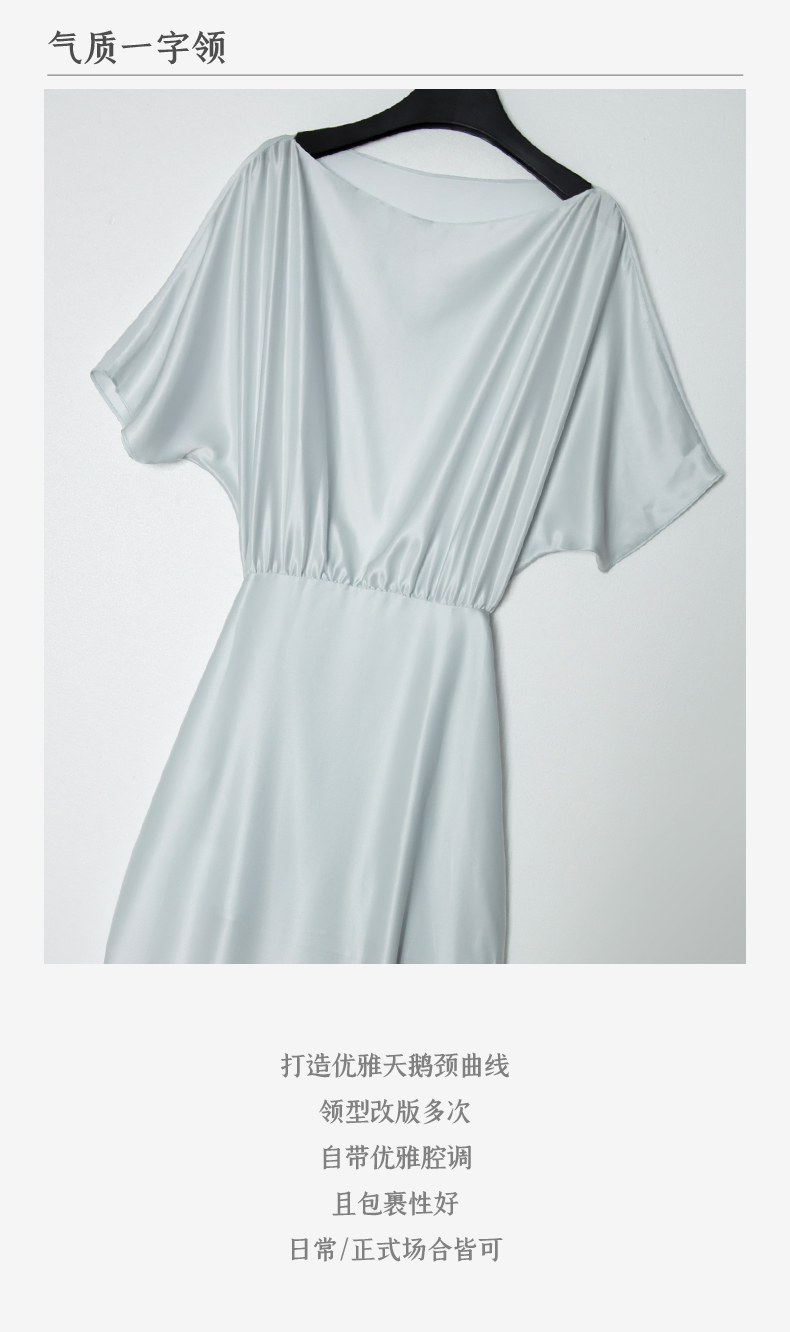 西嘉C+IMPRESS/西嘉静奢风中袖连衣裙女夏季醋酸一字肩围裹式腰间系带LYQ2402081
