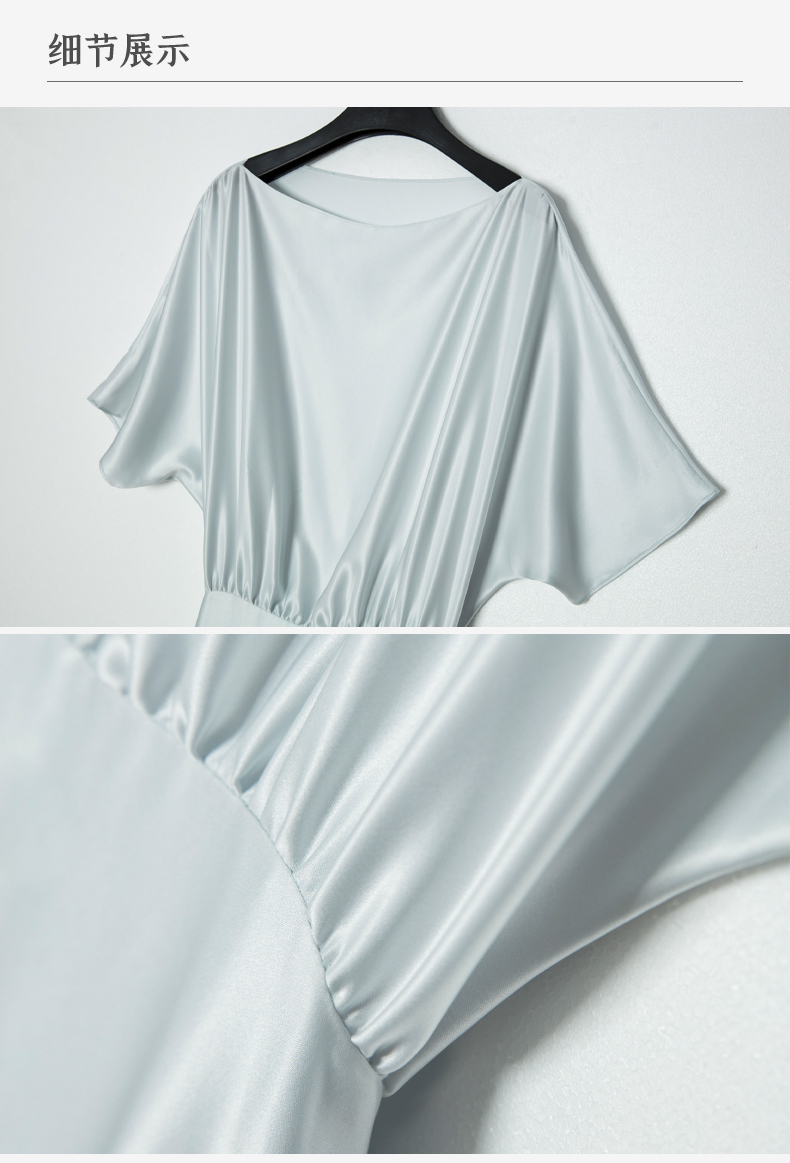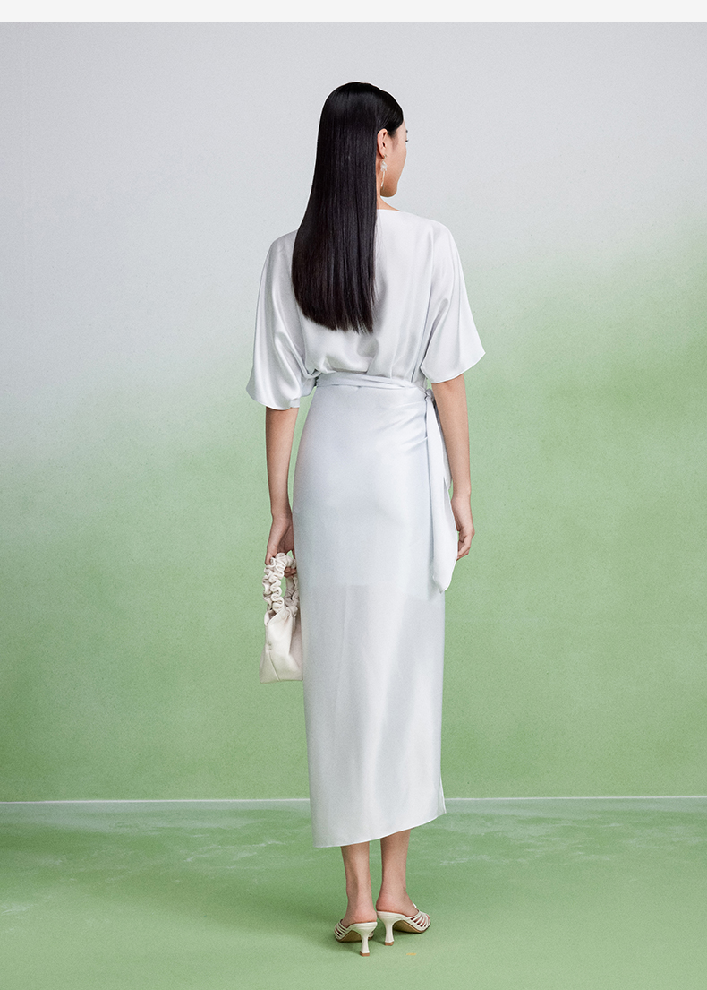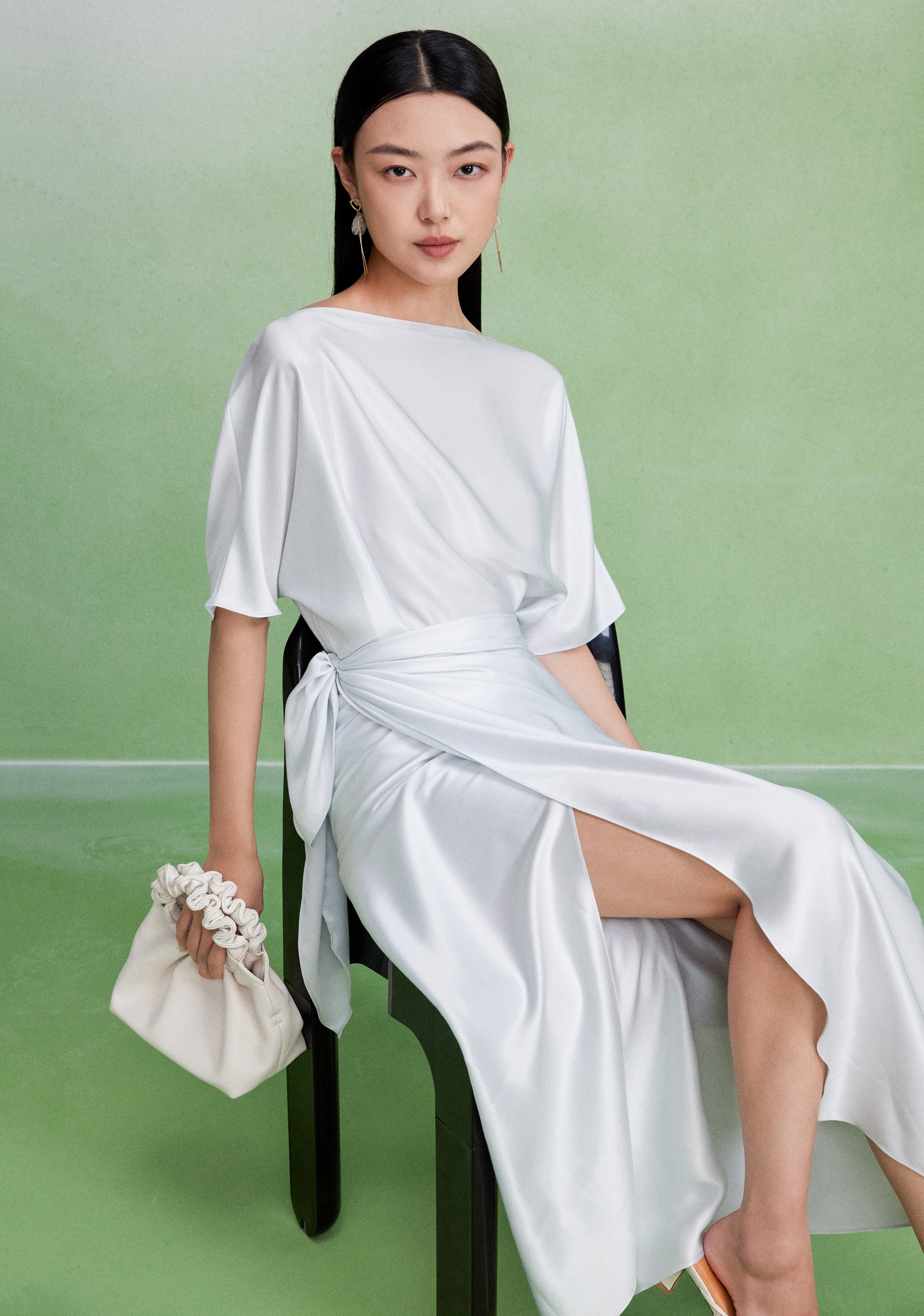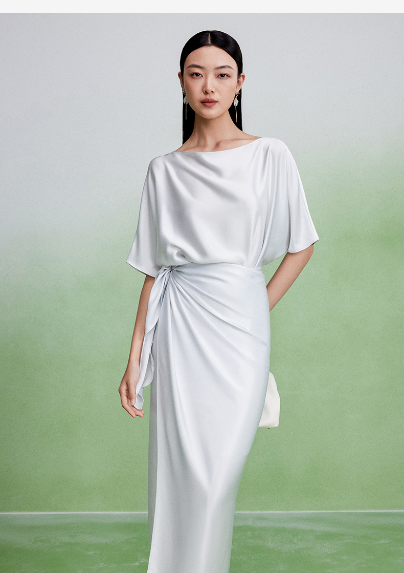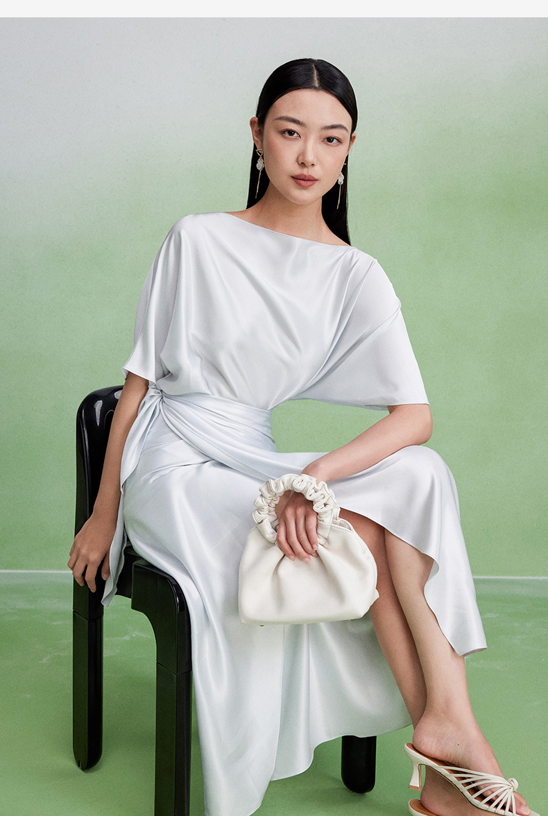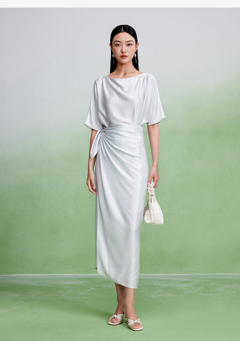 西嘉C+IMPRESS/西嘉静奢风中袖连衣裙女夏季醋酸一字肩围裹式腰间系带LYQ2402081