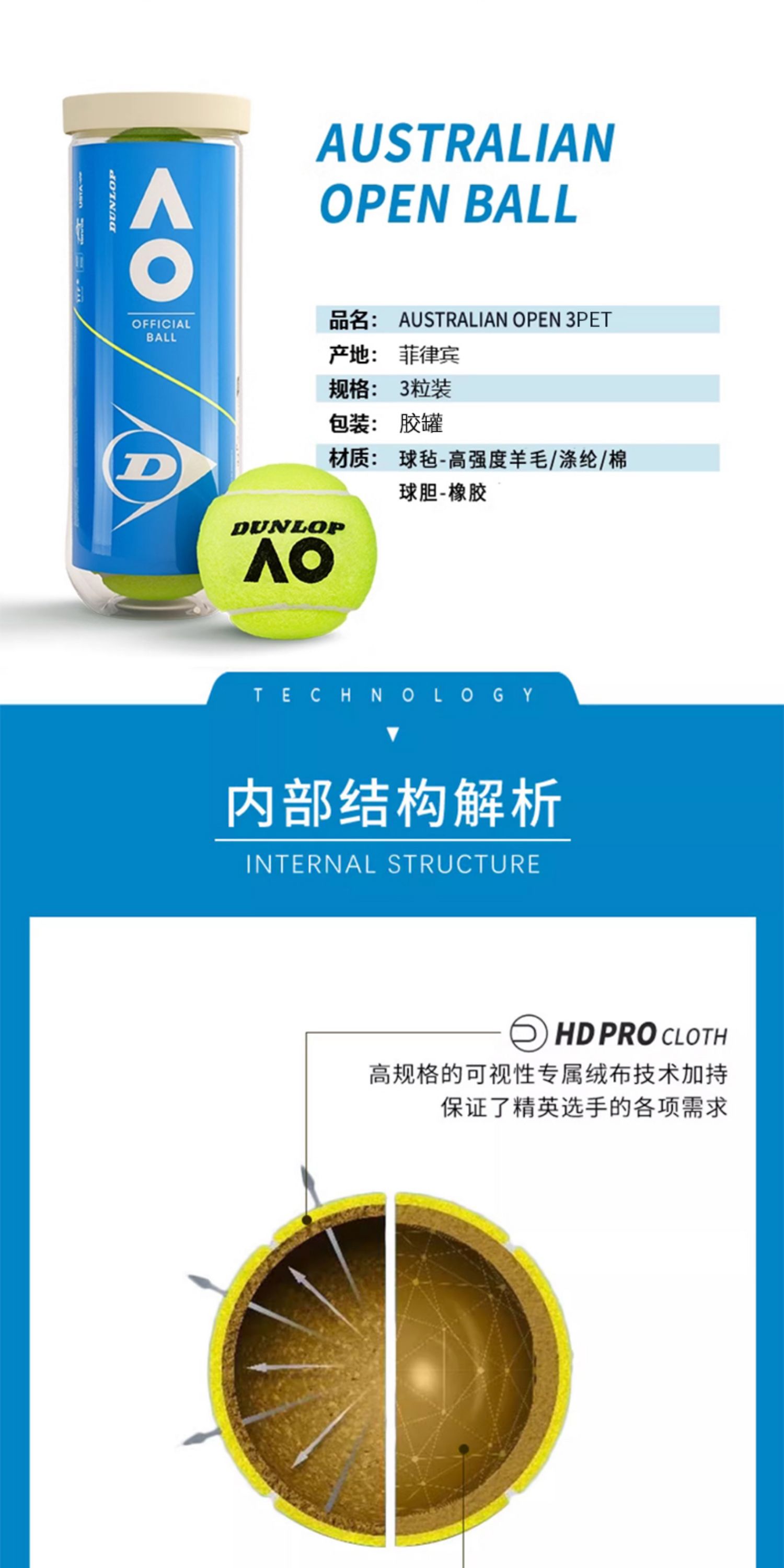 Dunlop邓禄普 澳网AO官方用球 胶桶(3粒装)