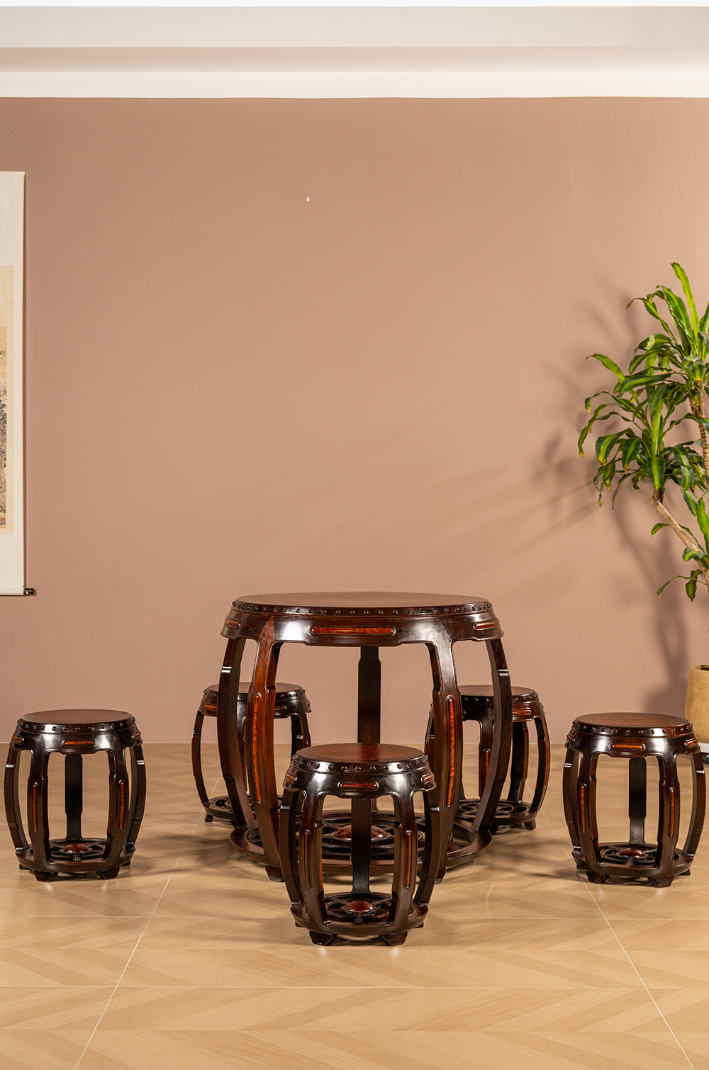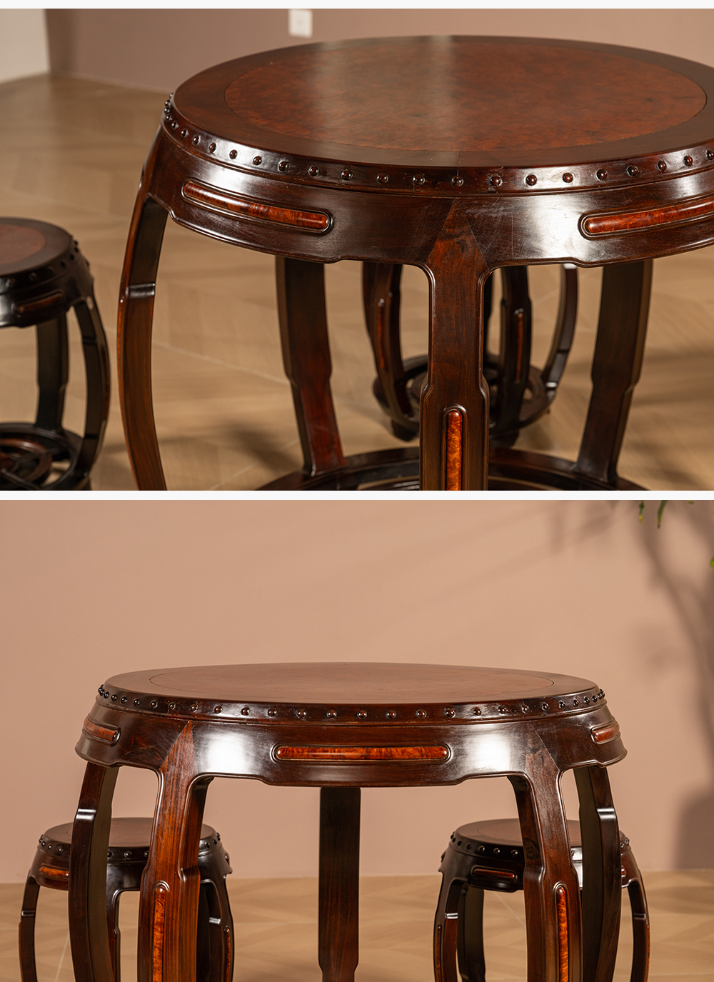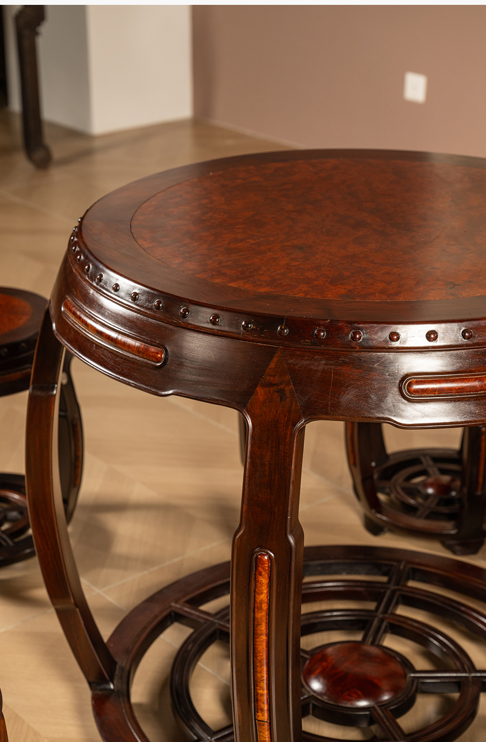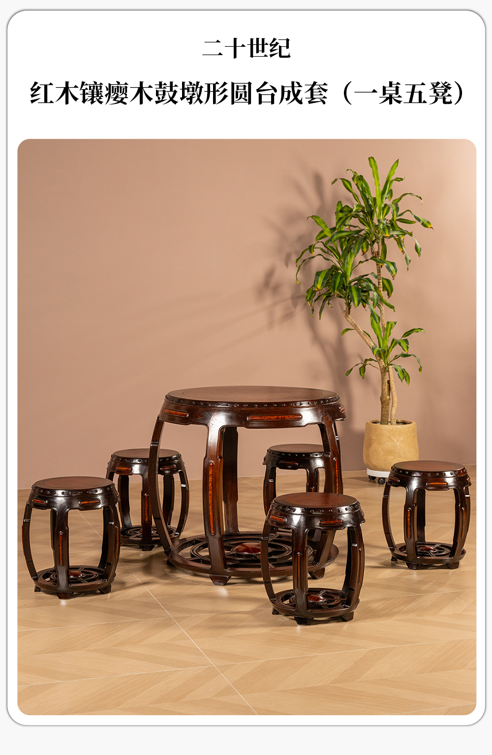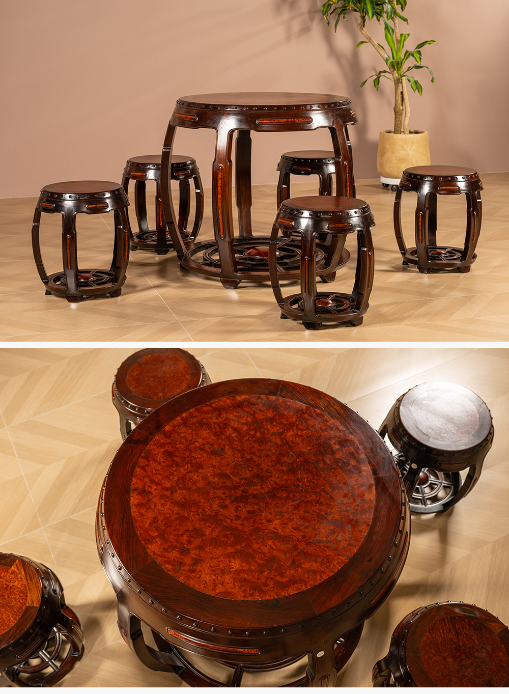 二十世纪 红木镶瘿木鼓墩形圆台成套(一桌五凳)