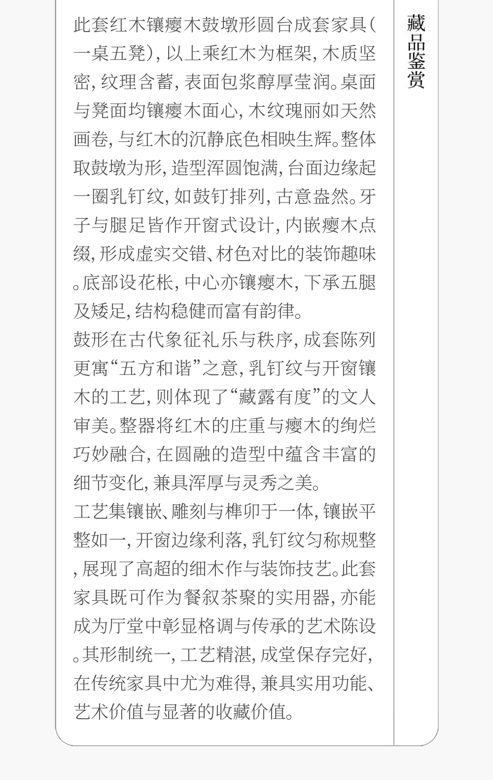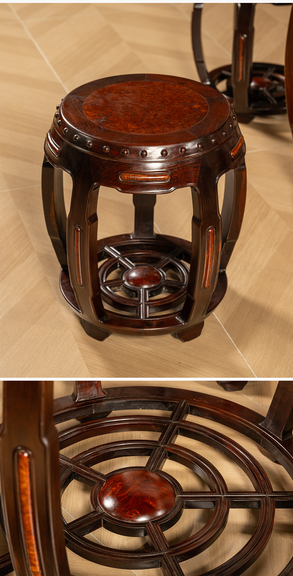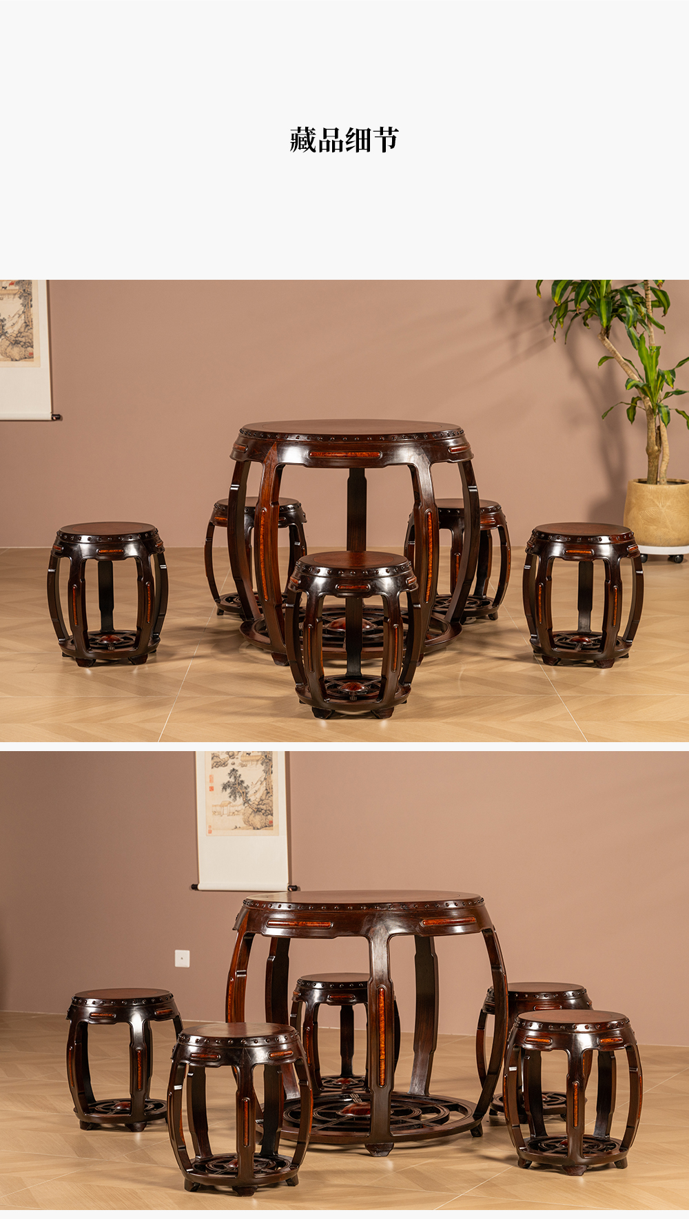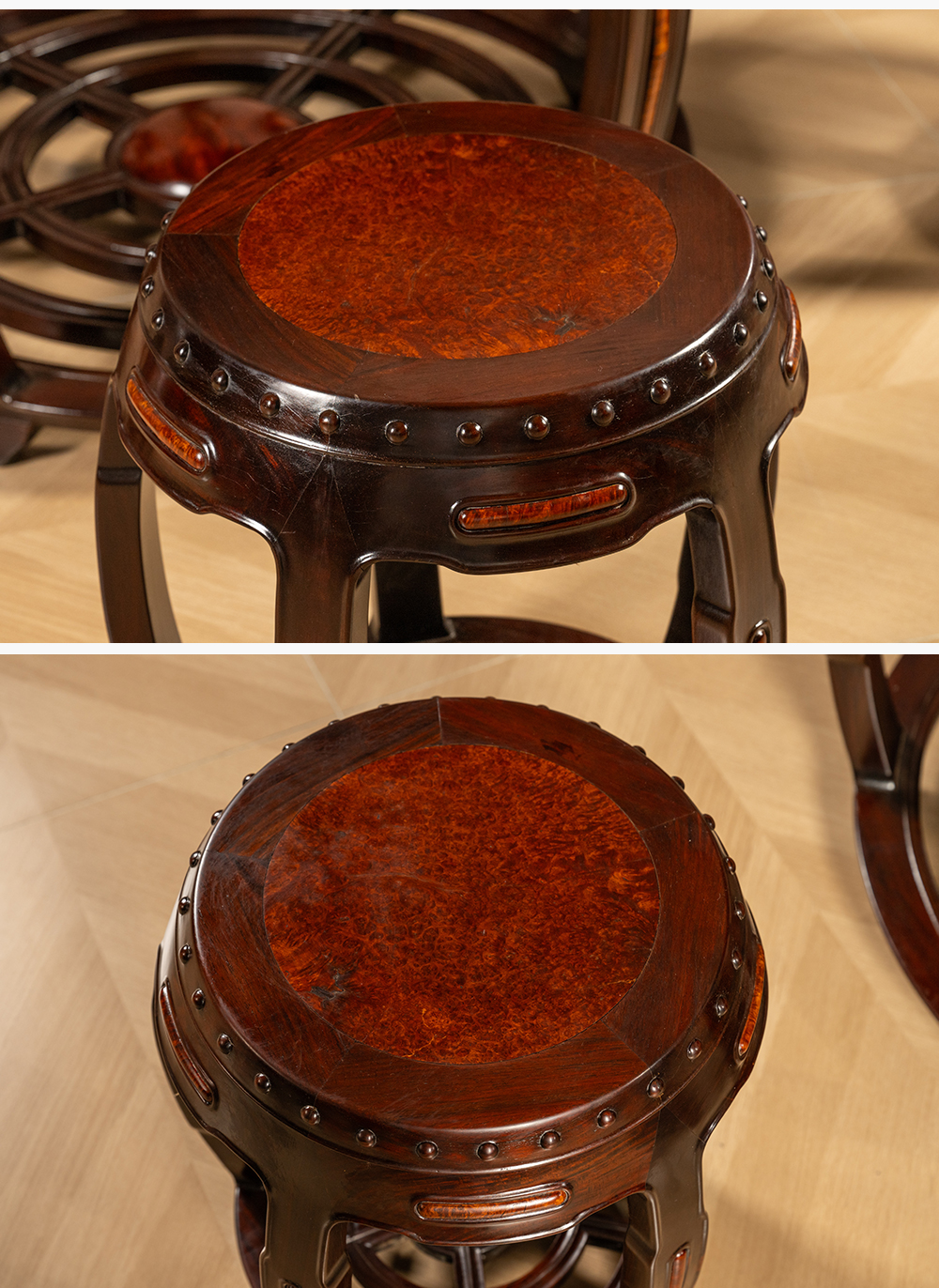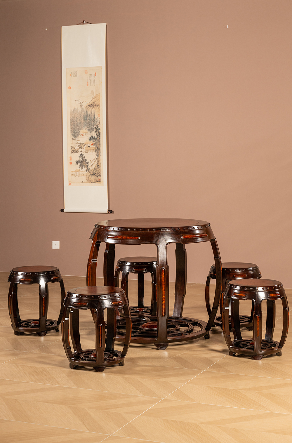 二十世纪 红木镶瘿木鼓墩形圆台成套(一桌五凳)