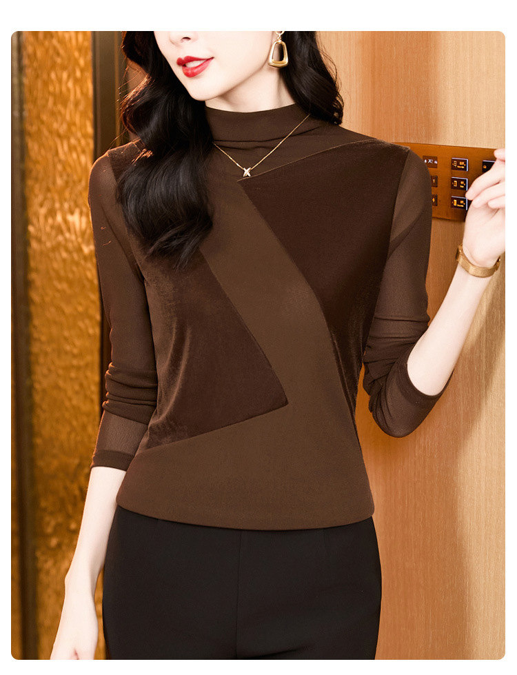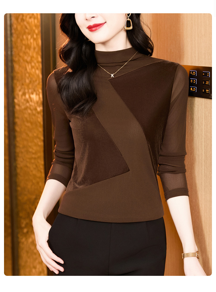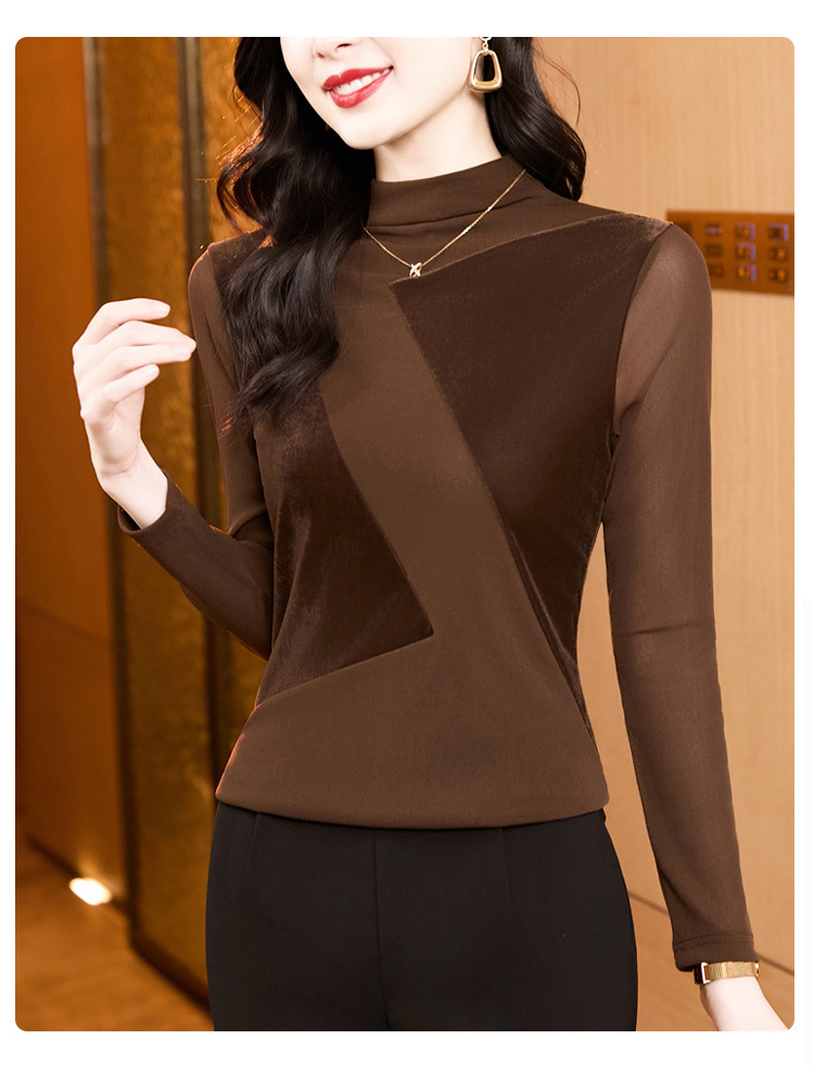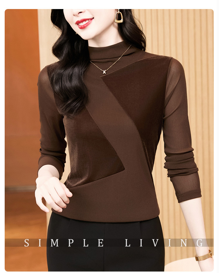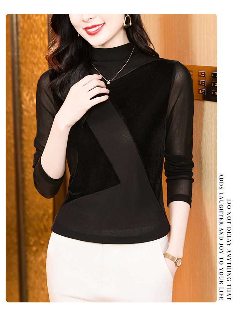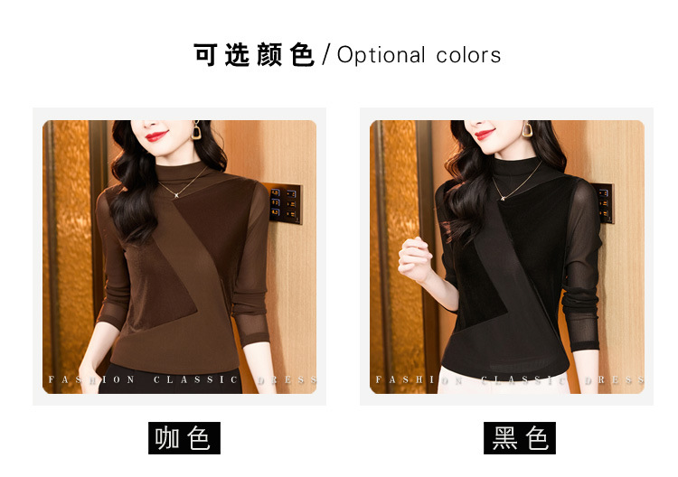KQL E37M2955时尚百搭丝绒拼接纯色网纱修身显瘦小衫