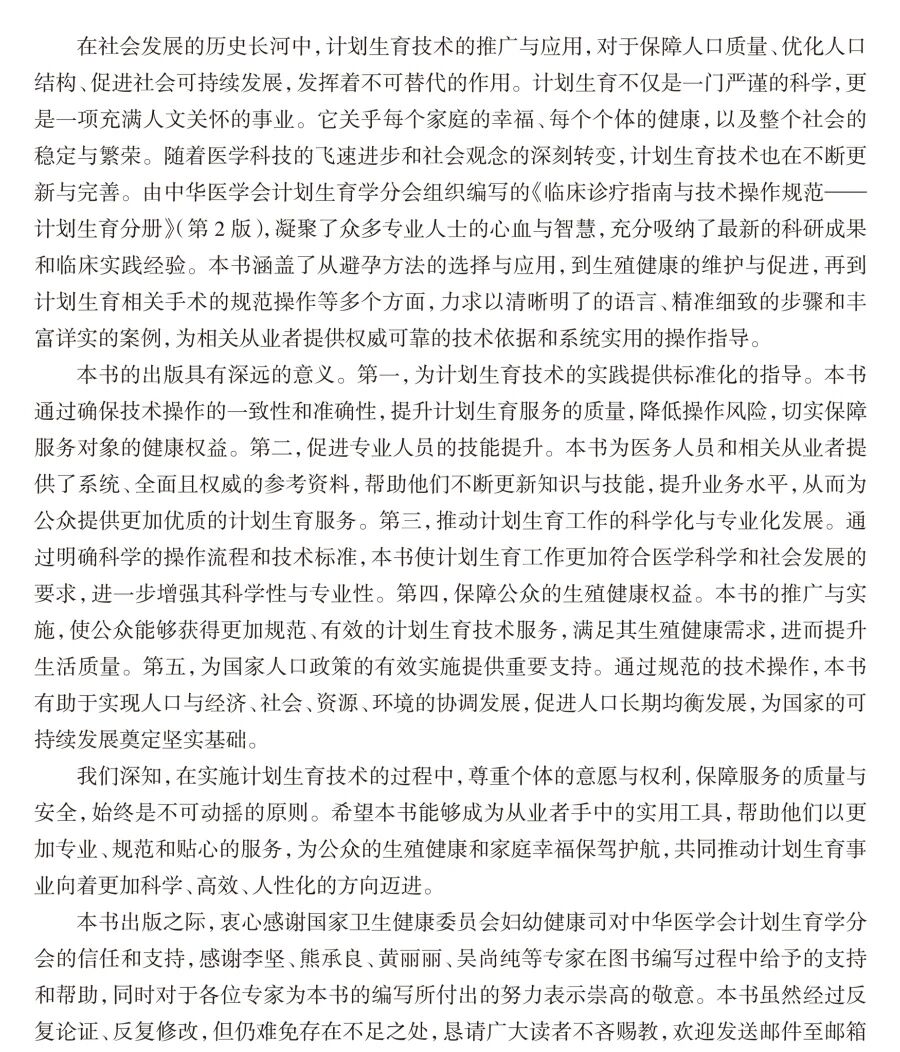 汲取国内外计划生育学领域的研究成果、世界卫生组织及权威学术机构和组织的指南与专家共识,对计划生育临床医务人员的临床诊疗及操作提出了具体要求,使临床工作有章可循、有据可依,同时力求具有学术发展的代表性,体现专业技术进步。
