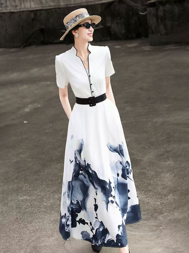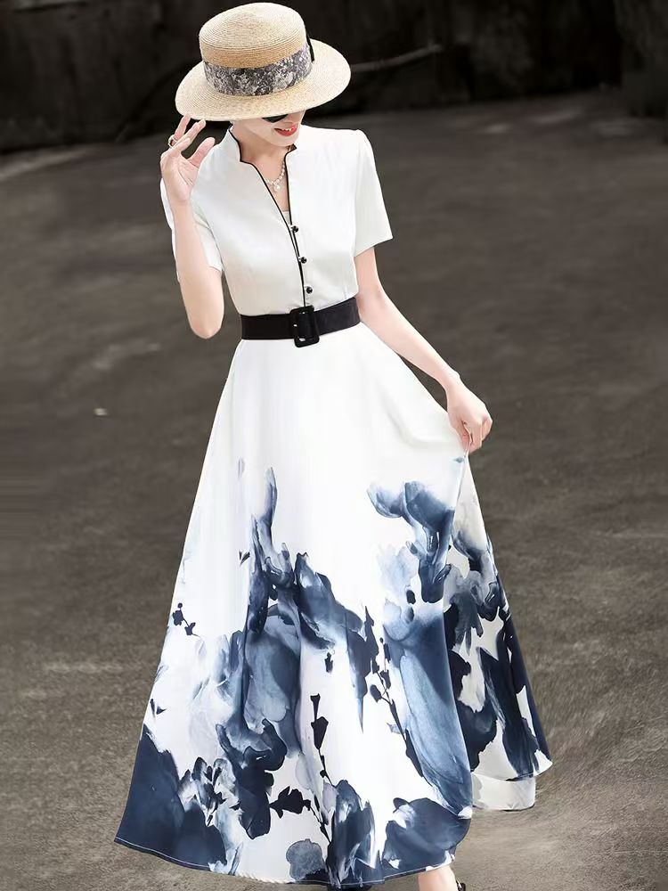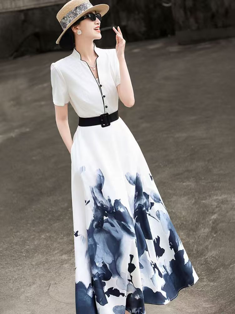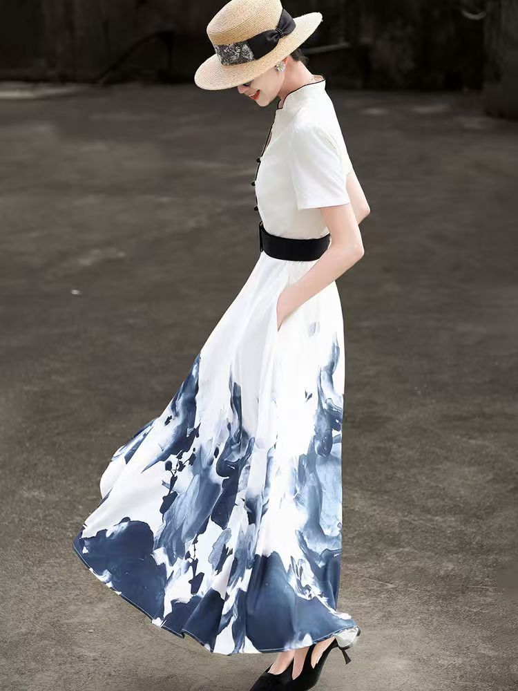 2025夏季新款超仙气质新中式水墨画印花长裙短袖收腰大摆连衣裙