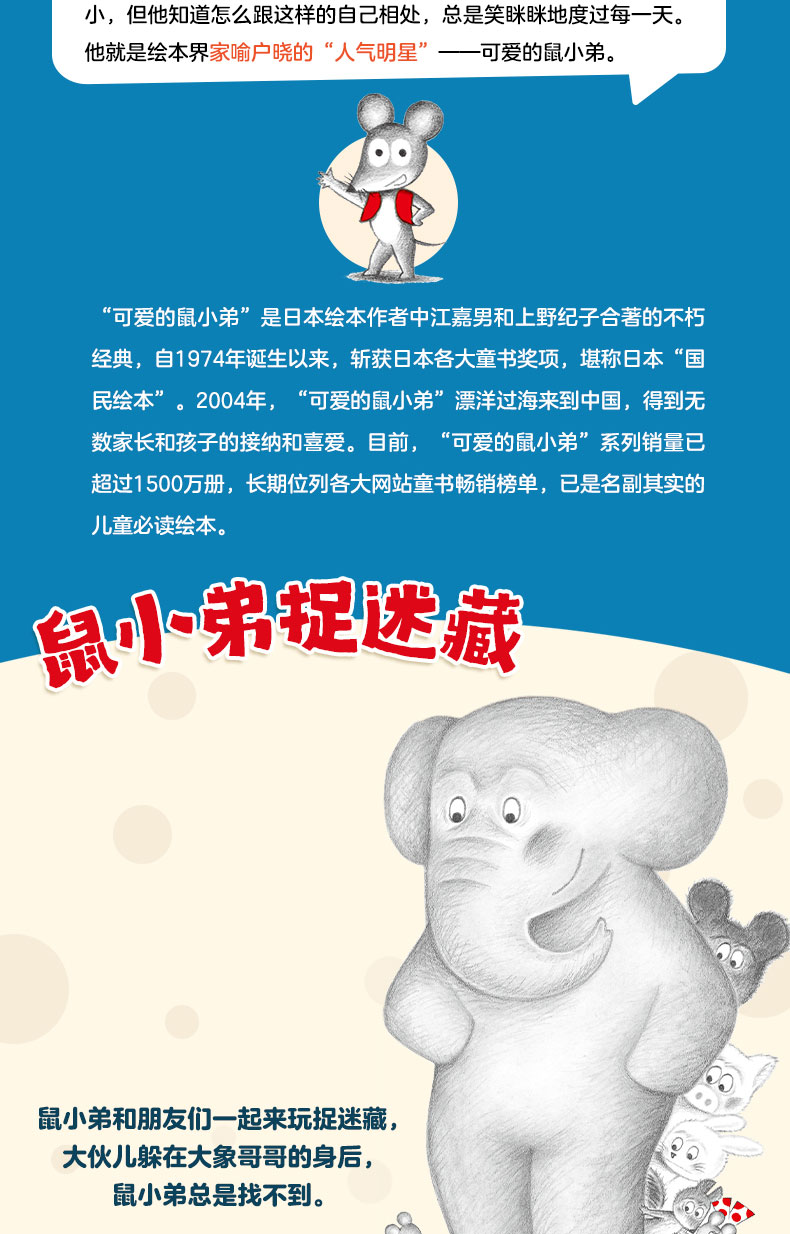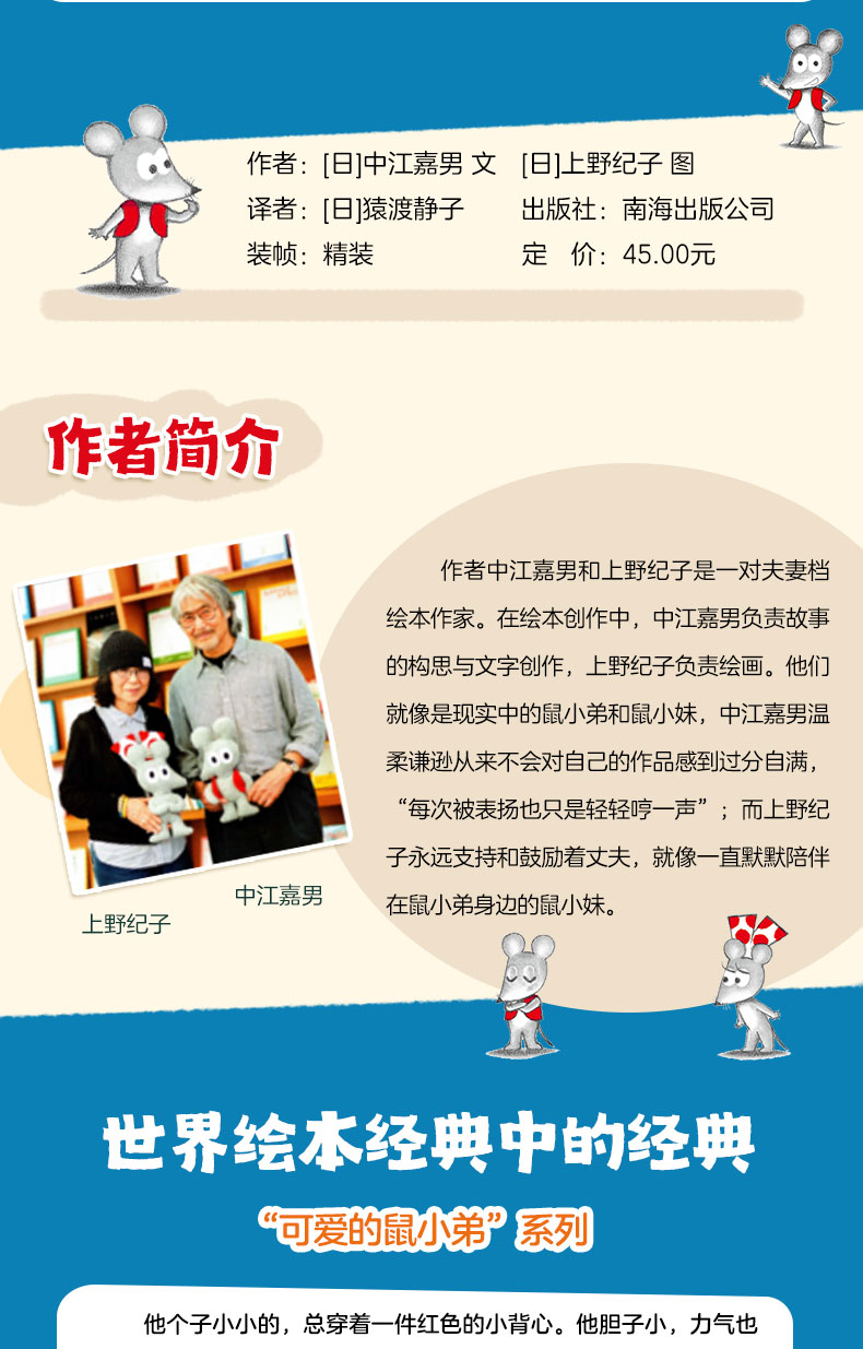 “可爱的鼠小弟”系列是日本绘本作者中江嘉男和上野纪子合著的不朽经典,自1974年诞生以来,斩获日本各大童书奖项——日本学校图书馆协会好绘本奖、日本产经儿童出版文化奖、日本讲谈社出版文化绘本奖、日本厚生省儿童福利文化奖,堪称日本“国民绘本”。