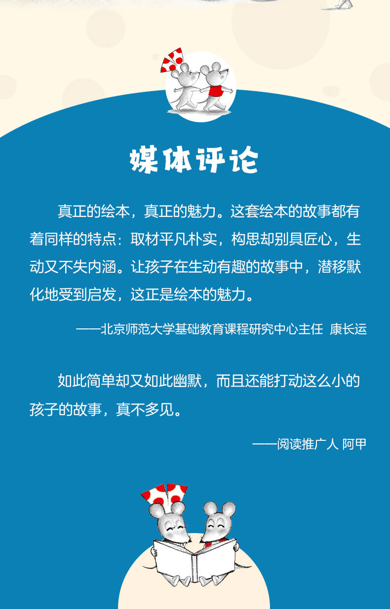 真正的绘本,真正的魅力。这套绘本的故事都有着同样的特点:取材平凡朴实,构思却别具匠心,生动又不失内涵。让孩子在生动有趣的故事中,潜移默化地受到启发,这正是绘本的魅力。——北京师范大学基础教育课程研究中心主任 康长运