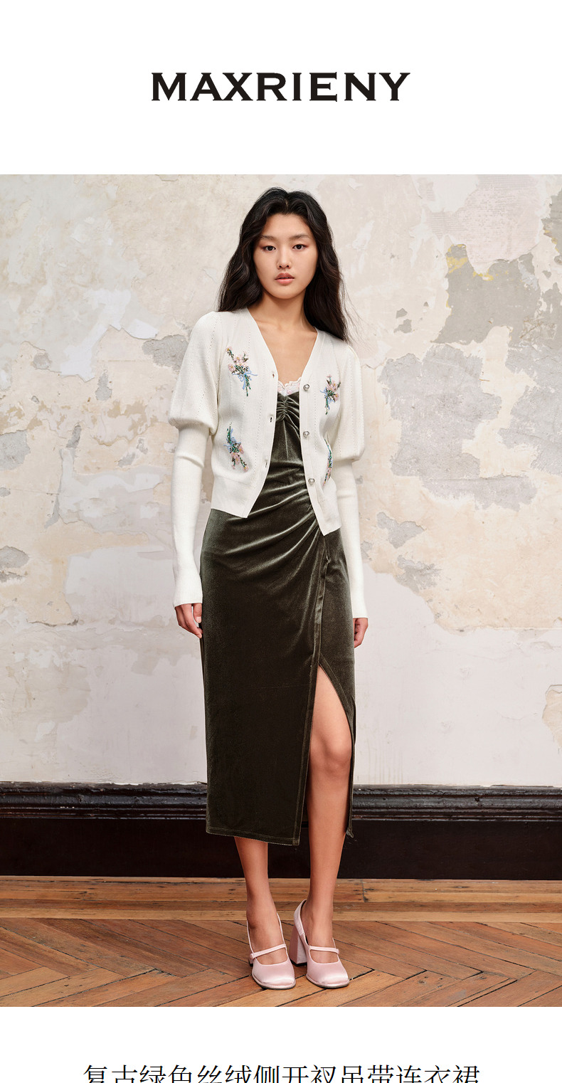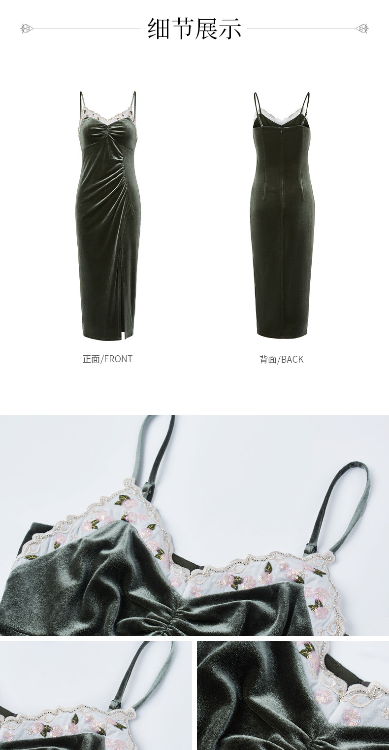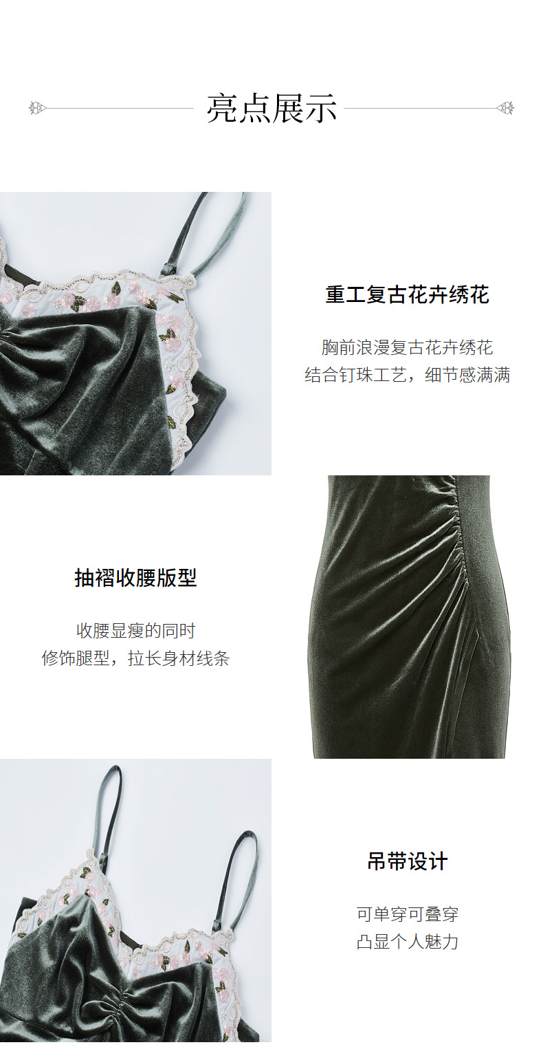 MAXRIENY*复古绿色丝绒侧开衩吊带连衣裙裙子(货号:MC88DR564)
