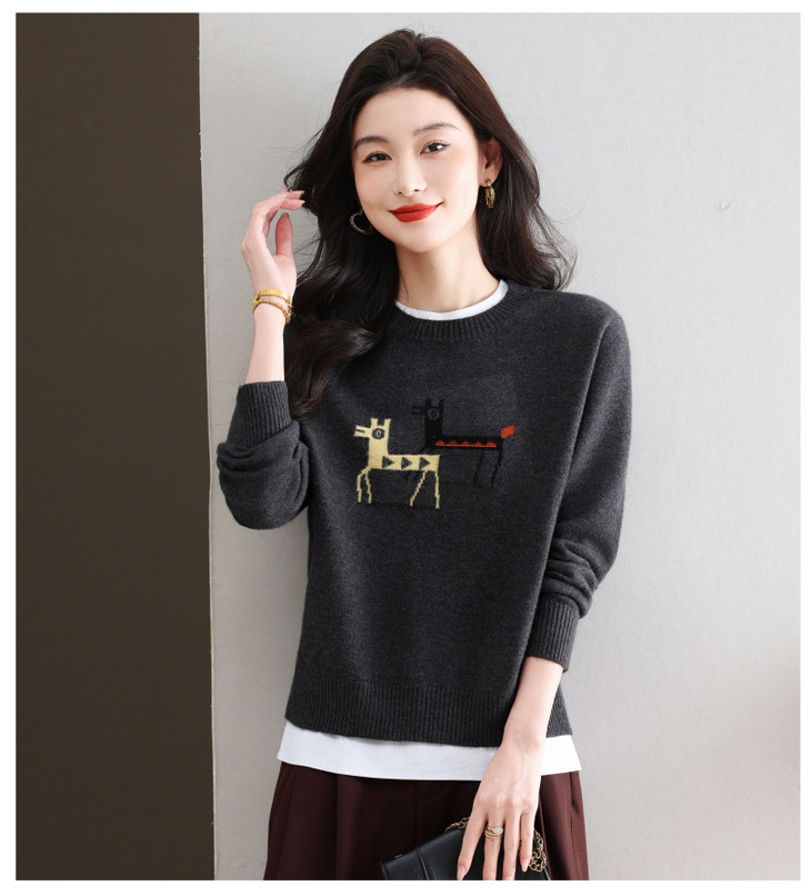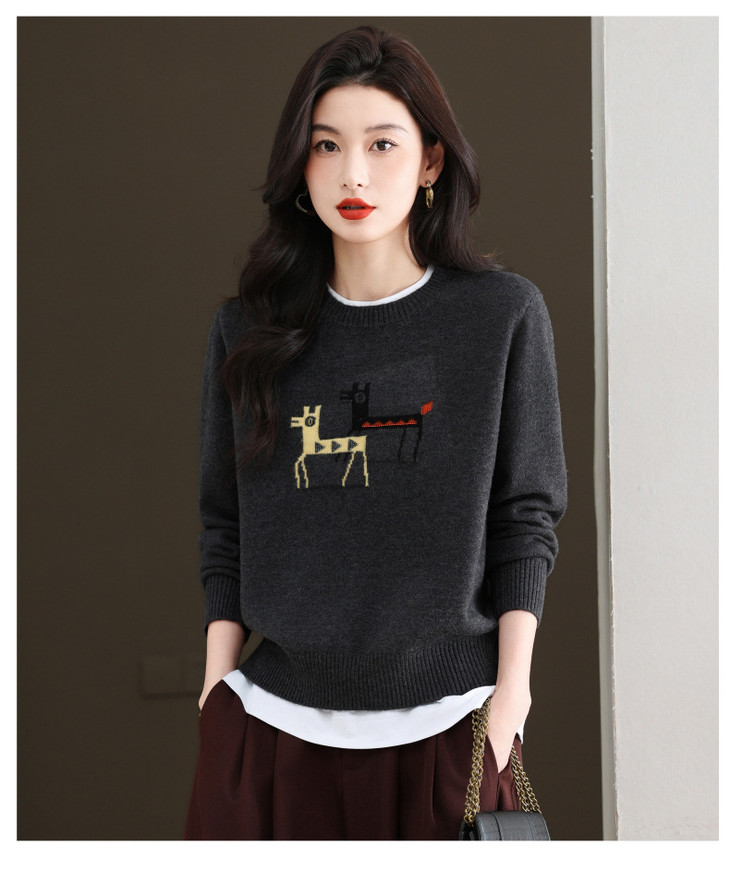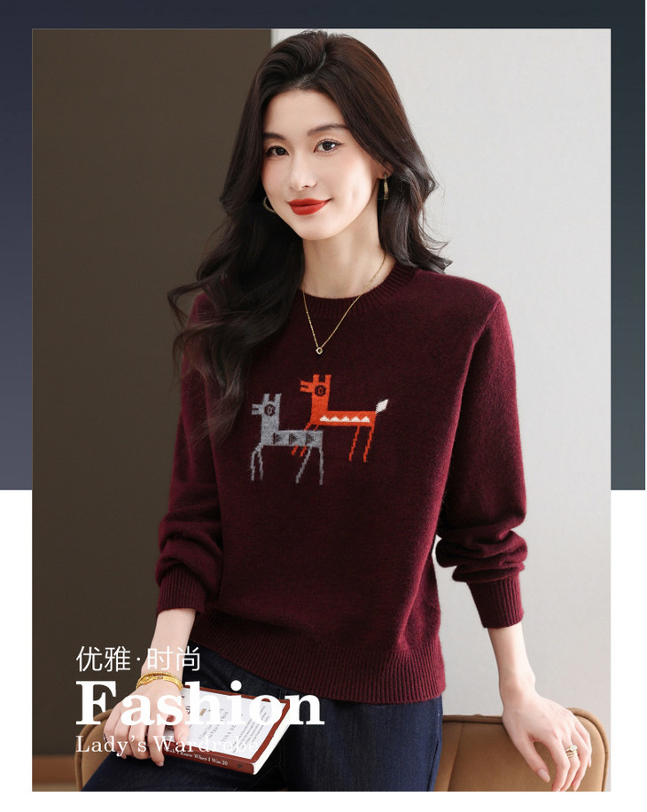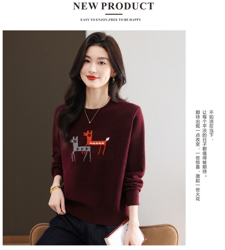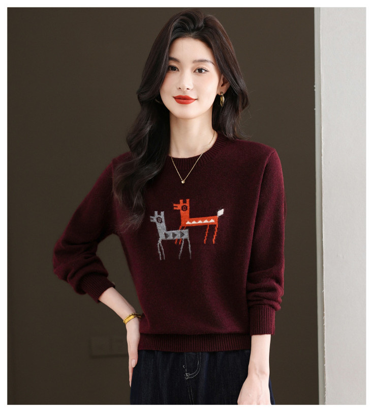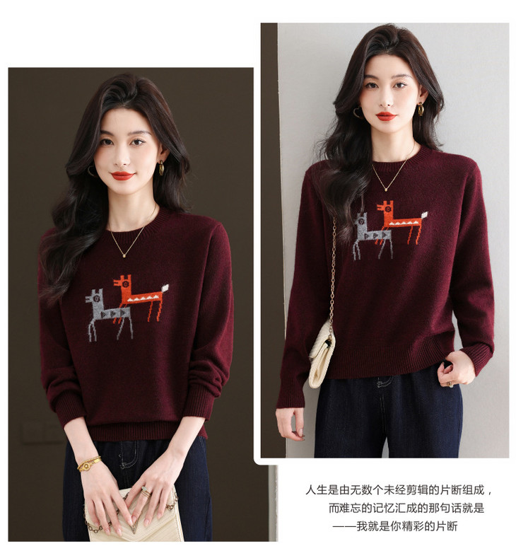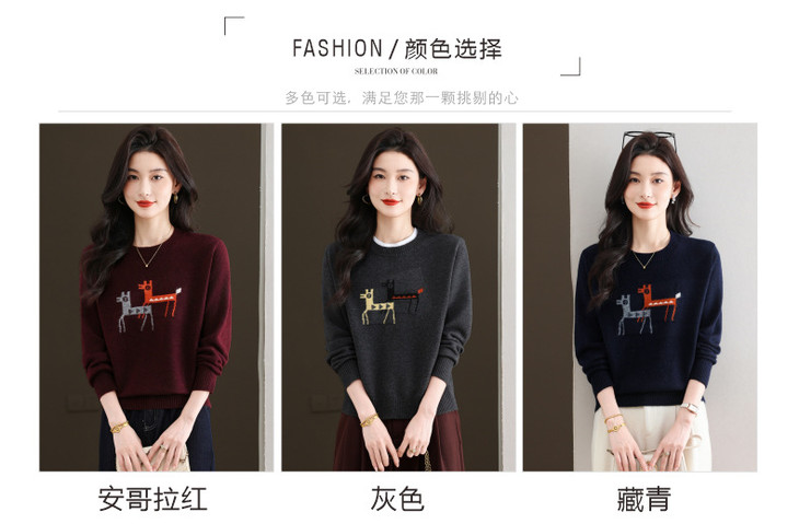 圆领卡通小鹿提花图案,宽松减龄针织衫上衣CC-101-15807