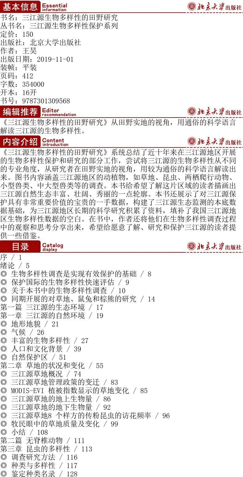 《三江源生物多样性的田野研究》定价:150元 作者:王昊 著