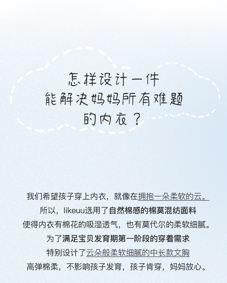 - likeuu是专注于为6~15岁的青少年创造柔软、无束缚的成长体验,以好奇心为灵感的成长发育期贴身衣物品牌。likeuu的产品覆盖内衣、内裤、保暖衣、家居服、运动等品类。