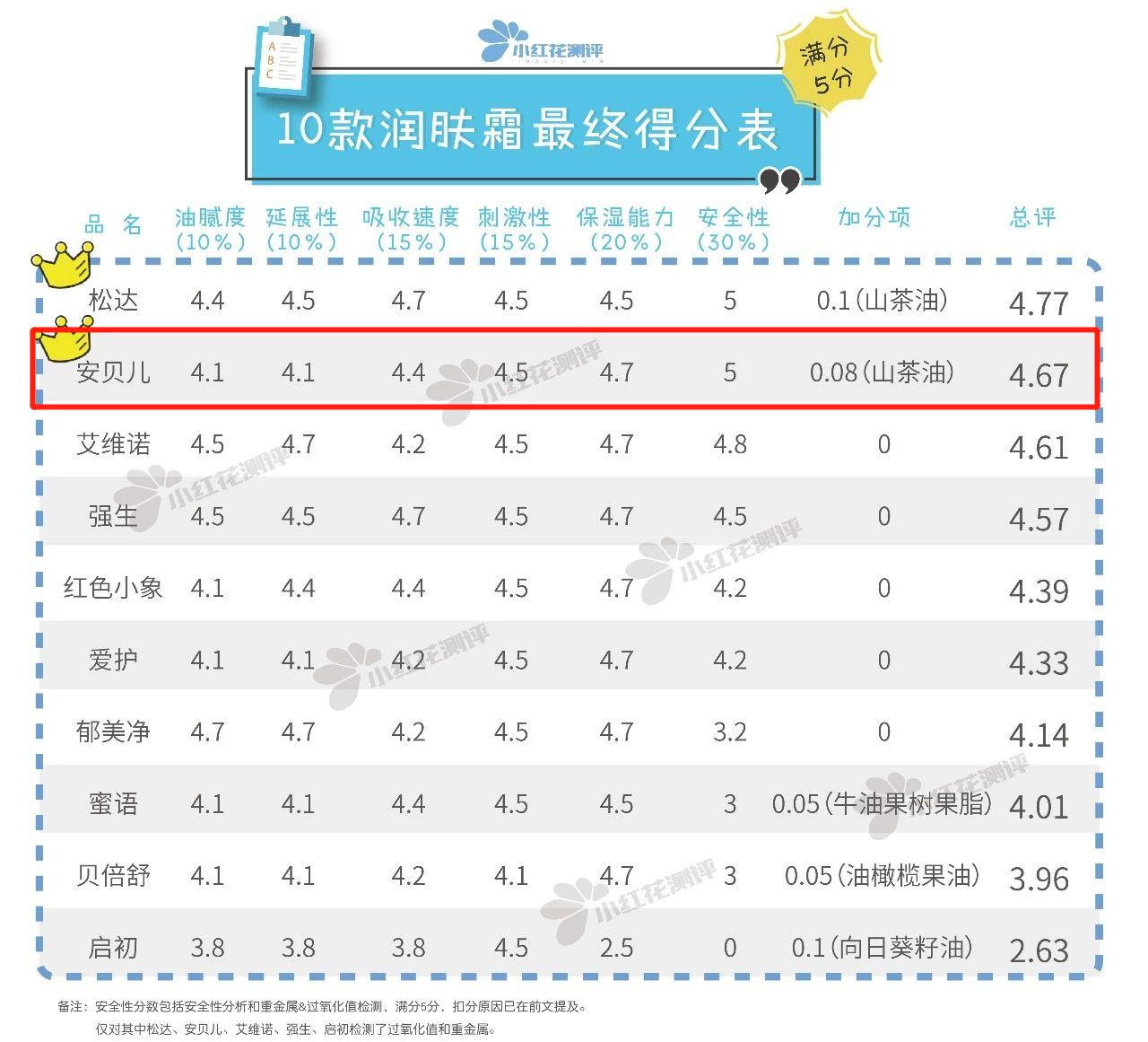 综合以上测评项目打分,安贝儿山茶油润肤霜排第二,值得推荐。