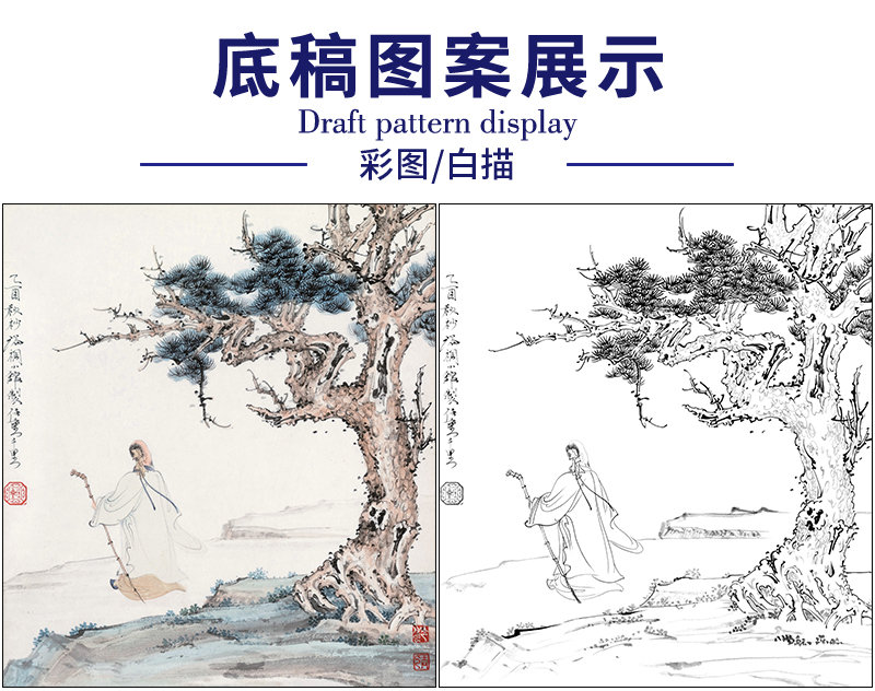 任重山水人物工笔画白描底稿《松下高仕》临摹勾线高清打印稿RD54
