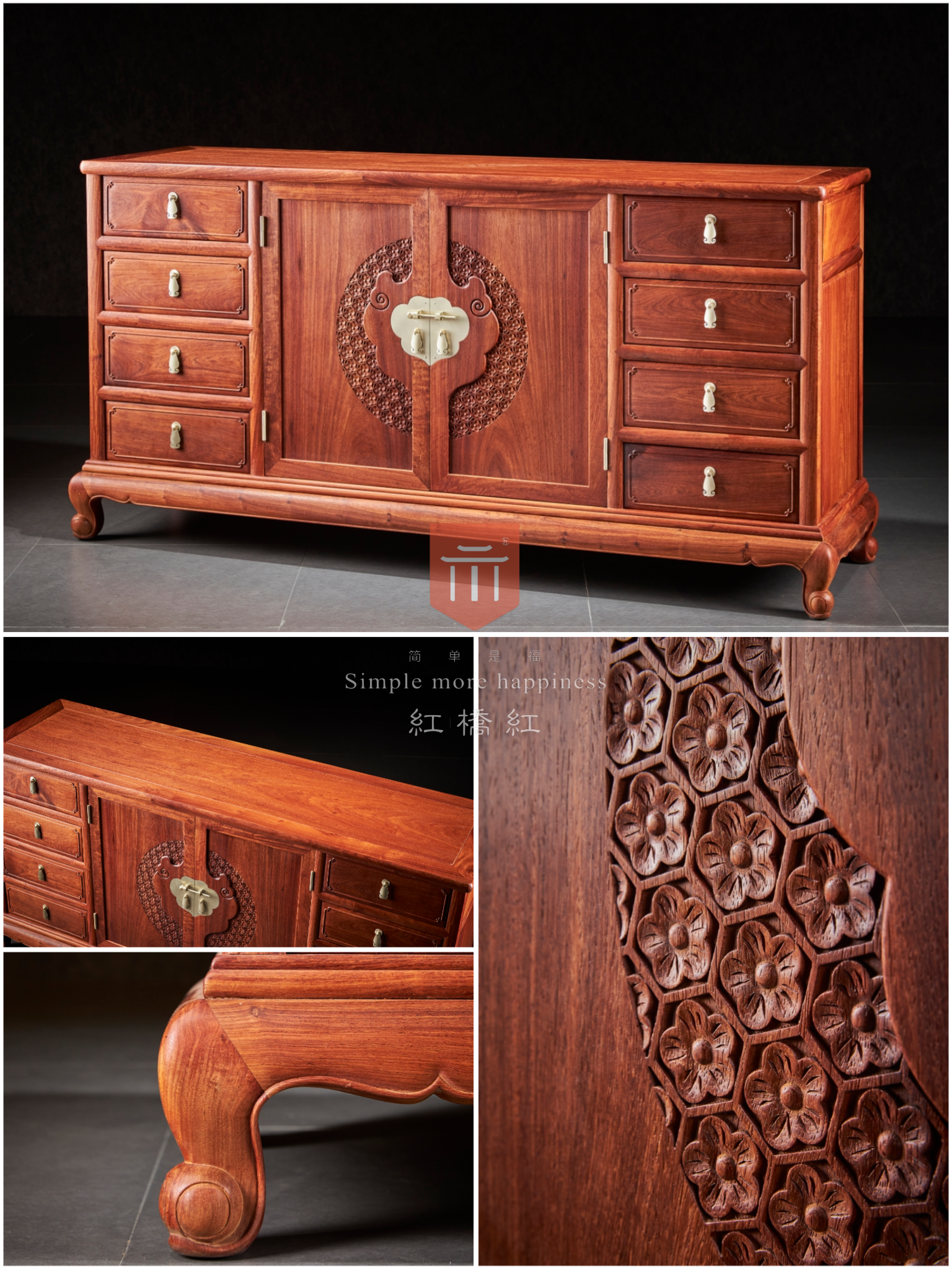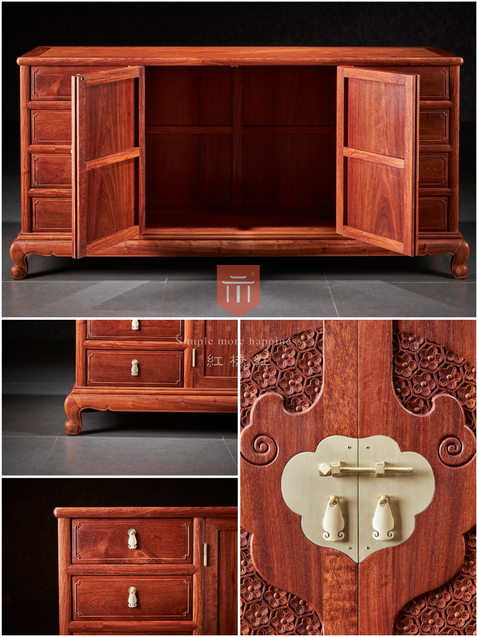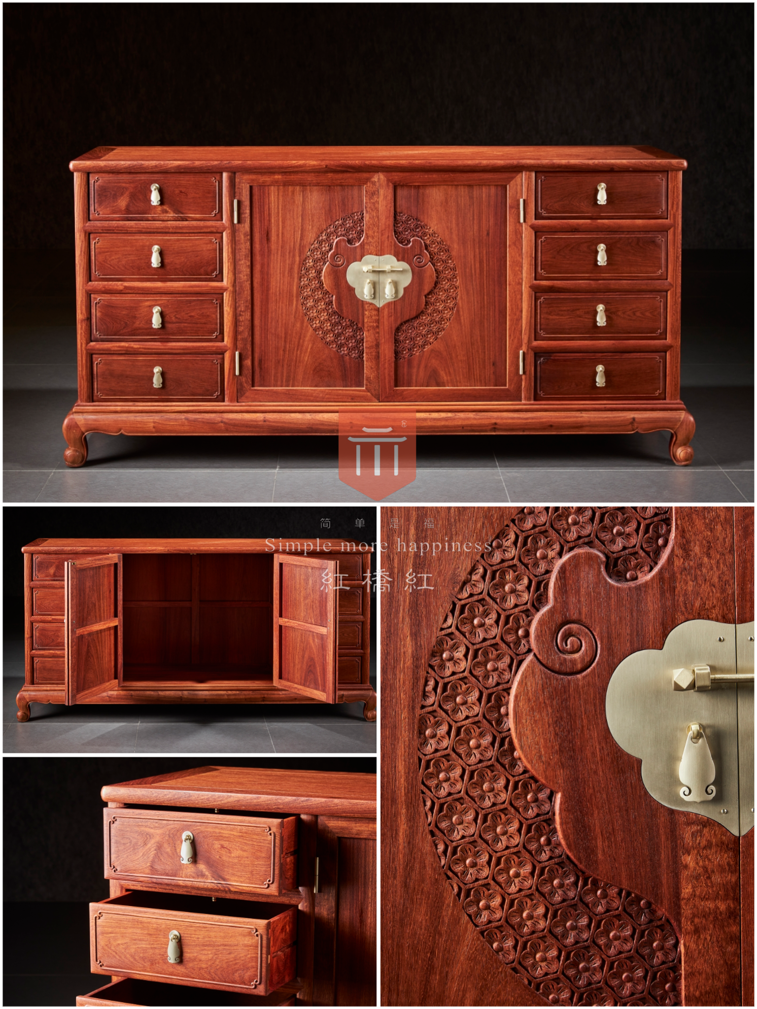 整体看似光素,仅柜门做对称如意纹,细看则处处讲究,云边包如意纹,内饰梅花,起六边格寓意和和美美,六六大顺,抽屉面板浮雕委角,简化如意纹,与柜门纹饰呼应,一曲卷云如意为生活增添诸多彩头。