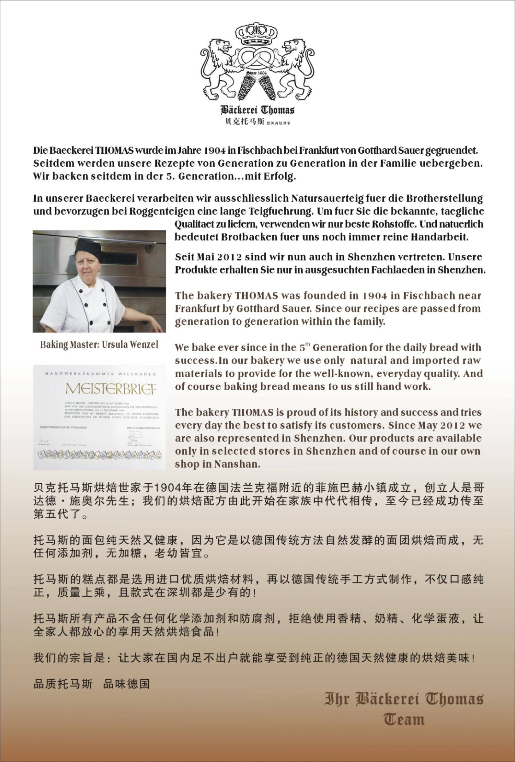 贝克托马斯于1904年成立于法兰克福;2012年传到深圳,现有5家实体门店;德国大师坚持以德国传统配方和工艺手工新鲜制作,健康,天然,无添加,用真心烘焙!贝克托马斯一有历史有故事真材实料值得信赖!