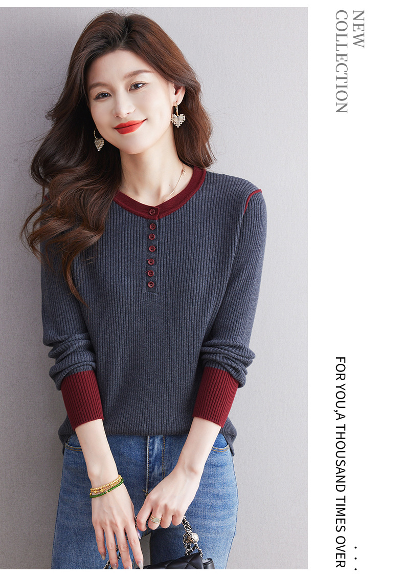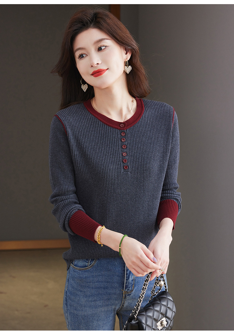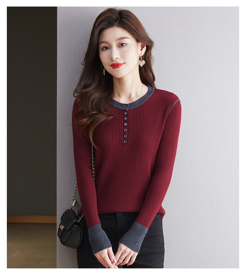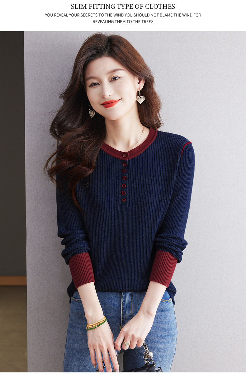 CC-27-24200设计感撞色圆领修身毛衣女秋冬2024新款坑条短款内搭针织打底衫
