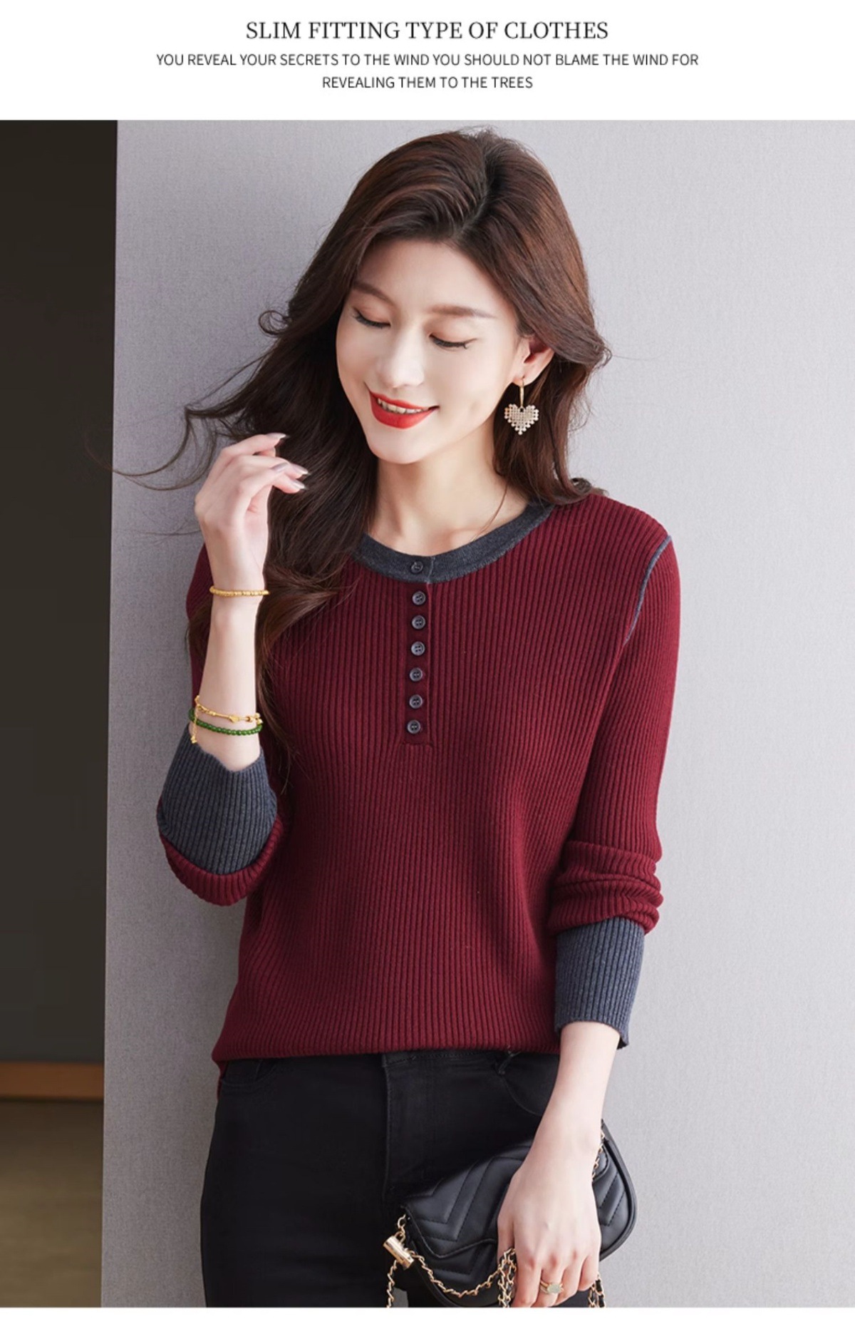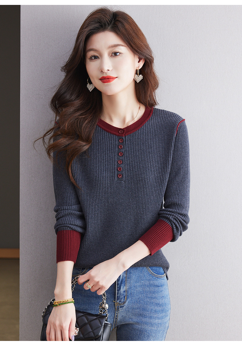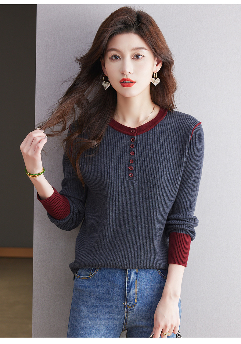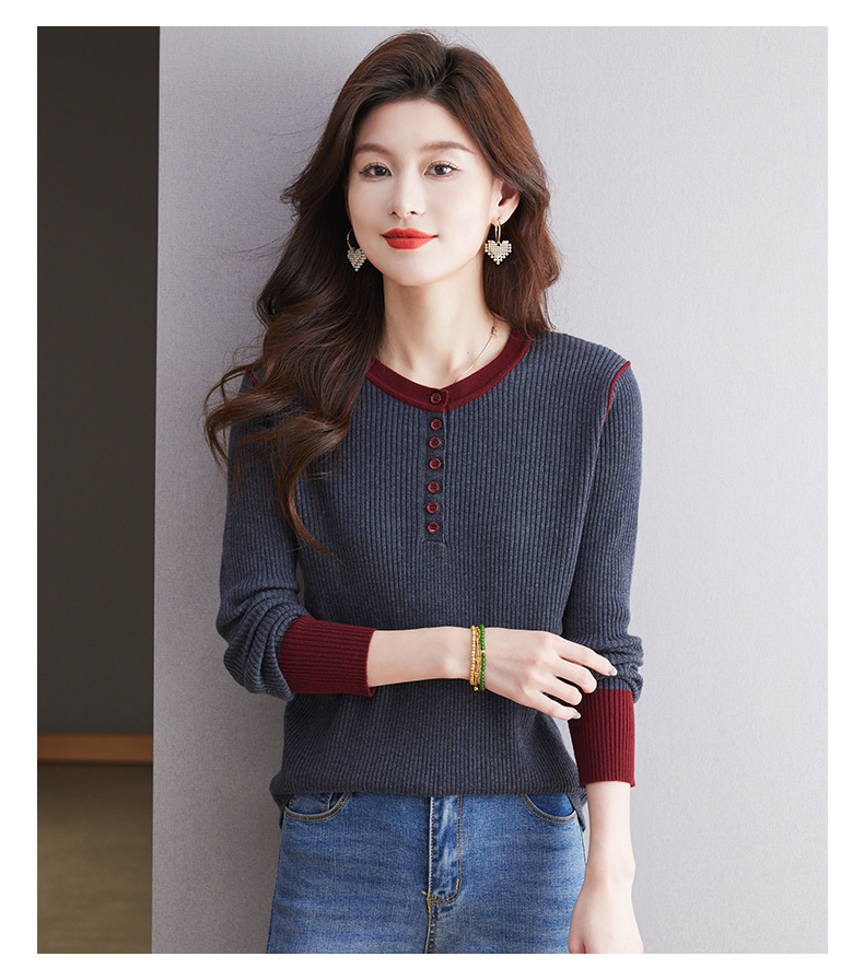 CC-27-24200设计感撞色圆领修身毛衣女秋冬2024新款坑条短款内搭针织打底衫