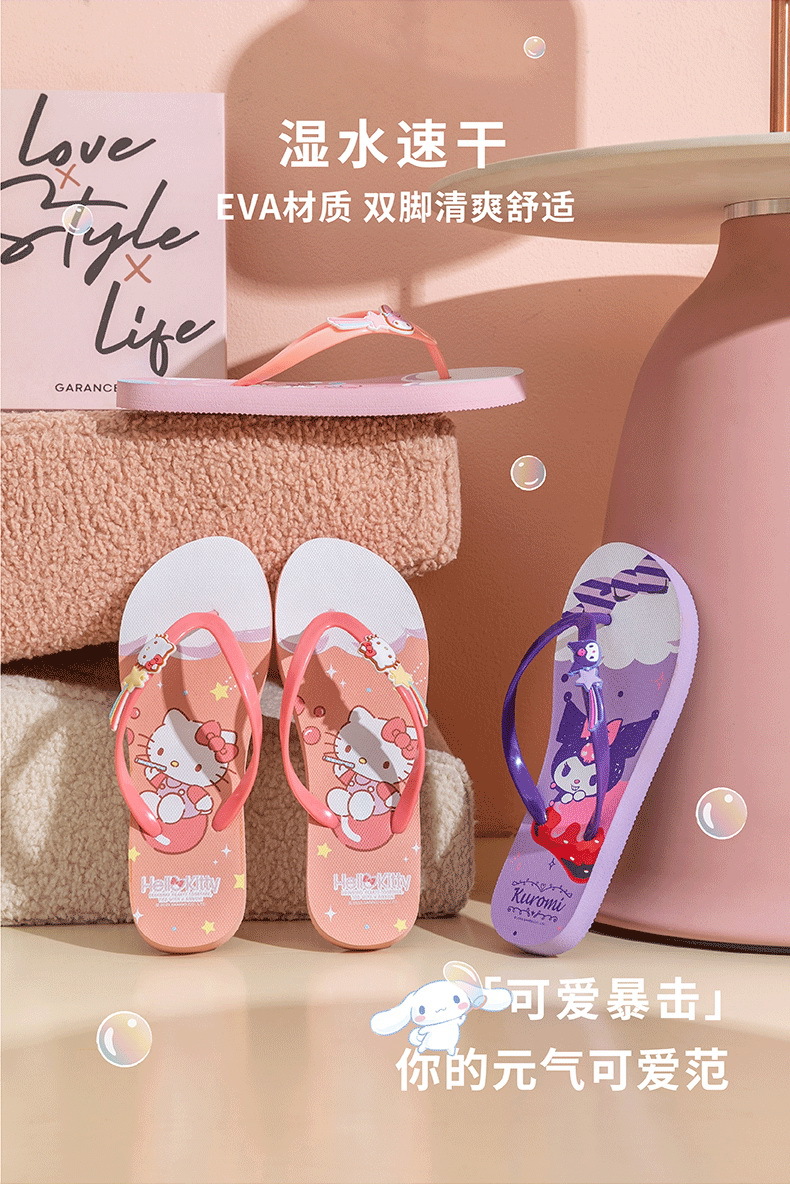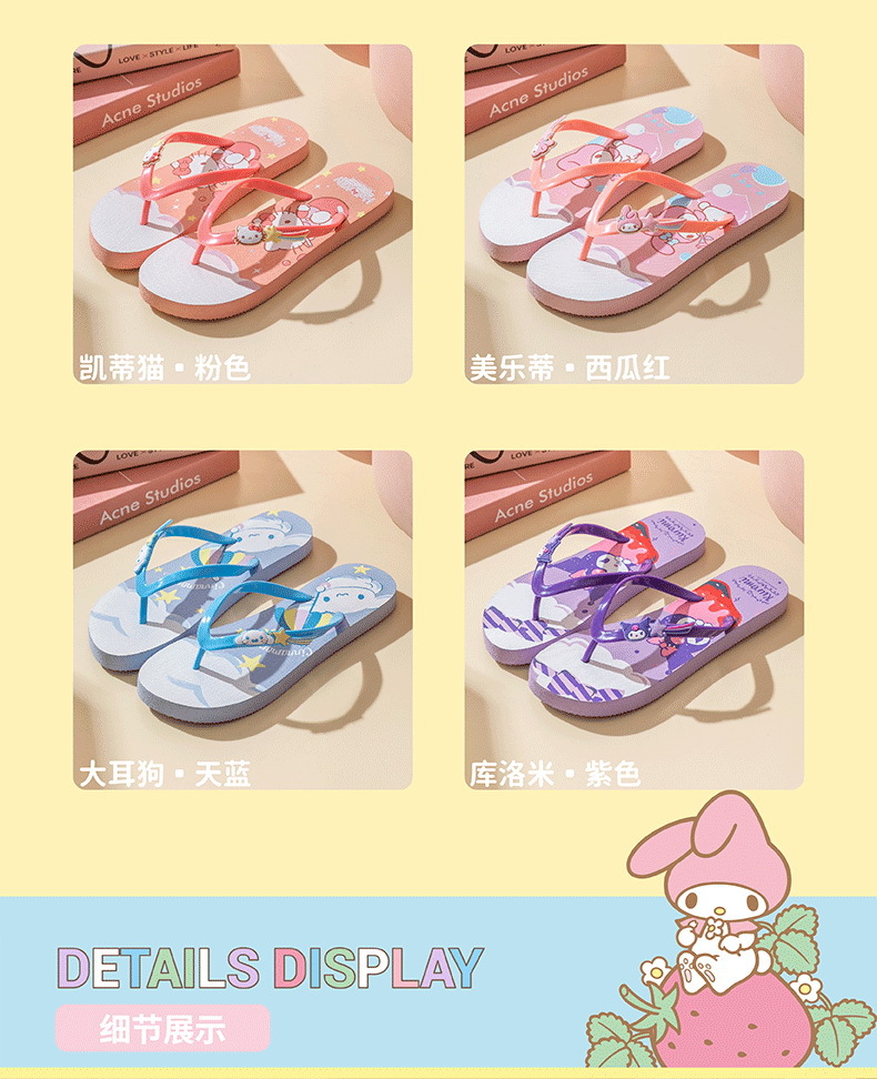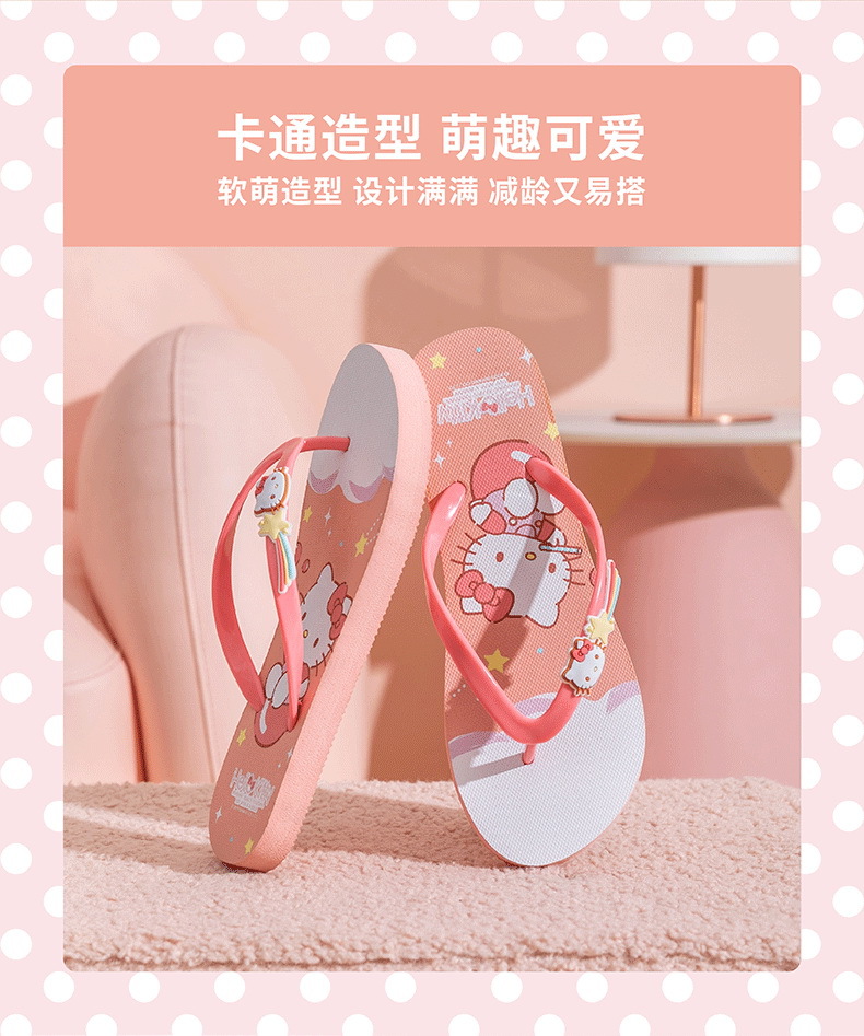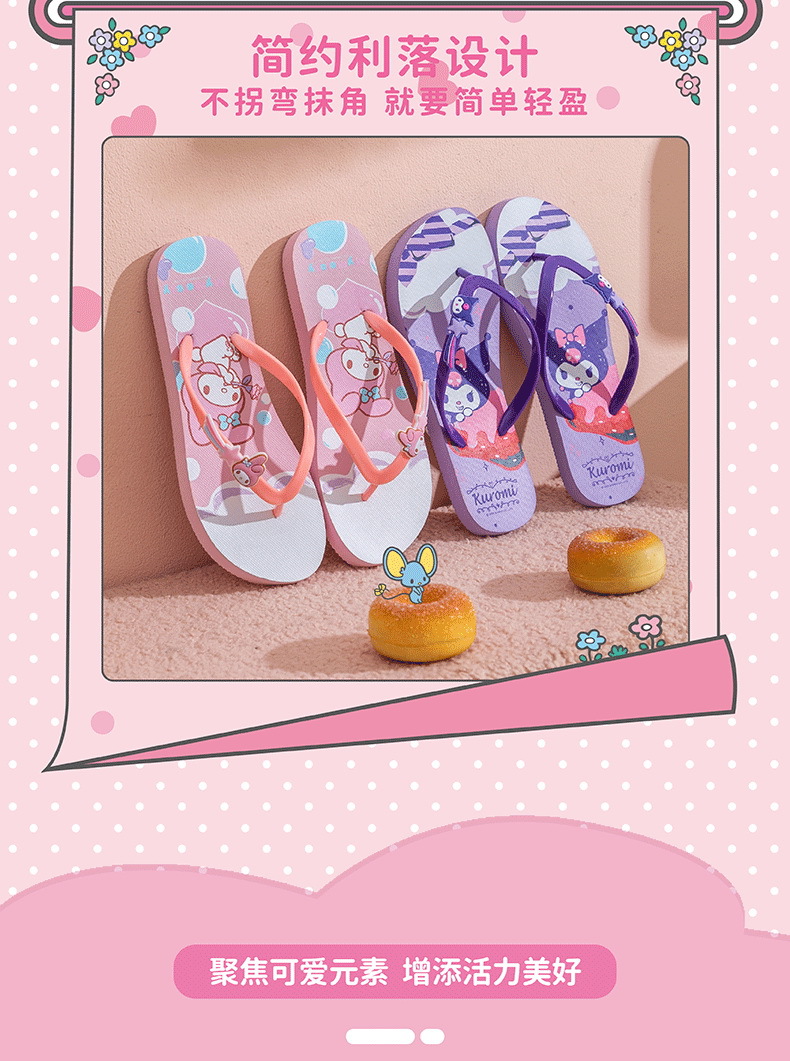 【轻便舒适,潮流百搭】三丽鸥凯蒂猫 玉桂狗美乐蒂 库洛米拖鞋 女大童成人人字拖 户外凉拖沙滩拖鞋-QQ