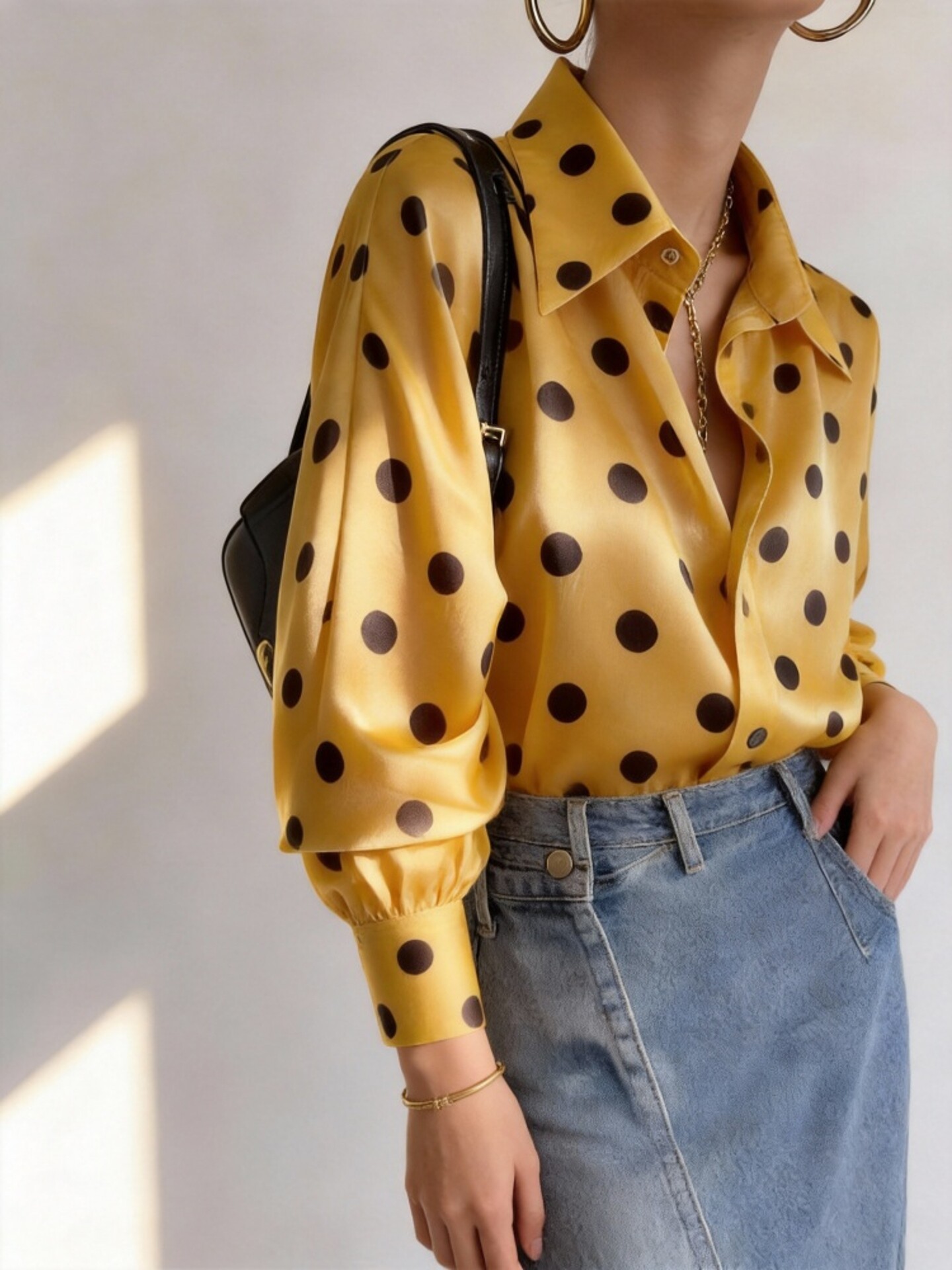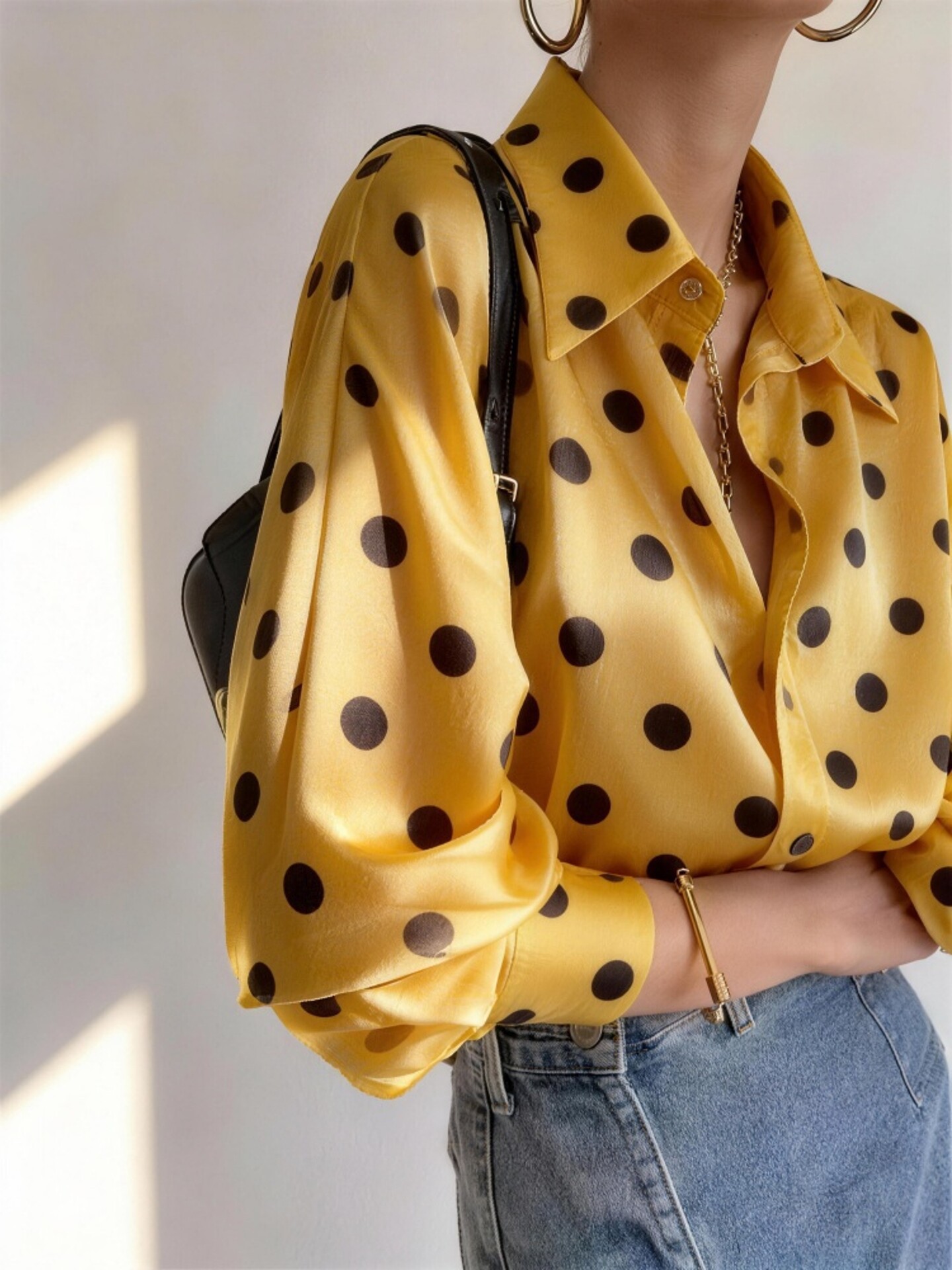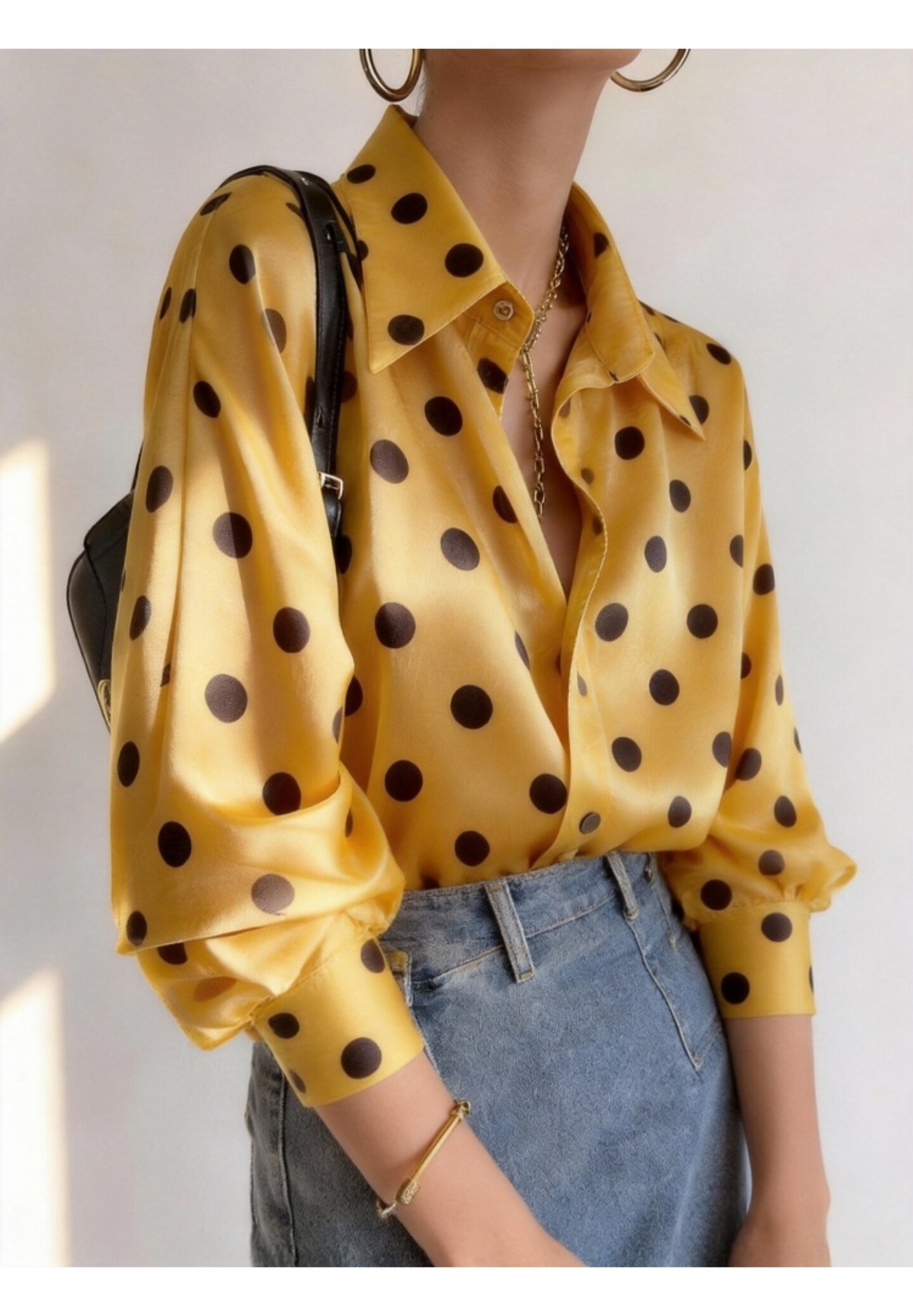 丁摩 独特漂亮巨好看黄色波点衬衫女内搭法式醋酸缎面小衫6ZF-6165