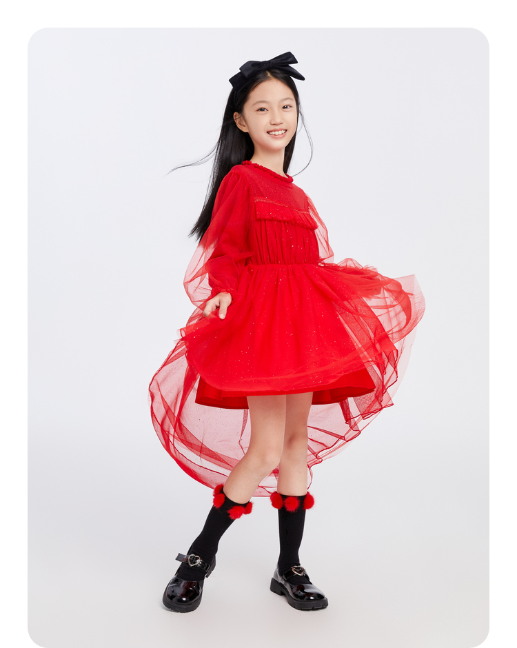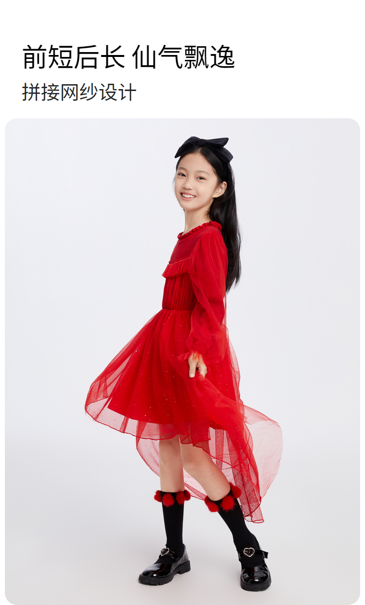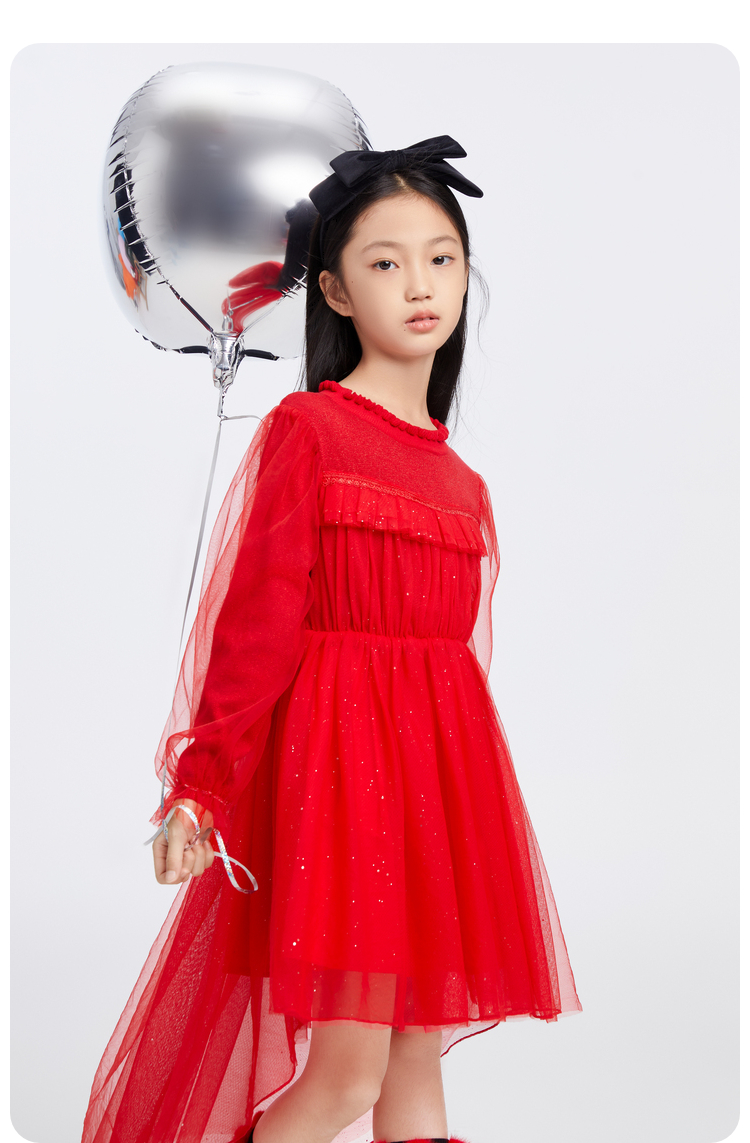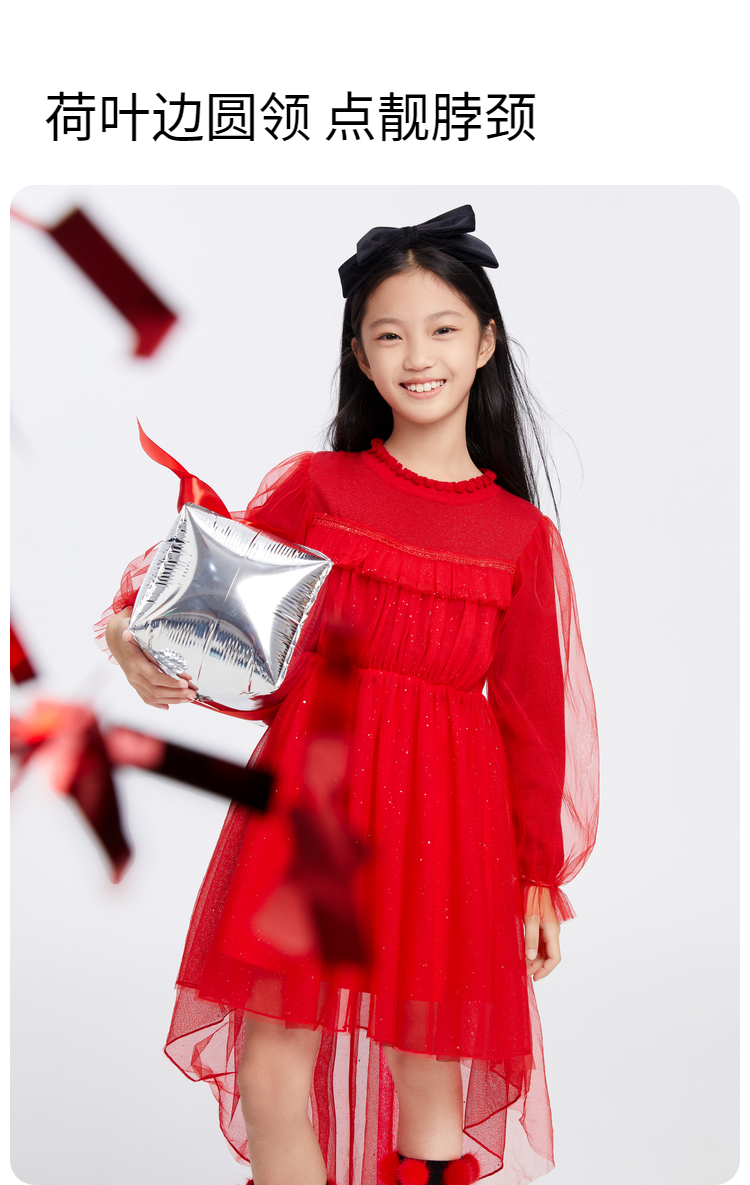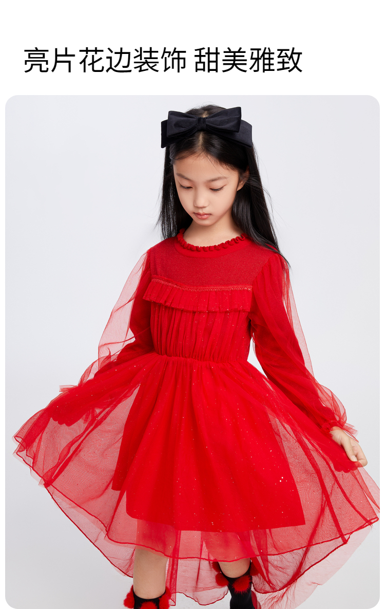 【新年红】女童甜美洋气时尚宽松网纱长袖连衣裙安奈儿童装EG344173