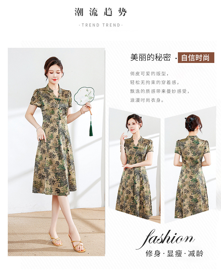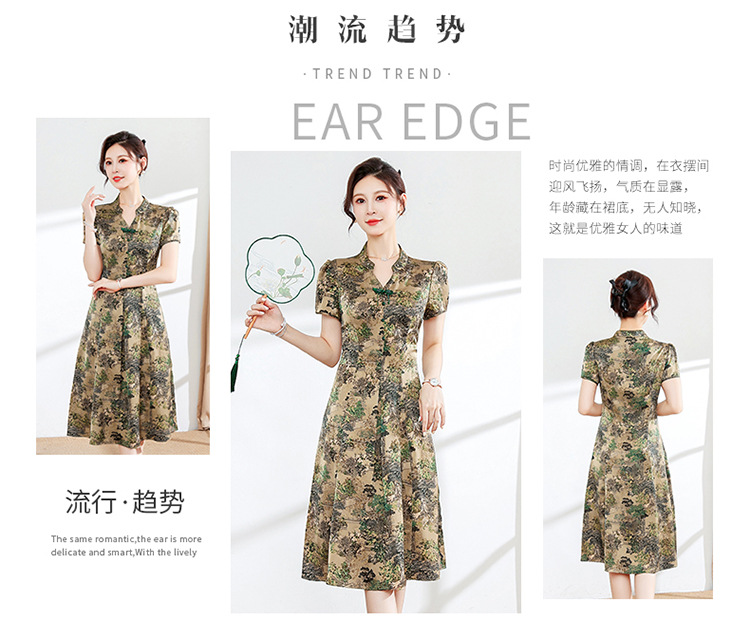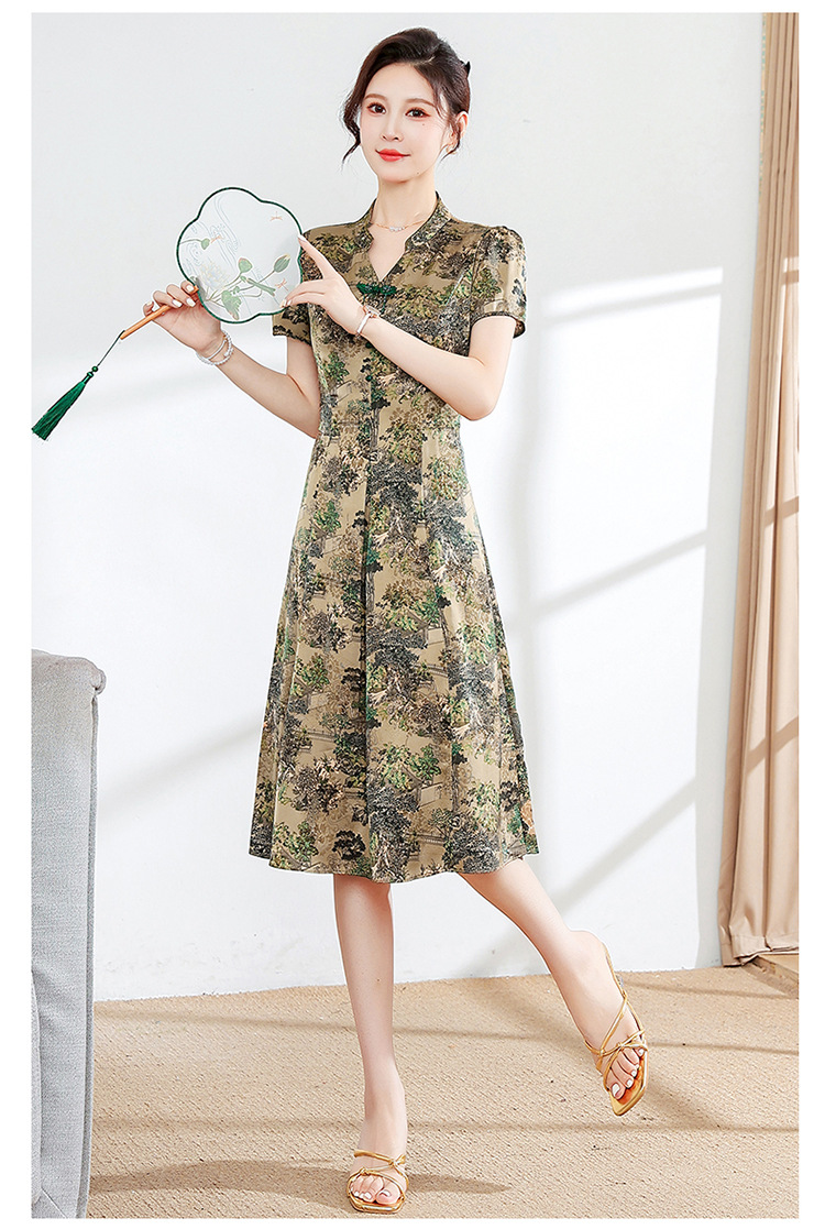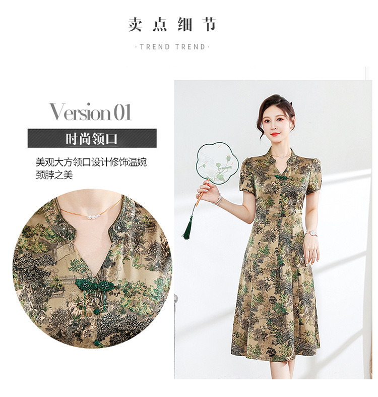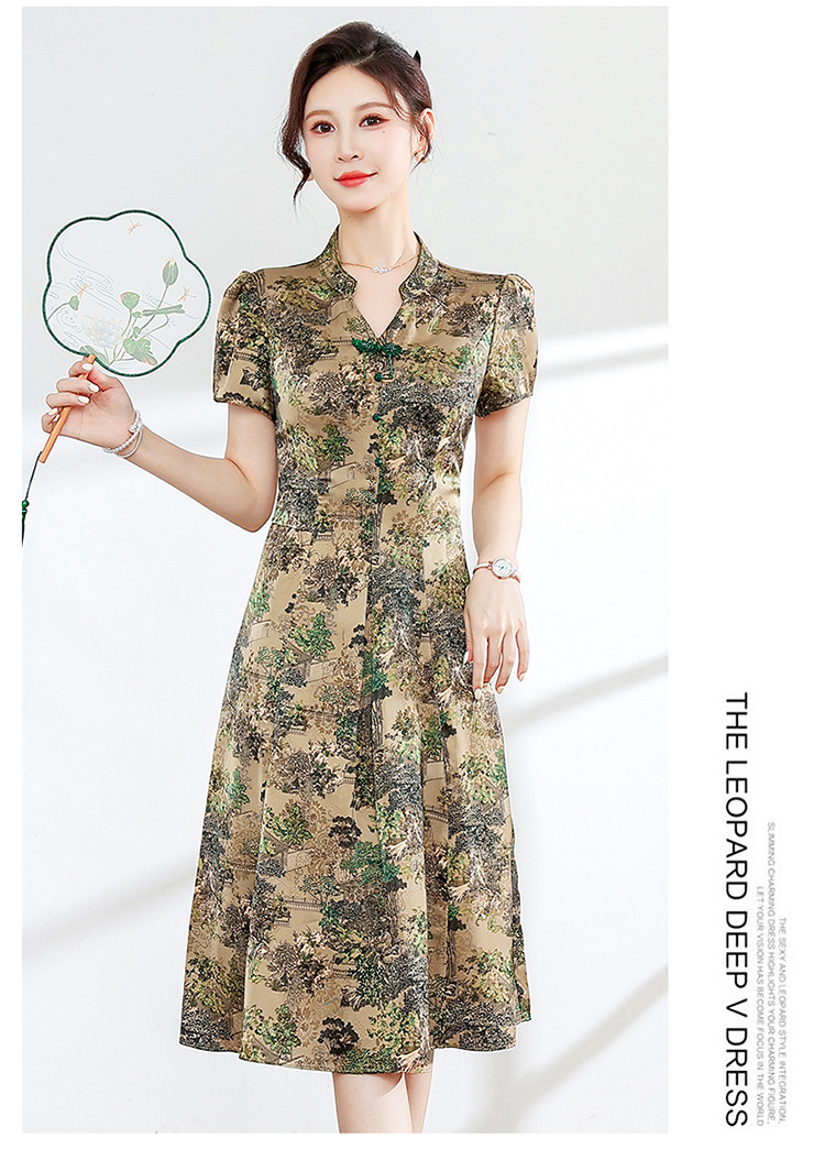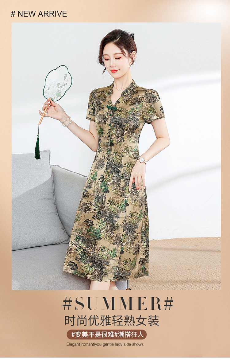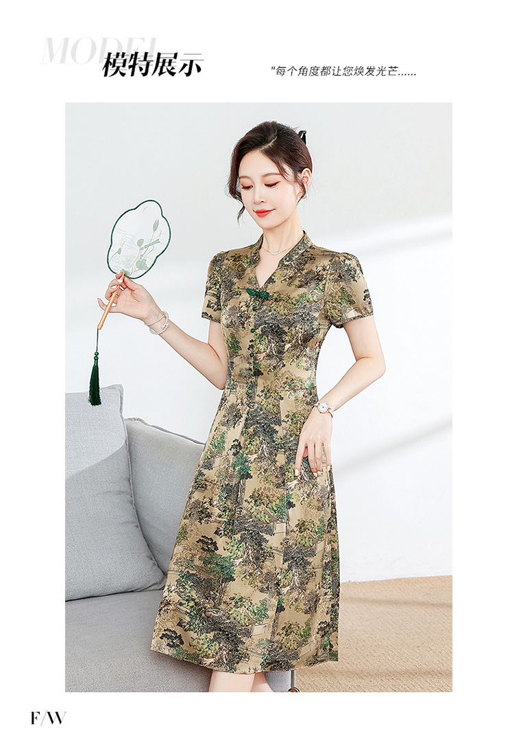 夏季印花,小V领短袖裙中年妈妈装气质中长裙复古旗袍裙QYM-YX-HY230139-Y
