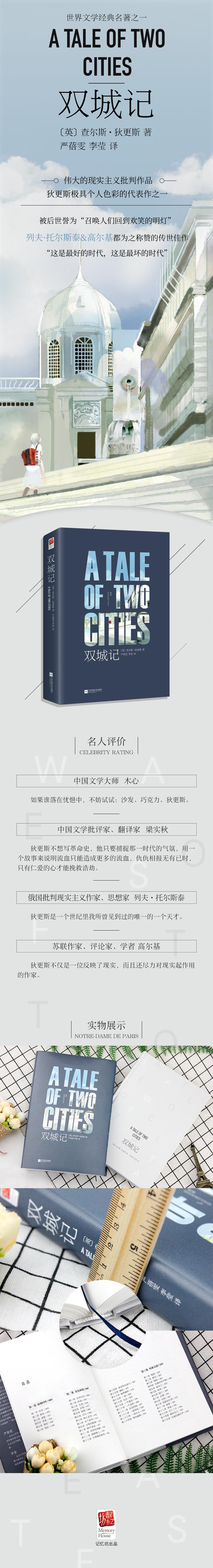 ◎世界文学名著之一,“这是优选的时代,这是最坏的时代”,深刻揭示法国大革命时期的真实黑暗。《双城记》是狄更斯用细腻的文笔、深刻的文字创作的一部以法国大革命为背景的长篇历史小说,本书情节错综复杂、富有戏剧性,表现了冤狱、爱情和复仇的主题,描写了贵族如何败坏、如何残害百姓,人民心中积压对贵族的刻骨仇恨,导致了不可避免的法国大革命,是一部深刻揭示法国大革命时期真实黑暗的重要作品之一。◎狄更斯极具个人色彩的代表作之一,浪漫色彩和多重叙述手法有机结合,独立又交织而成的结构布局。《双城记》是狄更斯重要的代表作之一,在他的全部创作中占据着特殊的地位,同他的其他作品相比,它更能反映出作者的创作思想和艺术风貌,在某种意义上说,这部作品富有狄更斯的特色,作者身上的戏剧气质在这部作品中表现得尤为突出。◎独家译注,权威全译,内容价值至上,极具典藏意义。这部《双城记》由北京大学研究生、中国社会科学院外国文学研究所编审严蓓雯、李莹权威译注,内容质量全面提升,且对文化背景详细注释,词汇短语详细说明,译文更贴近当今时代,力求为读者呈现原汁原味的英文名著。◎精装双封,设计文艺,值得收藏。精装设计,封面大气文艺,并采用双封面包装,内文采用精装书用纸,排版舒适,与内容相得益彰。