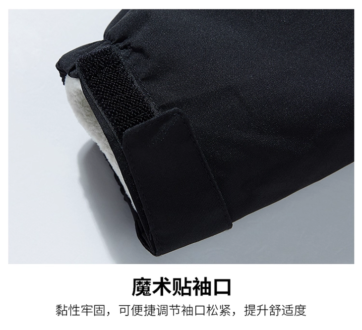 袖口部分采用了魔术贴松紧设计,天气寒冷时,将它粘住大大提高防风效果,防止冷风从袖口灌入。 魔术贴采用缝合设计,所以不用担心多次使用会导致魔术贴脱落。