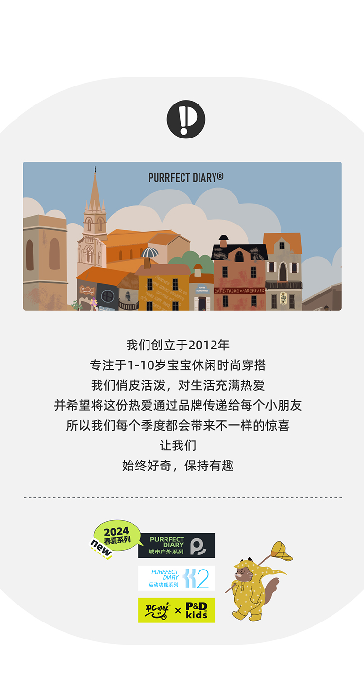 - Purrfect-Diary专注于贴近自然随性的穿着概念,轻奢平价的童装文化传播,在产品设计上更加注重婴童穿着的舒适性、安全性、更出众的国际化品牌,将欧美的育婴文化在中国进行深入的传播与推广。