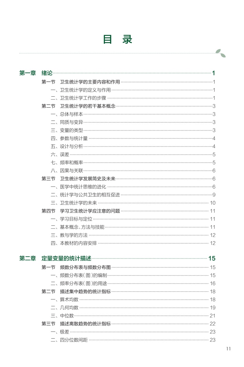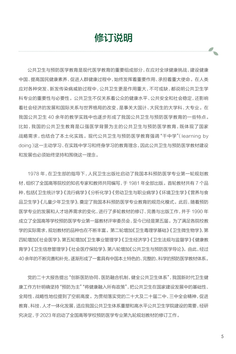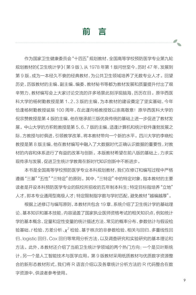 本版教材以第8版内容为基础,初步考虑做如下主要修改和调整:①对章节中的示例进行必要的更新;②删除**章“数据关联的探索” ,有关知识点融合到**章和第十章“直线相关与回归”;③第十四章 “调查研究设计”修订为“观察性研究设计”,增加尽可能融合前面章节数据分析方法的“综合性案例分析”; ④“第十八章 卫生统计学的发展”内容融合到“绪论”中;⑤在“第十九章 数据分析的其他内容”中,补充环境暴露、传染病监测数据。