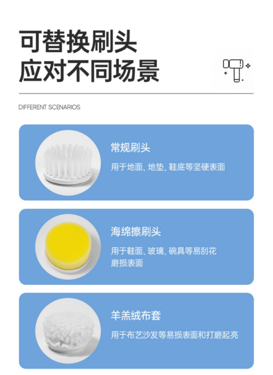 搭配三种刷头,满足不同清洁需求