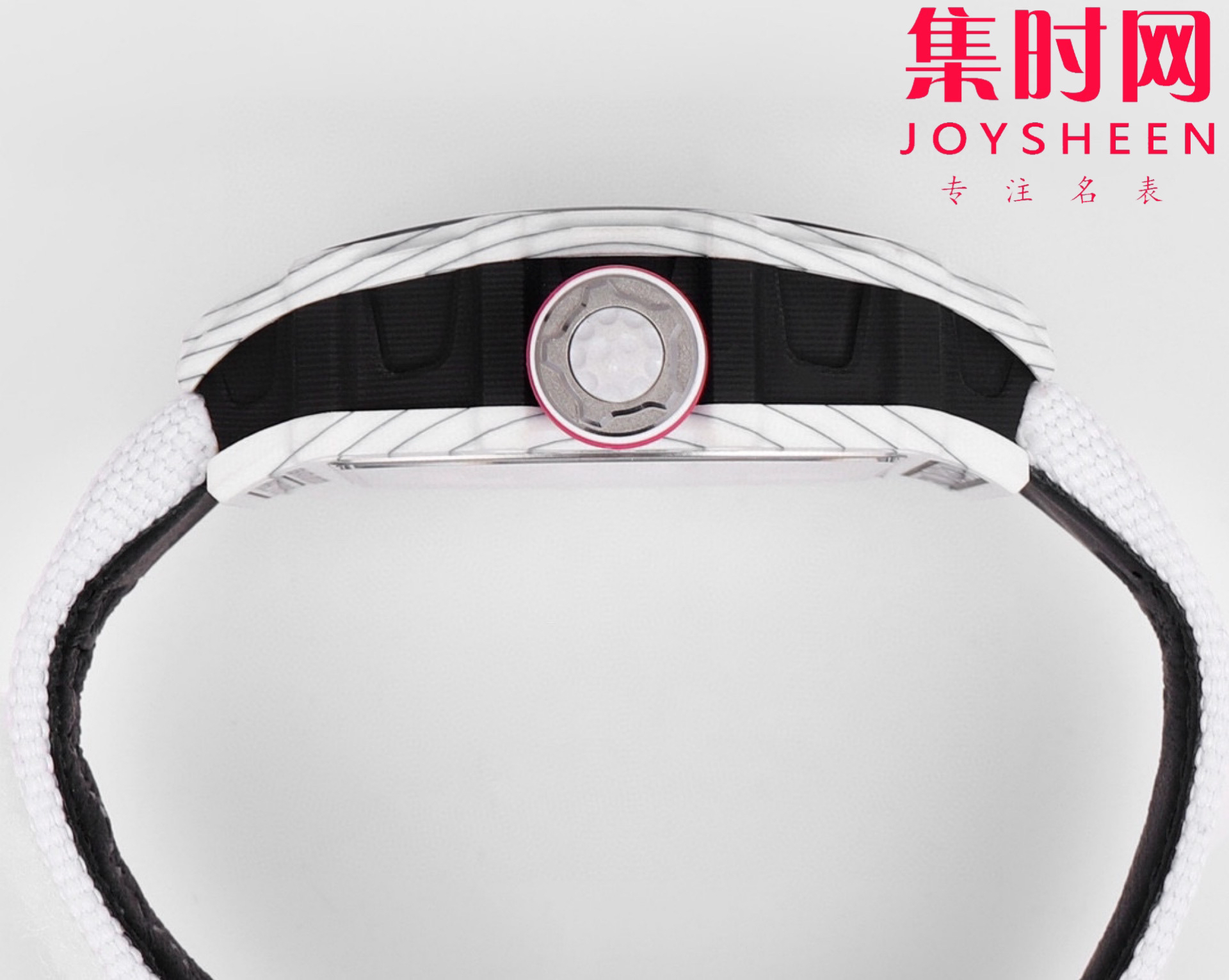 新作表圈和底盖采用粉色和白色石英碳纤维复合材料加工而成,中层表壳则以碳纤维和粉色石英碳纤维制成,每一个表壳都有独一无二的交错纹理。梯桶形表壳能够更舒适紧密的贴合手腕,表冠巧妙模仿高尔夫球的凹凸造型,是颇为有趣的细节。