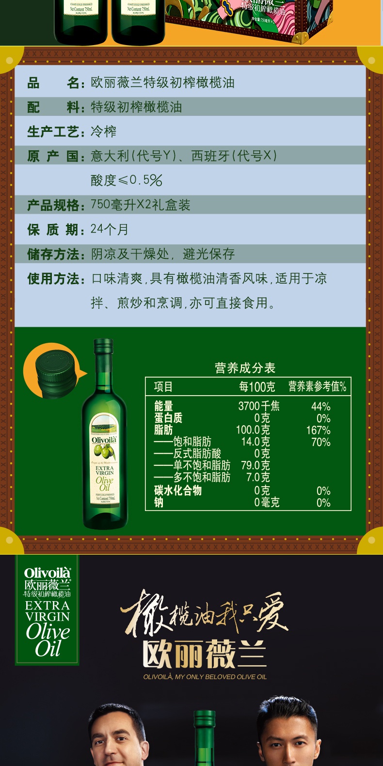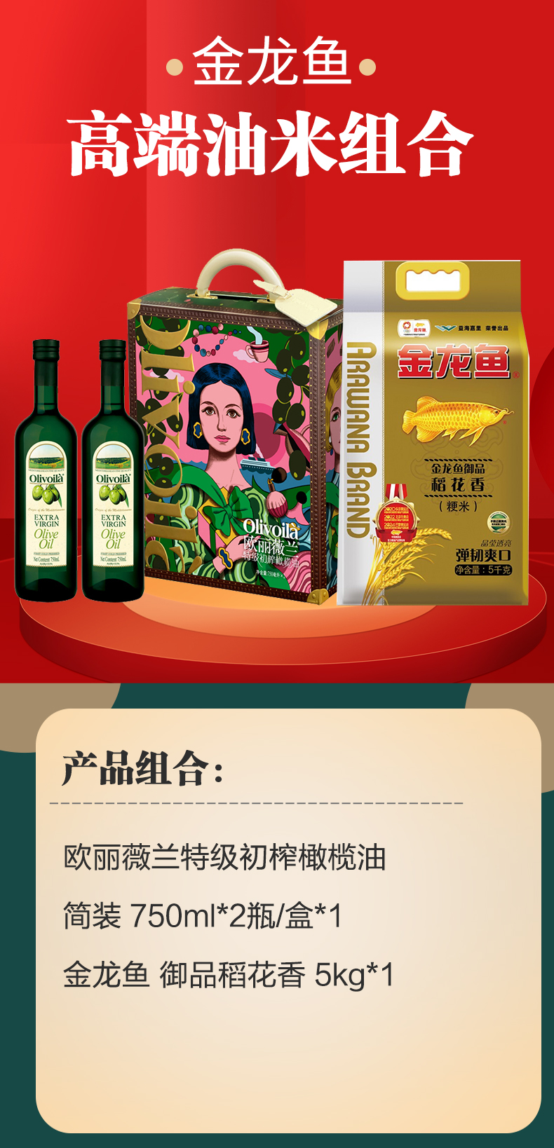 高端米油组合(欧丽薇兰特级初榨橄榄油750ml*2瓶/盒+金龙鱼 御品稻花香 5kg)
