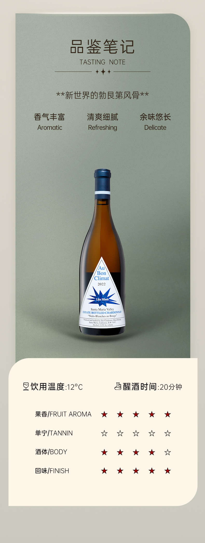 奥邦酒庄夜光霞多丽 2022 Au Bon Climat Nuits-Blanches au Bouge Chardonnay
