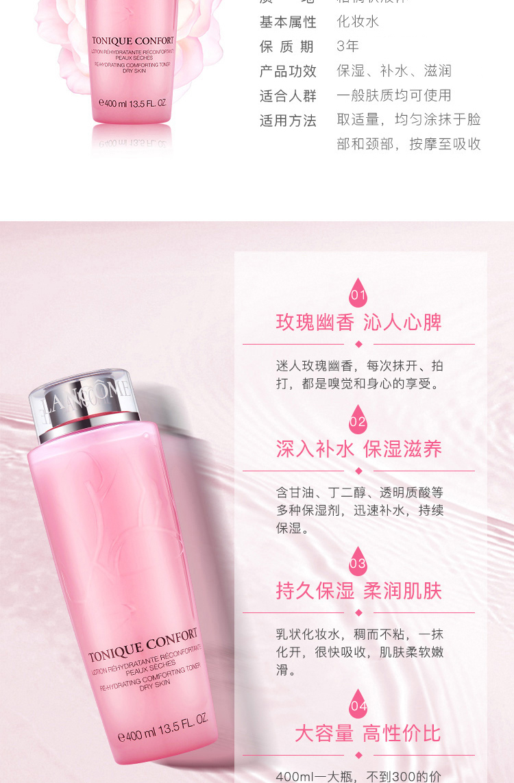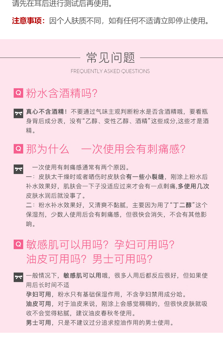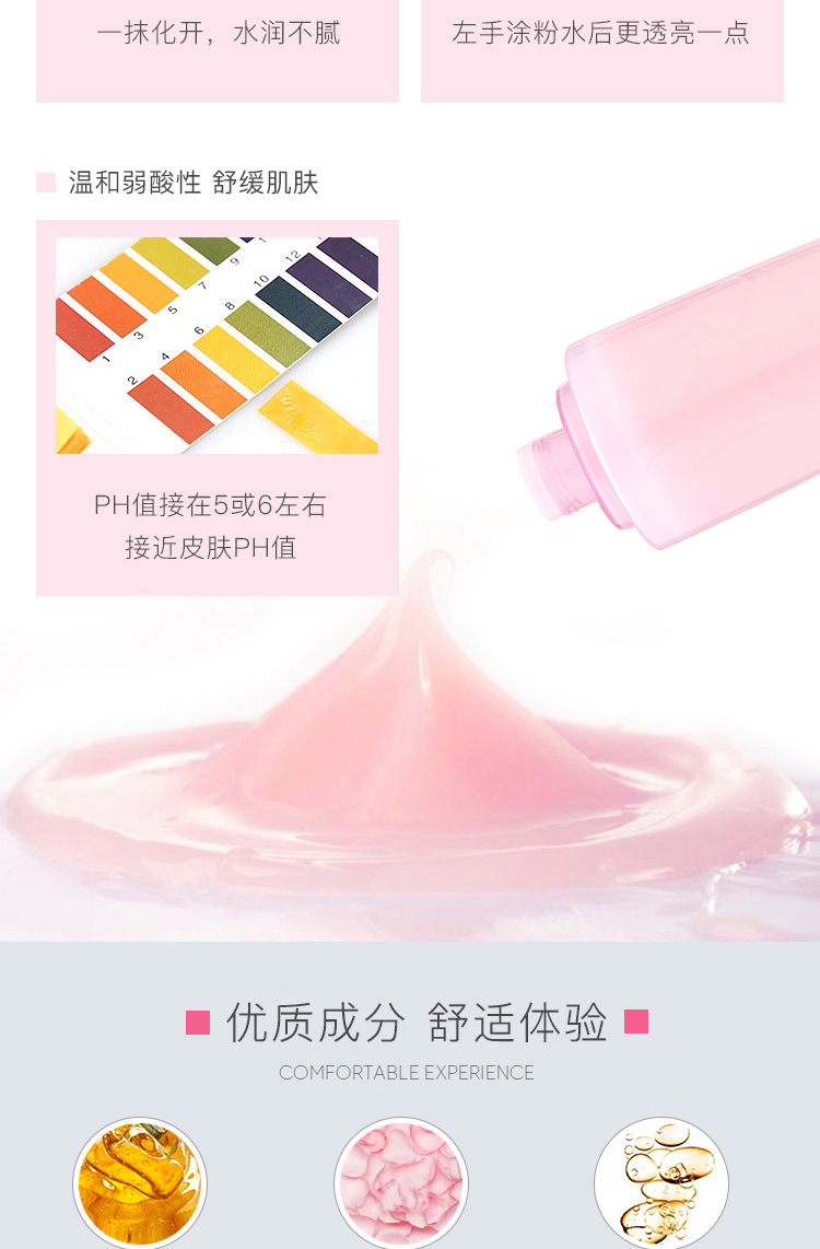 2、它适合多种肌肤,特别对中干性的皮肤真的很友好,能够缓解换季时的干燥泛红。质地温和是它受好评的一大点,这款粉水经过了敏感性肌肤的消费者们试验的反馈,几乎没有出现不适的反应,担心的可以先局部使用(第一次用会觉得有些刺痛感,那说明你的肌肤严重缺水)