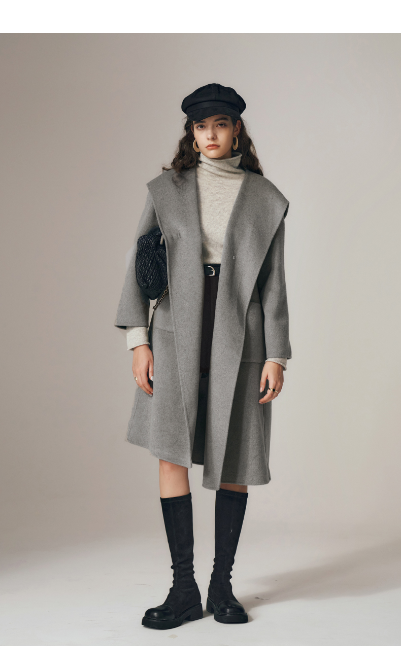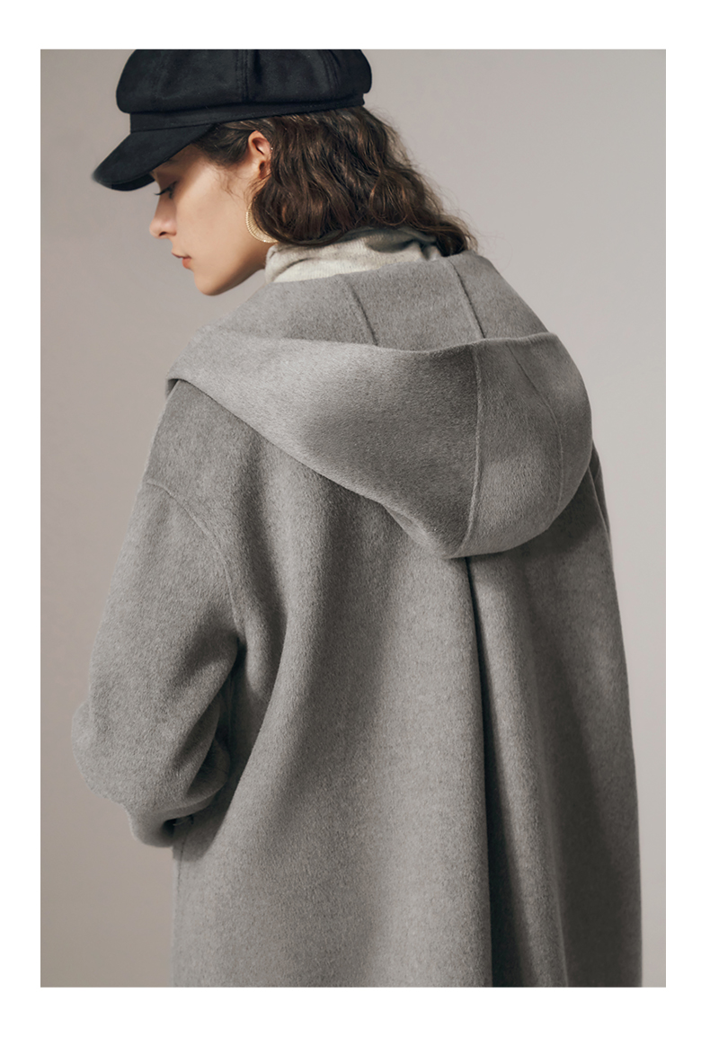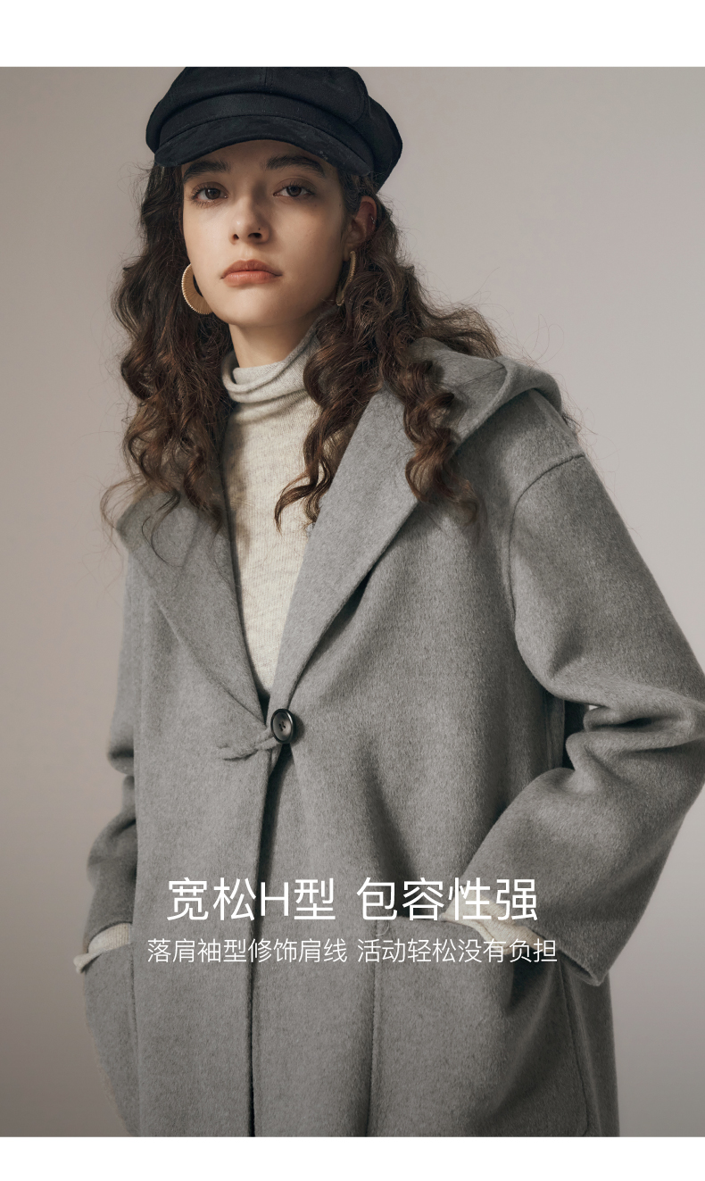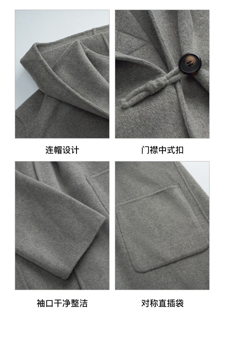 OLrain欧芮儿连帽双面毛呢外套女初秋2023新款高级感收腰长款大衣