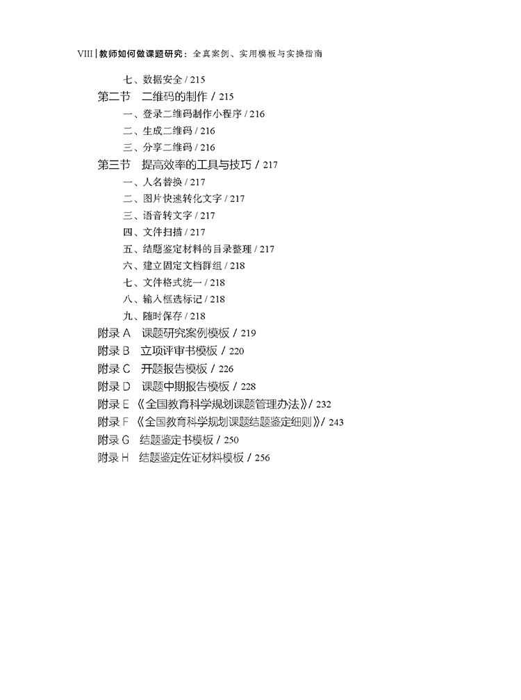 教育课题研究的终极目标是总结学术思考的成果,改进教育现状,促进教育发展。很多从事教育工作的读者希望参与课题研究,但又觉得课题研究很难,不知从何入手。为了帮助这些有志于教育研究的读者,本书应运而生。它紧密结合读者的实际需求,以通俗易懂的方式,引领读者从零开始,逐步掌握课题研究的全过程。书中不仅详细讲解了课题研究的每一个环节,还提供了丰富的全真案例、实用模板和详细的实操指南,帮助读者在实践中快速上手,积累经验。本书适合中小学教师、师范院校师生阅读和使用。当然,任何对教育课题研究感兴趣的读者也可以通过阅读本书了解相关信息。