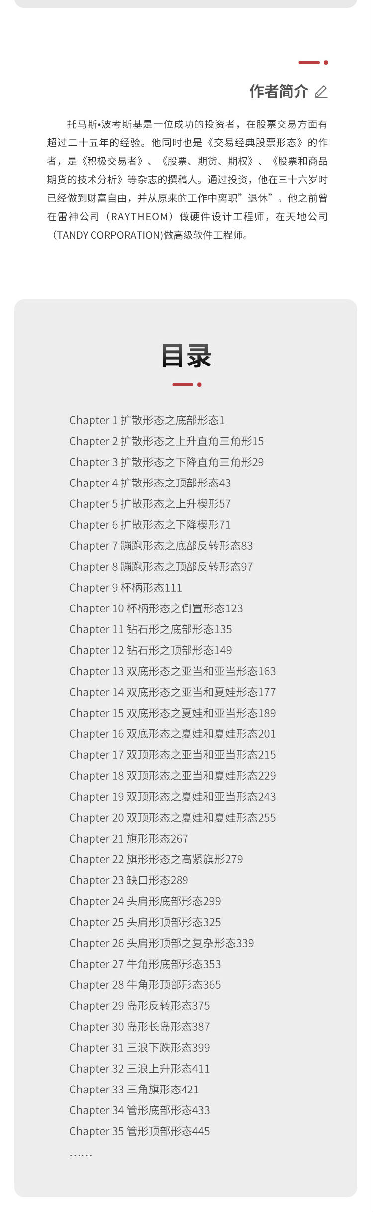 托马斯?波考斯基是一位成功的投资者,在股票交易方面有超过二十五年的经验。他同时也是《交易经典股票形态》的作者,是《积极交易者》、《股票、期货、期权》、《股票和商品期货的技术分析》等杂志的撰稿人。通过投资,他在三十六岁时已经做到财富自由,并从原来的工作中离职”退休”。他之前曾在雷神公司(Raytheom)做硬件设计工程师,在天地公司(Tandy Corporation)做高级软件工程师。