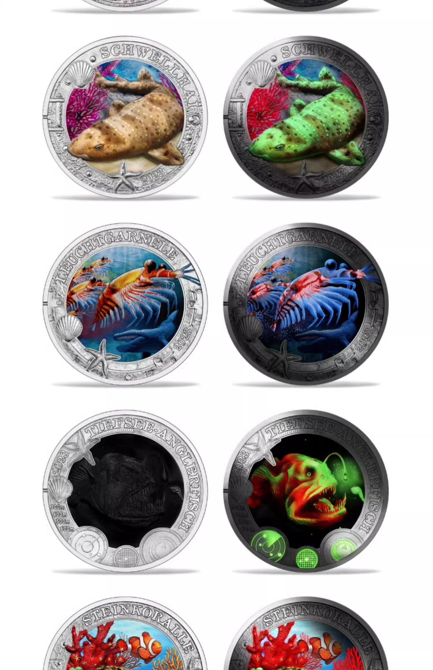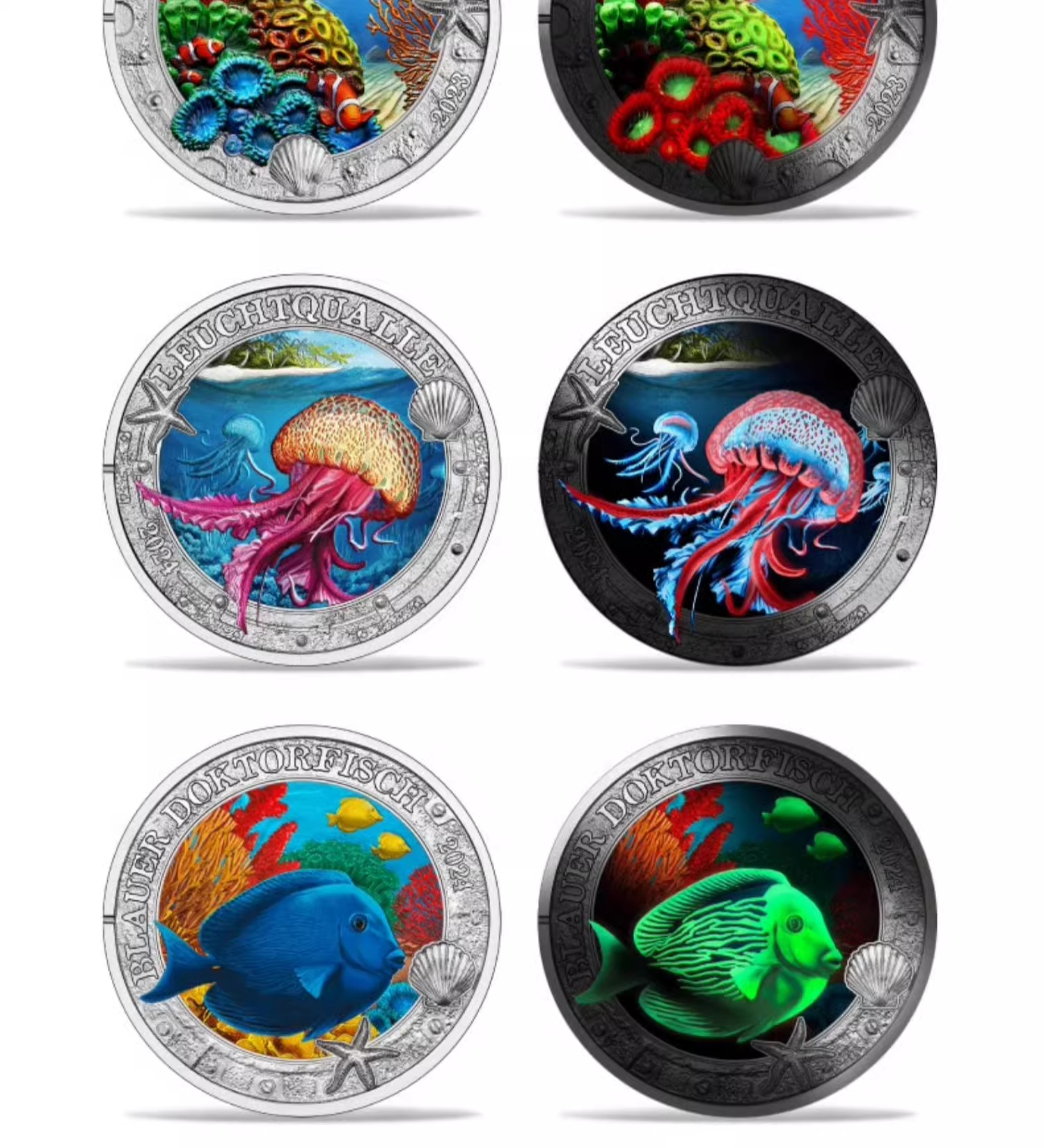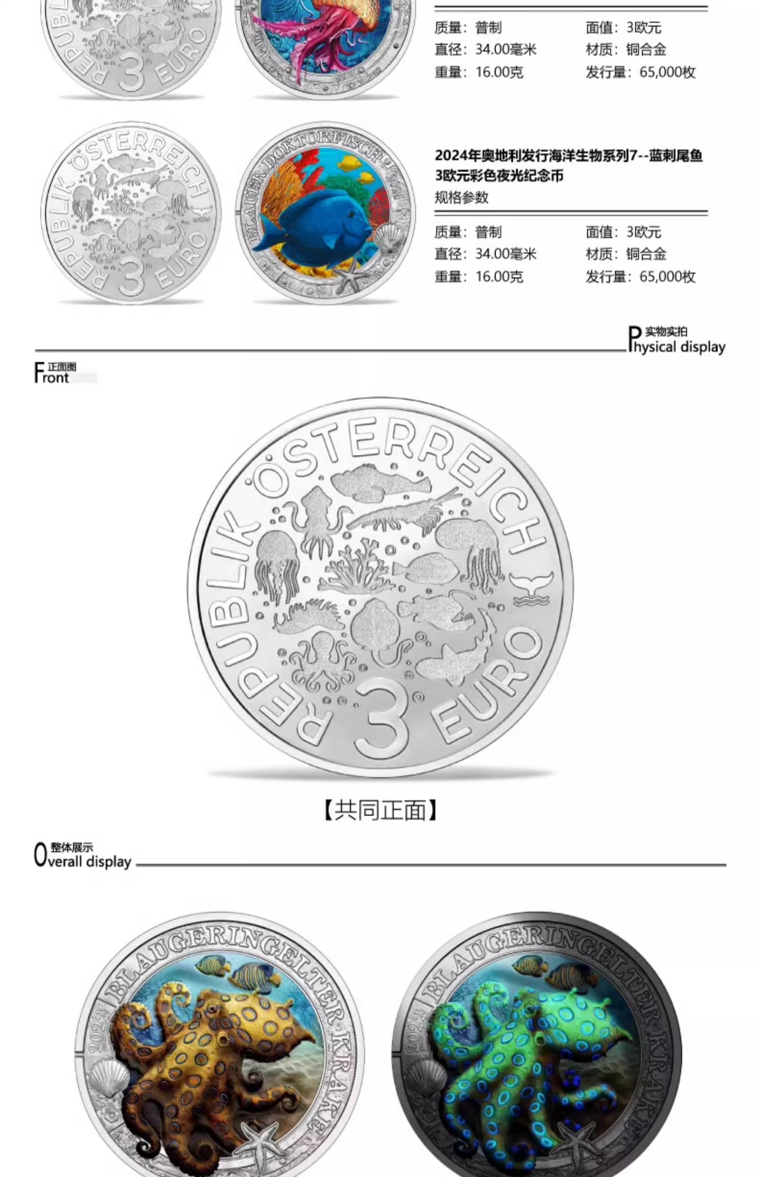 彩色荧光币!奥地利海洋生物系列纪念币(1-7枚)