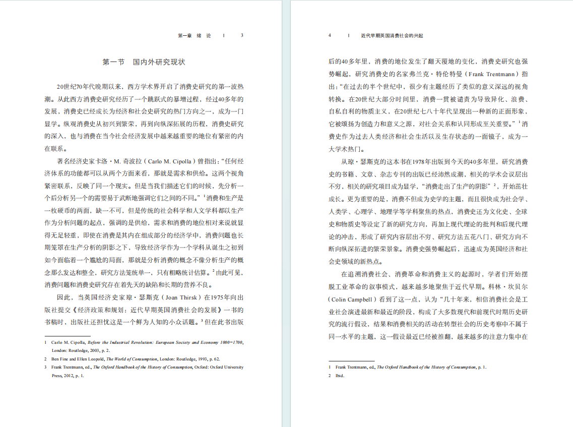 消费史是最近四十年兴起的新兴学科和研究领域,作为最前沿的研究方向之一,在西方学术界仍呈现出蓬勃的发展势头,本书在借鉴西方研究成果的基础之上,形成了自己的学术话语和理论体系,在学术界首次提出了判断消费社会形成的四大标准,首次提出了区分近代早期中等阶层的方法是生活方式,厘清了英国消费社会兴起的原因,从消费视角重新审视了近代早期英国的社会转型,突破了以生产为分析起点的传统研究的理论框架,更为清晰地解释英国为什么会率先出现工业革命,英国的市场经济体制为什么能够从传统社会中突围而出。