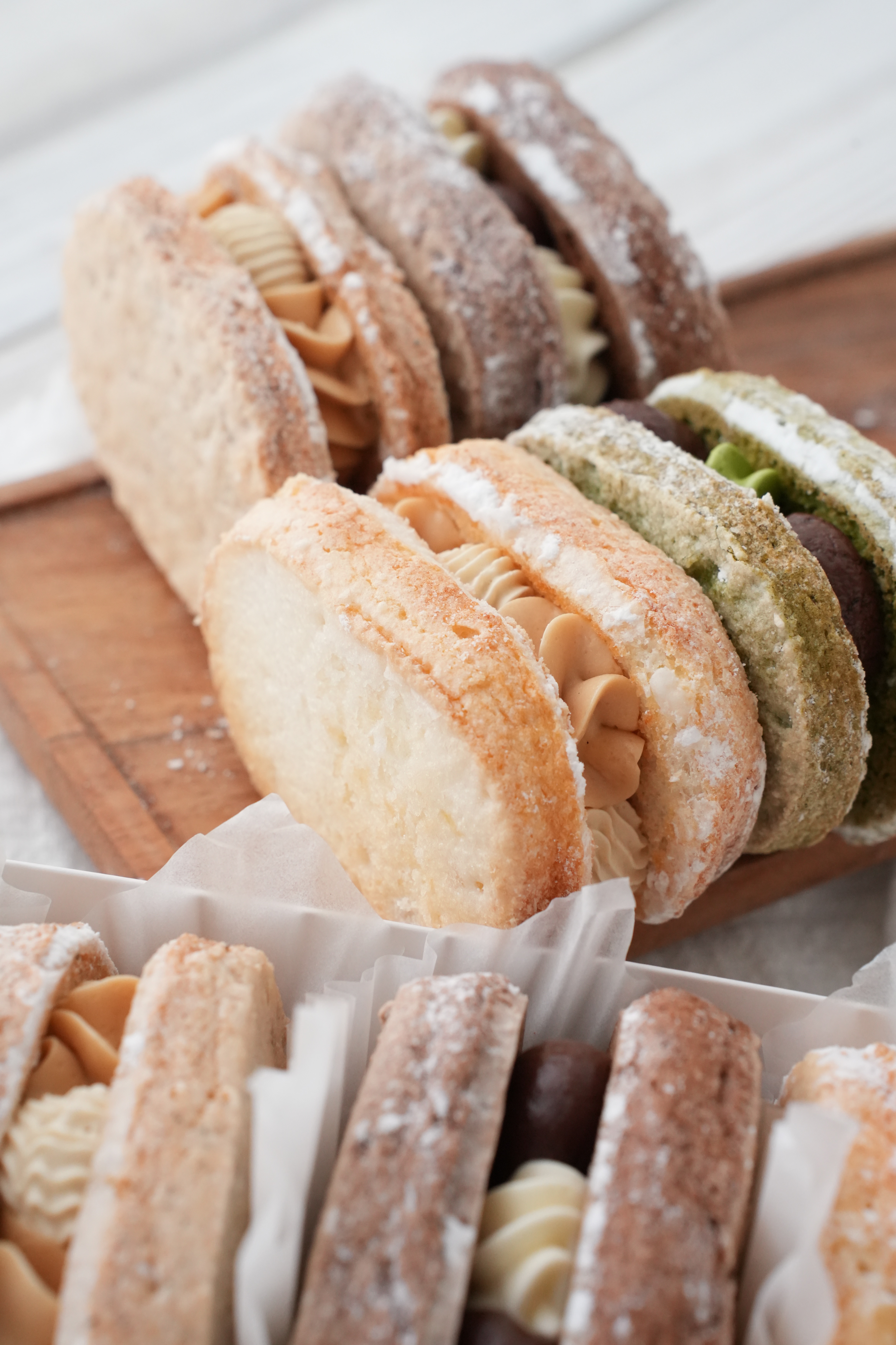 达克瓦兹的风终于吹到了郫都,一上新0宣传就立刻被扫空!作为马卡龙的法甜小姐妹,但它的甜度更低!从食材到制作也是一如既往的又贵又耗时,传统制作一般外壳以杏仁粉为主,我们选择现磨米粉搭配扁桃仁粉,使得饼皮的香气更突出。不光饼壳有4种口味选择,抹茶、伯爵红茶、可可和柚子,而且每个口味都搭配了2种不同的夹馅,比如伯爵红茶夹心搭配的是自熬版奶黄酱和特调红茶奶油奶酪,抹茶搭配的是巧克力甘那许和抹茶奶油奶酪。喜欢尝试不同风味甜点的姐妹快来逐一解锁吧!