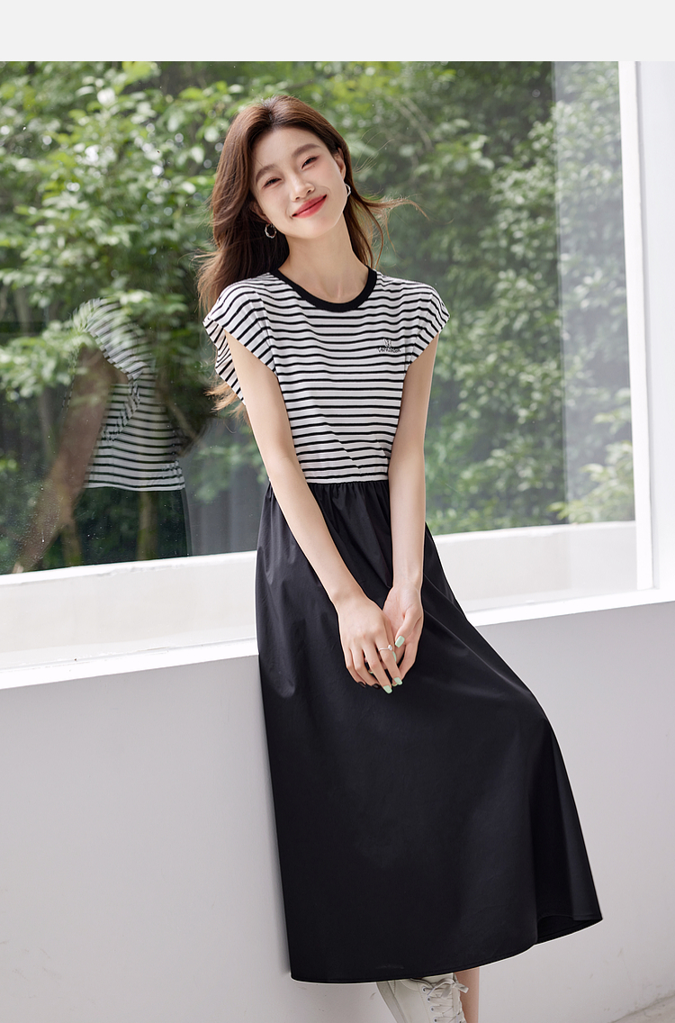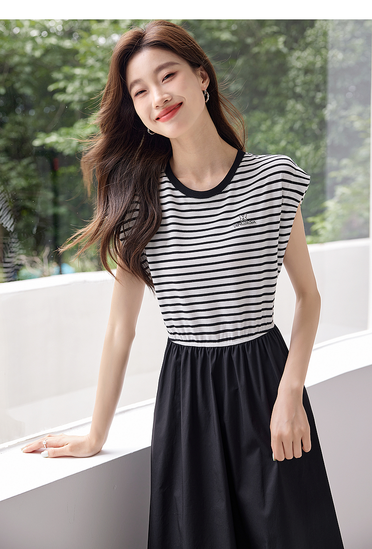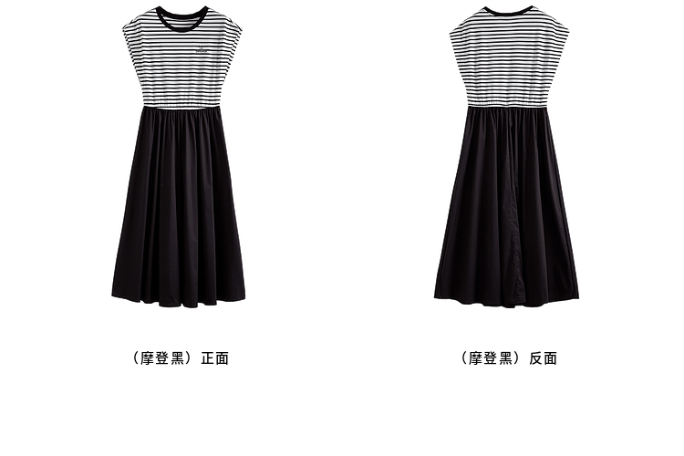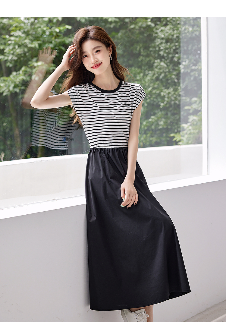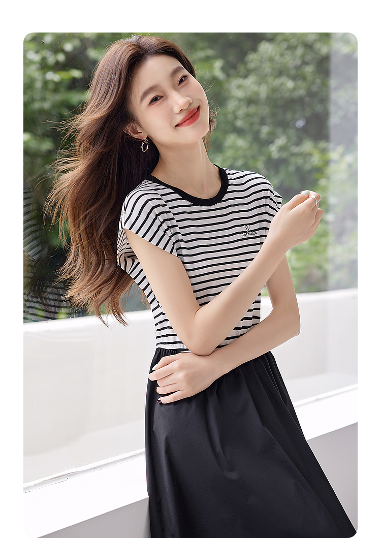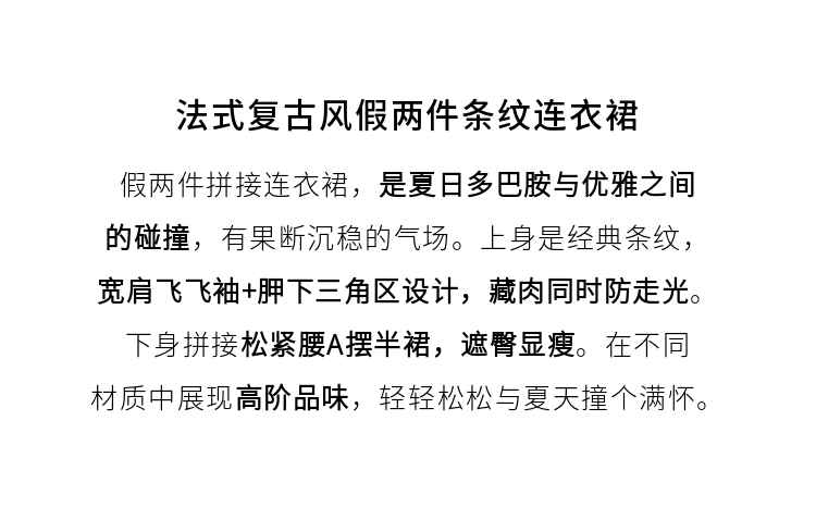 【五折购】熙世界2025夏新款法式假两件连衣裙收腰显瘦时尚条纹拼接长裙子