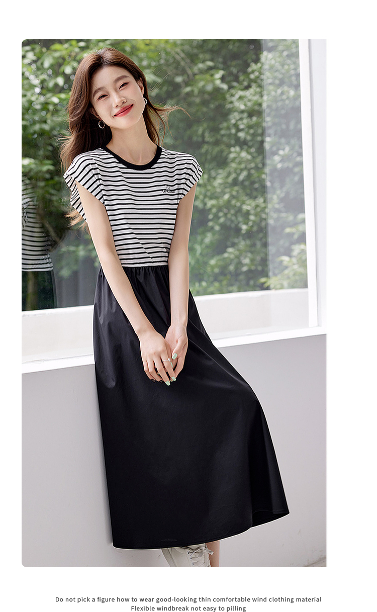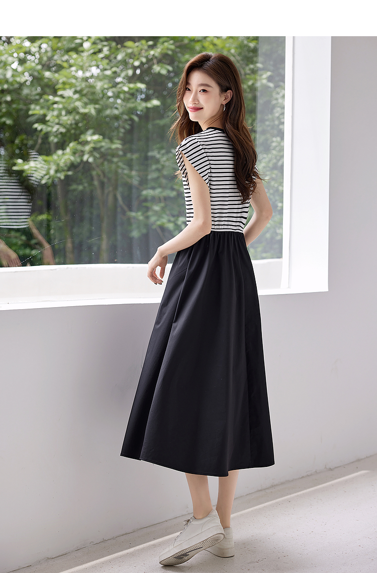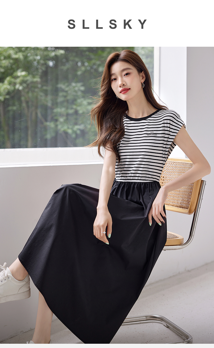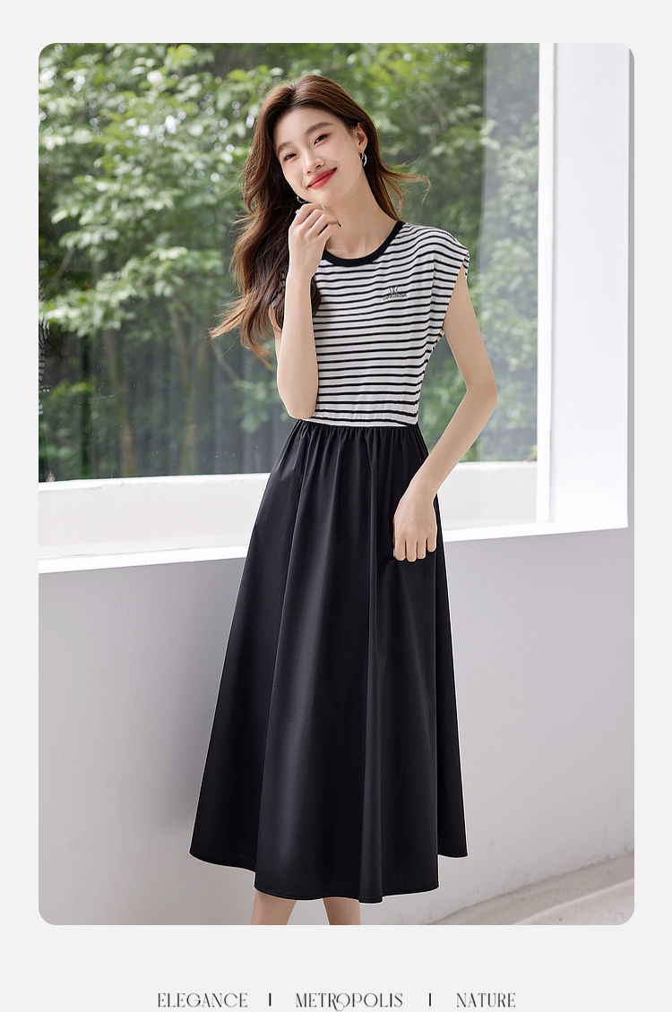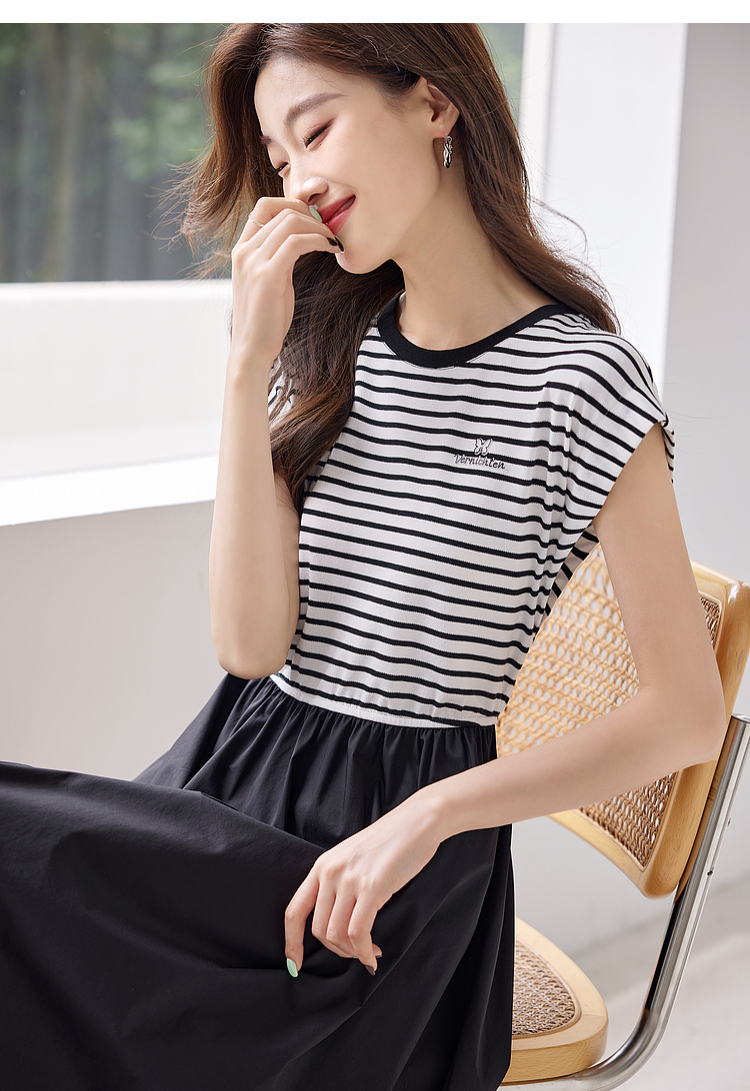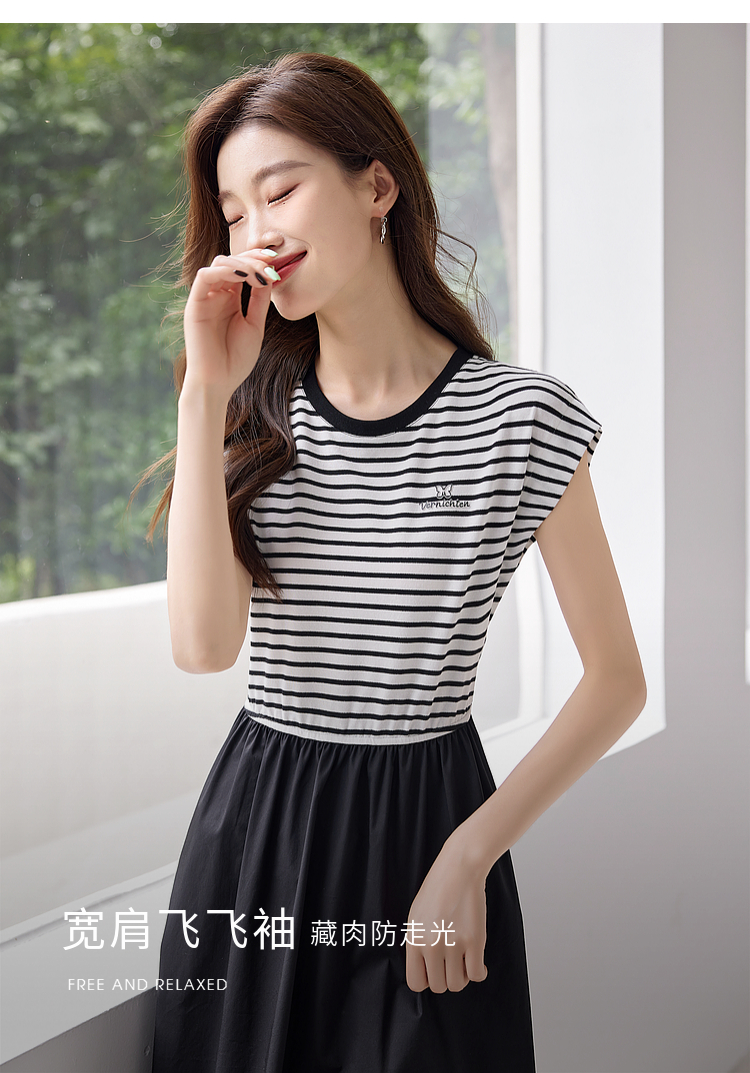 【五折购】熙世界2025夏新款法式假两件连衣裙收腰显瘦时尚条纹拼接长裙子