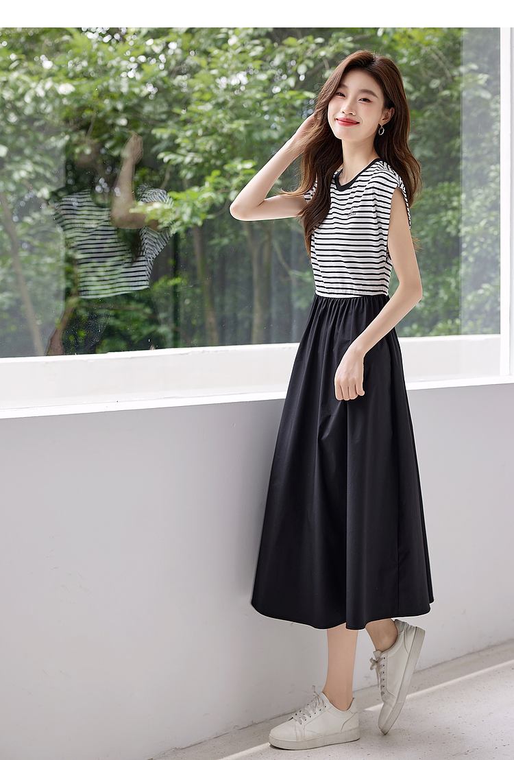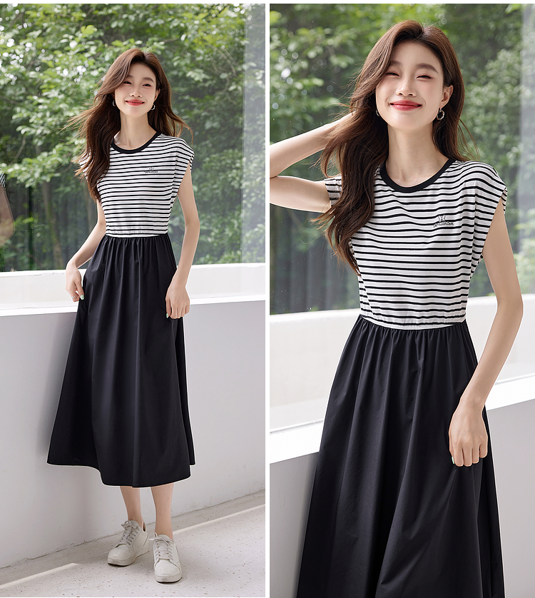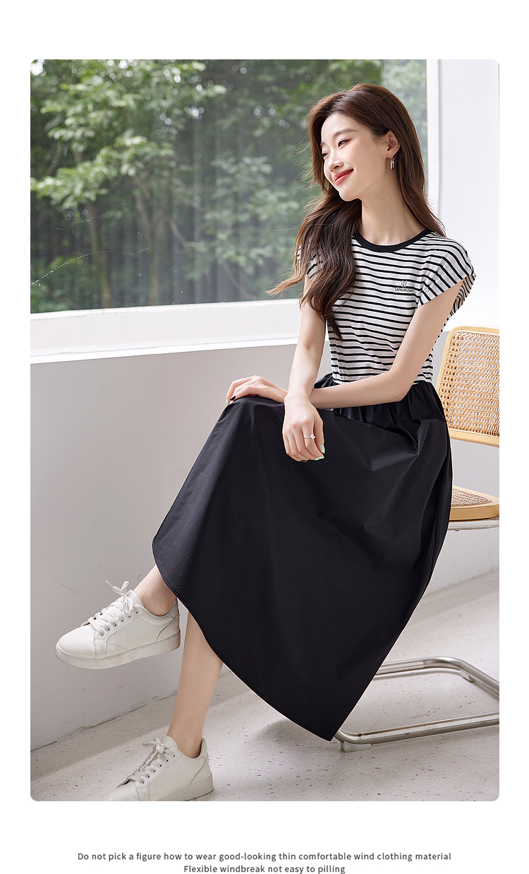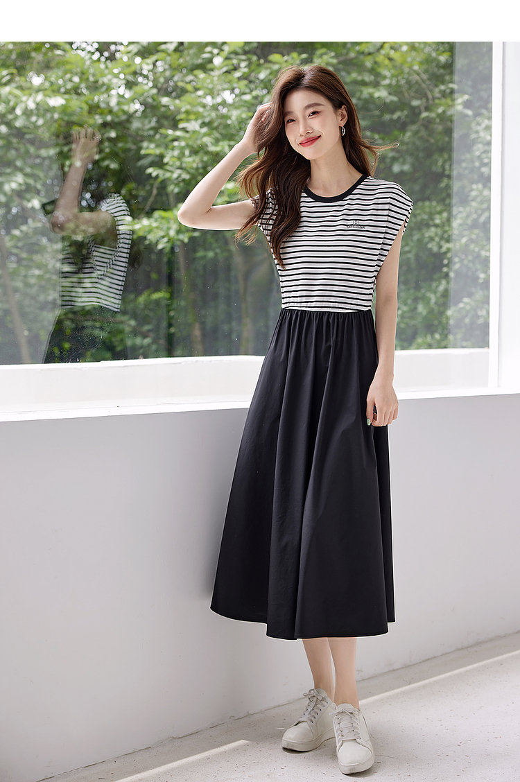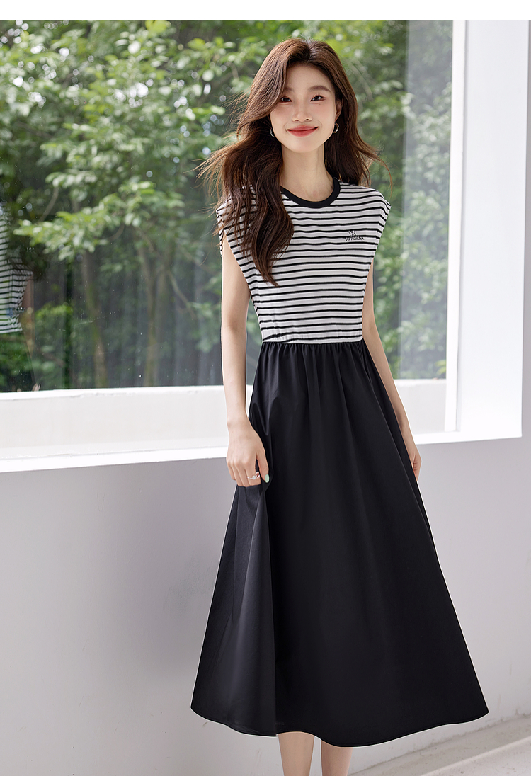 【五折购】熙世界2025夏新款法式假两件连衣裙收腰显瘦时尚条纹拼接长裙子
