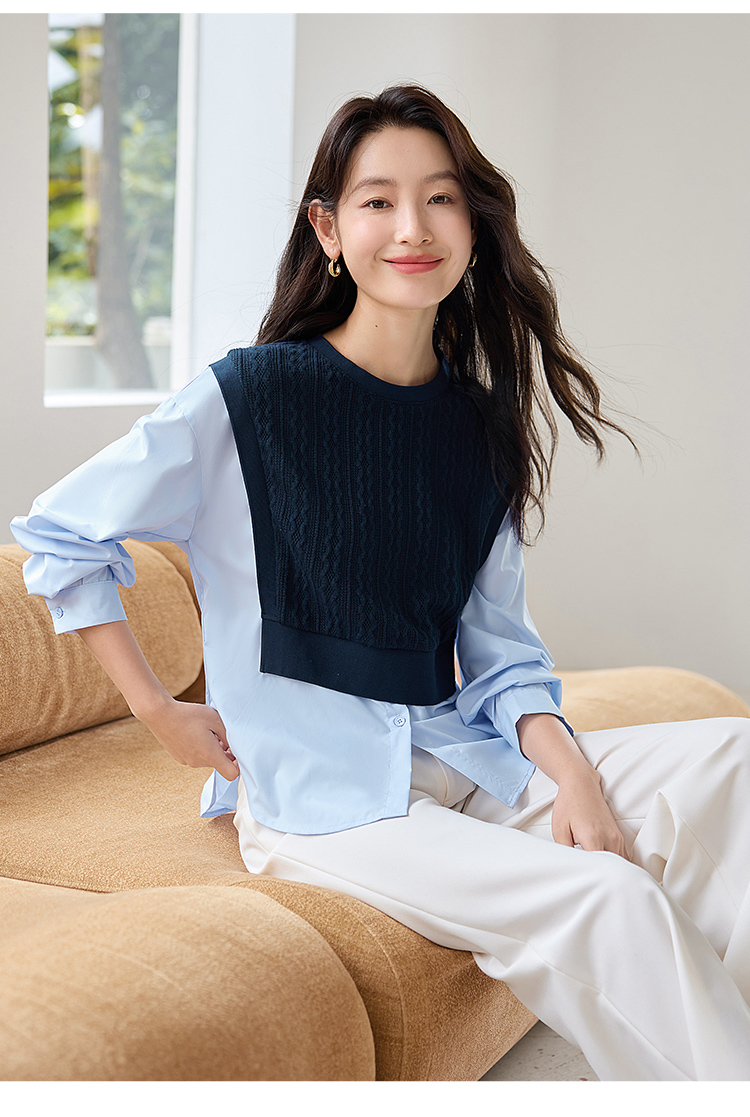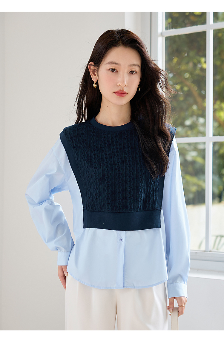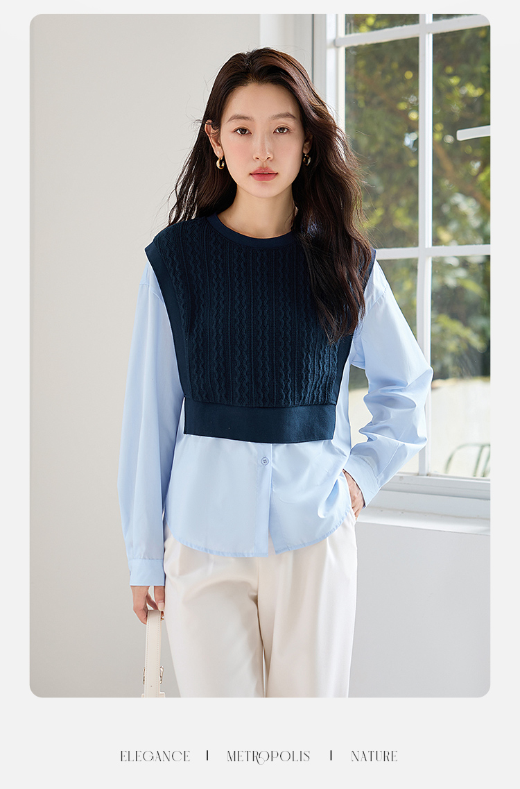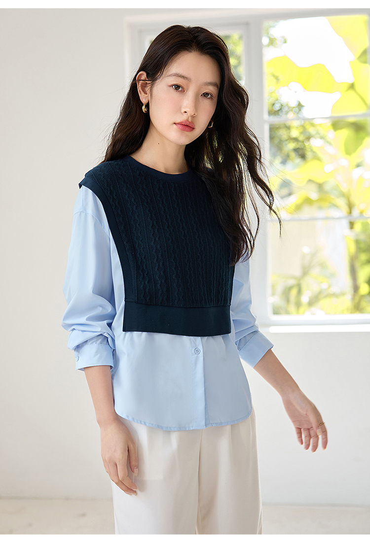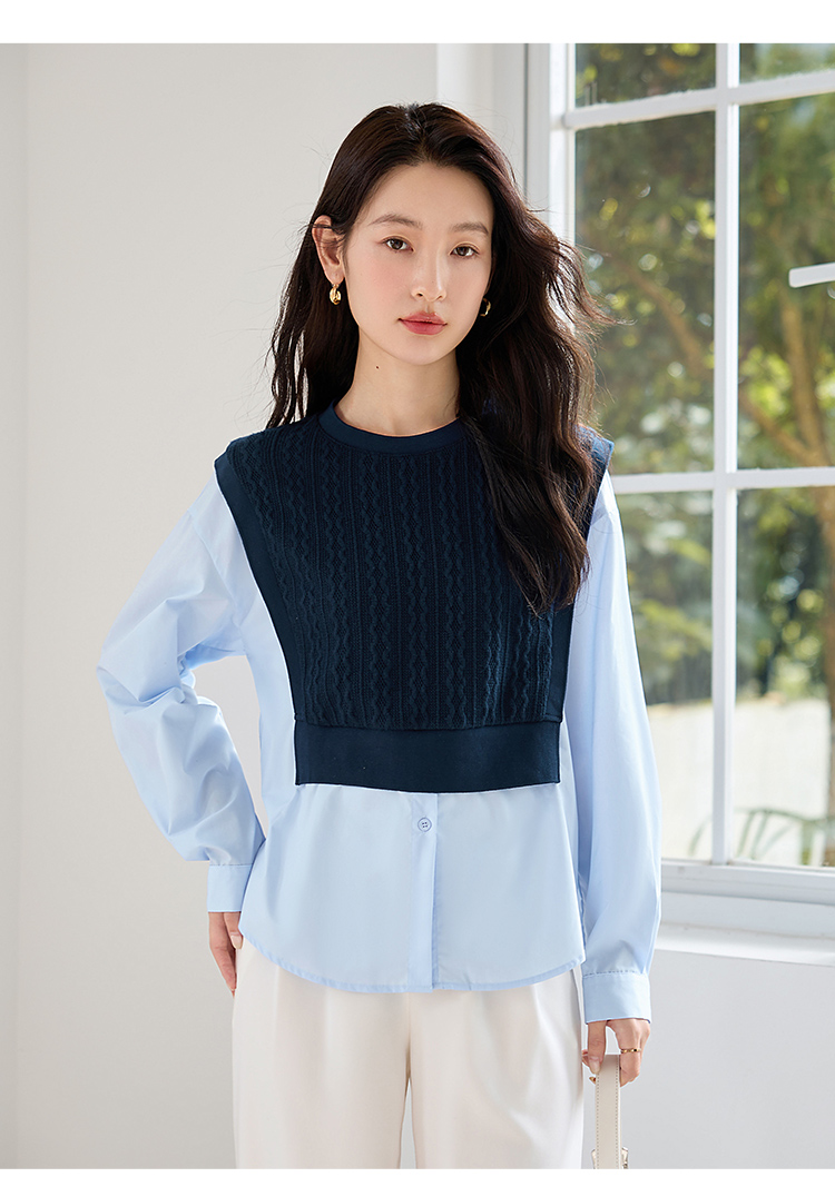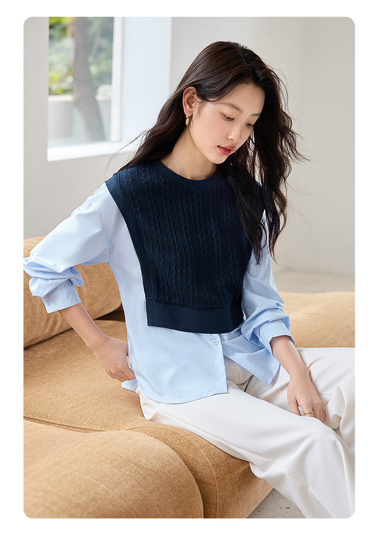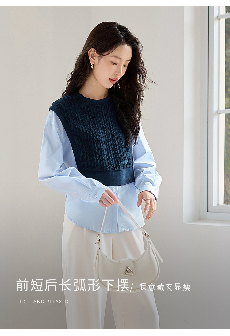 【年终特卖】熙世界2025秋季新款学院风针织上衣拼接衬衫气质显瘦假两件卫衣