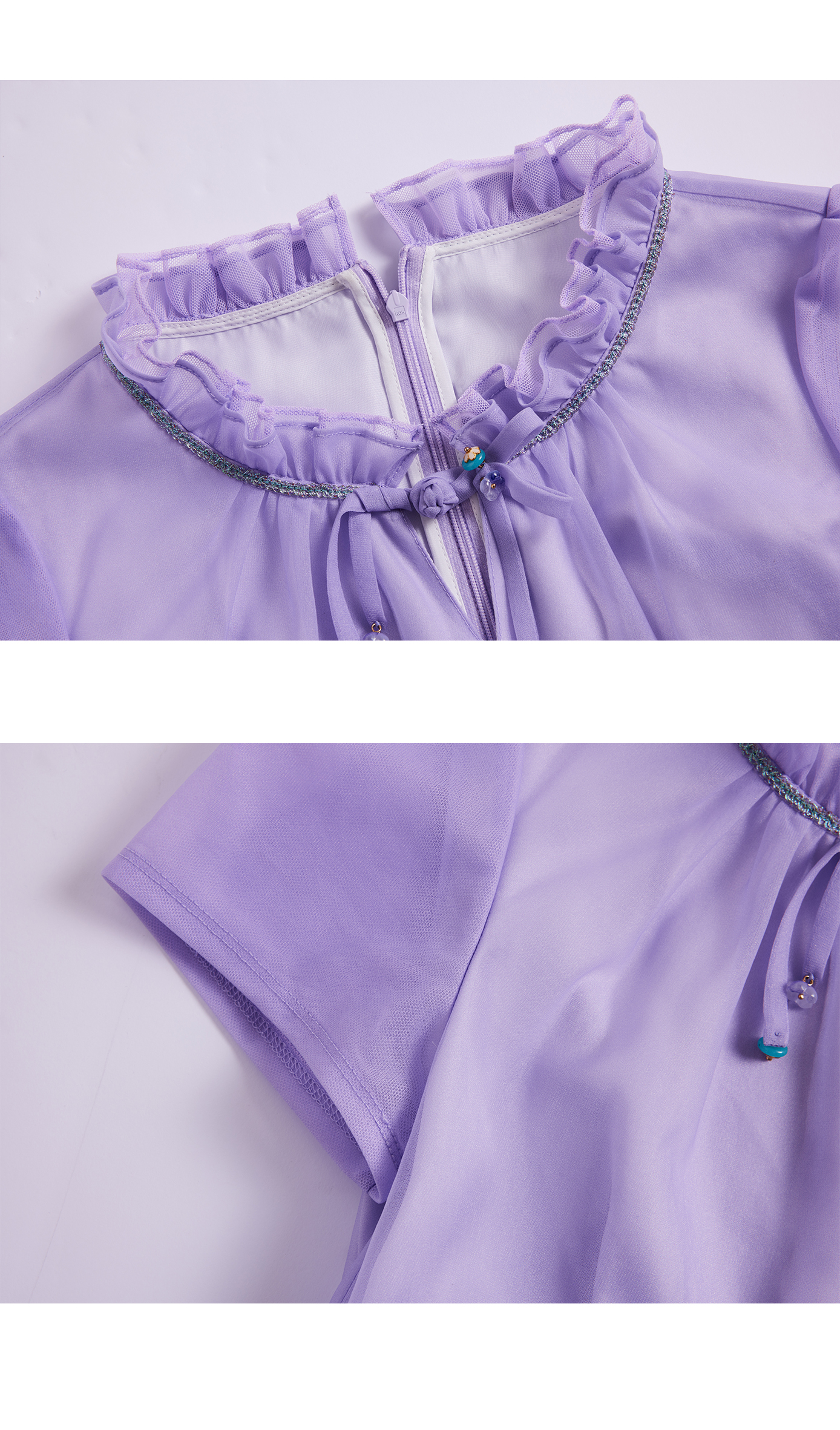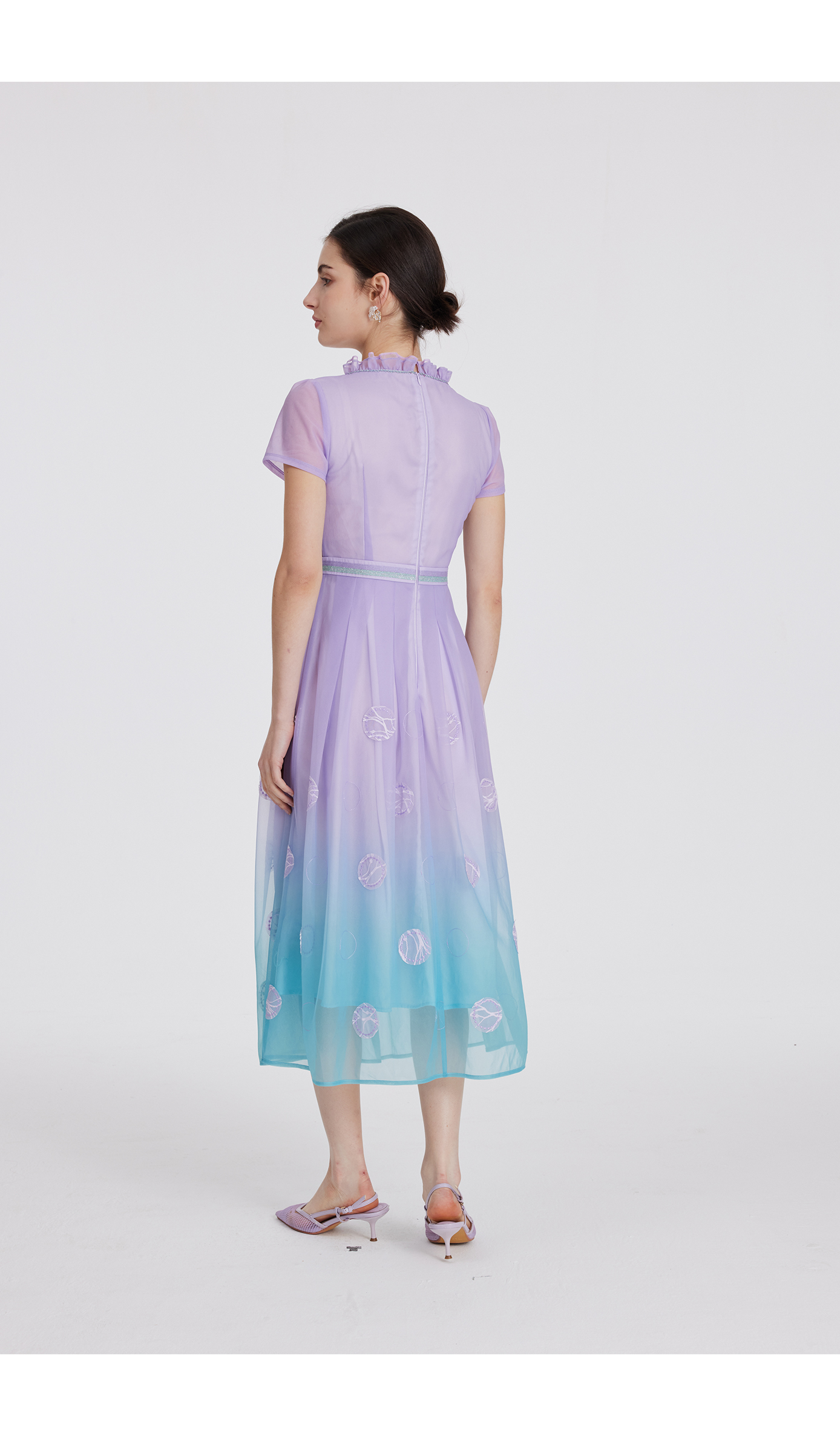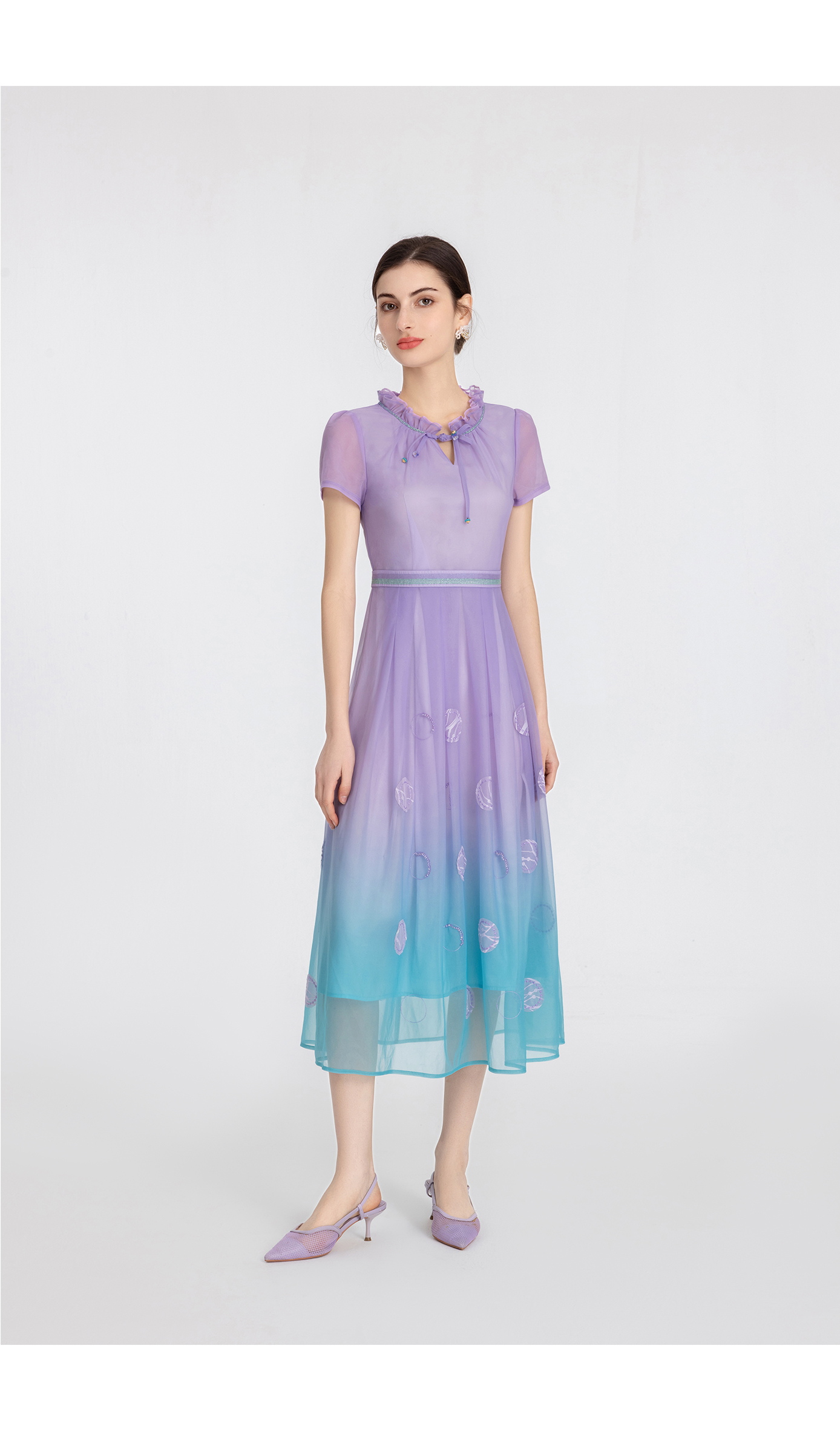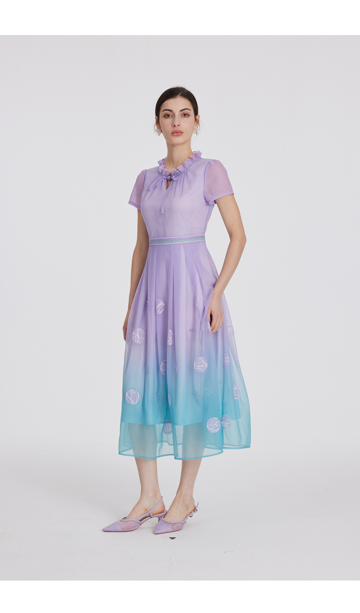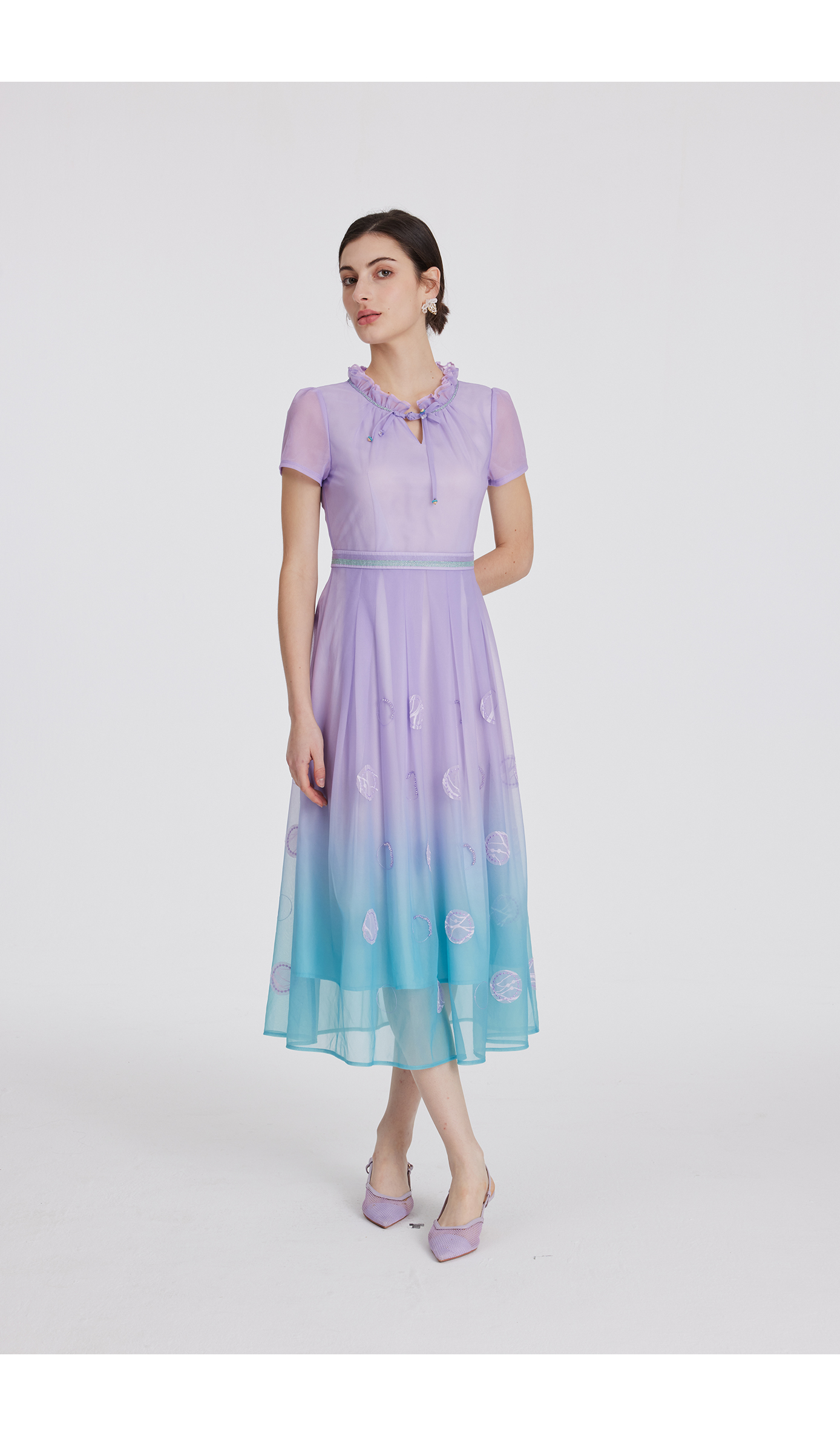 司歌刺绣印花连衣裙圆领短袖收腰优雅端庄A891054X